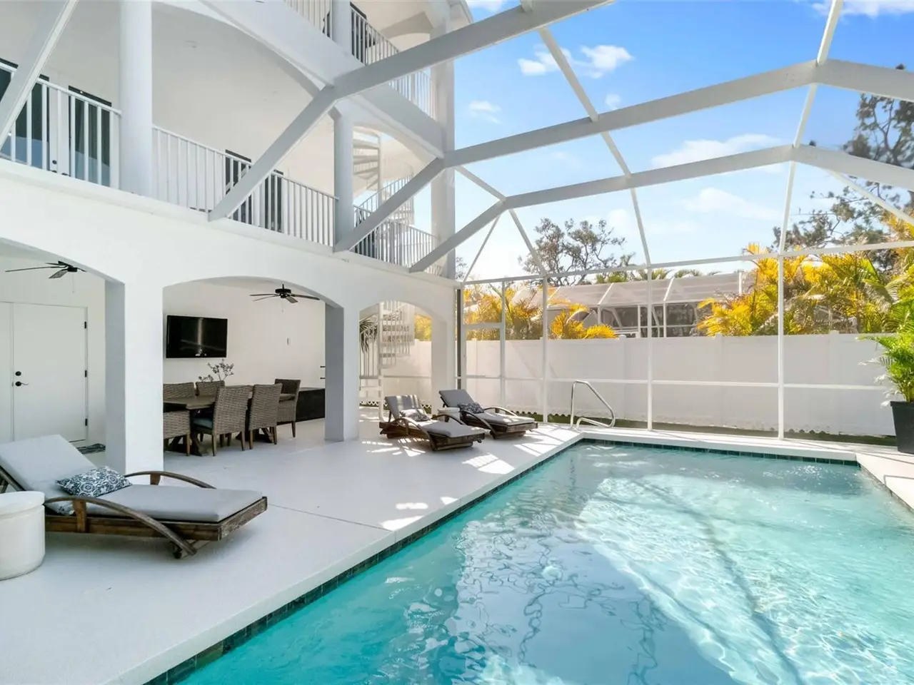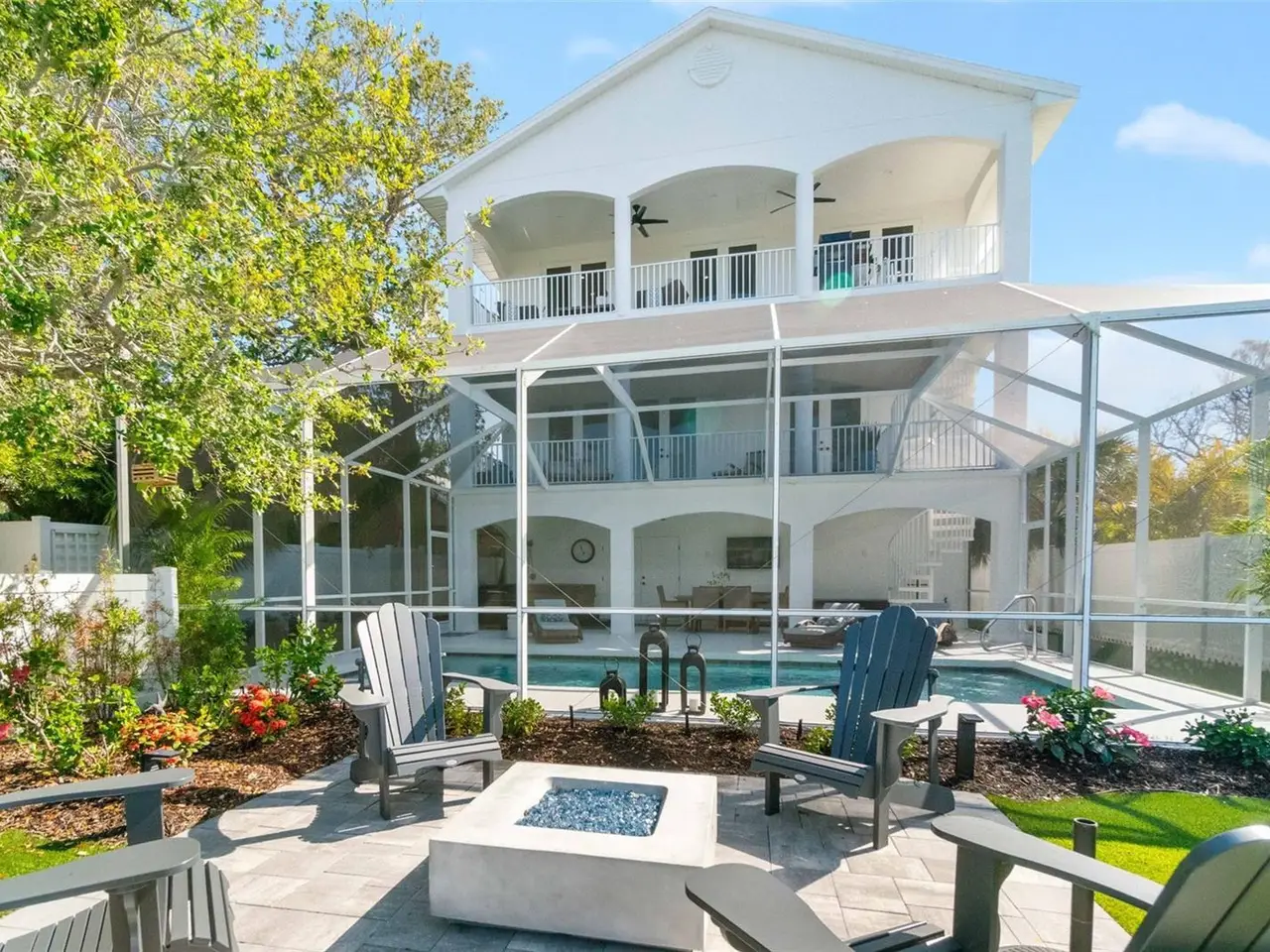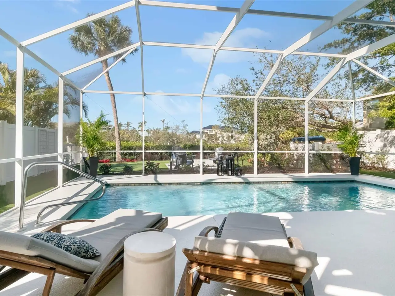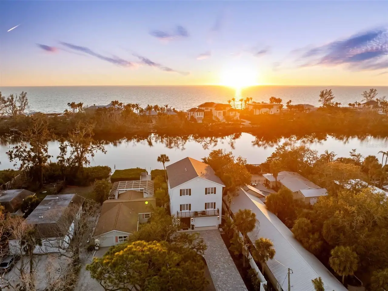 Exceptional waterfront living can be yours at this durable, block construction three-story single-family home set alongside the picturesque Heron Lagoon on Siesta Key. This home is completely move in ready after an extensive, luxury renovation. An attractive, paver drive flanked with lush landscaping offers ample parking while the four-car tandem garage is outfitted for the car enthusiast with a small non-conforming space and access to the backyard pool and spa. The first floor over parking features two en-suite bedrooms with large closets and the smart placement of the laundry closet. Stretching across the entire width of the home with a private office and relaxing, private terrace is the primary en-suite. The perfect place to rest, recharge and pamper with stunning views and a unique primary bath featuring dual vanities, soaking tub, walk-in shower and state of the art design. Ascend to the top floor by stairs or elevator to find an additional bedroom and full bath as well as the open concept living space offering three sets of hurricane rated French doors, allowing loads of natural light and panoramic views of the lagoon. The chef-inspired kitchen is equipped with a Viking stove & Frigidaire refrigerator (2021), custom cabinetry, glimmering quartz counters with an ocean inspired backsplash, and an additional built-in area for your private collection of spirits or prized glass ware. The gas fireplace in the dining area provides warmth and intimacy as you host your family and friends to enjoy your creative cuisine and offer a nightcap on the third-floor terrace overlooking the backyard designed for entertainment. A spiral staircase is your invitation to soak up the warm Florida sunshine in the refreshing pool (new mechanics 2024), challenge your guests to a putting contest on the integrated putting green, float peacefully alongside the mangroves from the kayak or paddleboard launch (new 2022) or drop a fishing line in the lagoon for the fresh catch of the day. On mild evenings, star gaze from the cozy hot tub (new 2024) or share stories of your Siesta Key adventures around the gas fire pit. Take a short stroll and find yourself at Turtle Beach Park, where beach access, grills, pavilions, a playground and much more can be your destination for hosting a gathering or a quiet day on the beach to yourself. With western views and exquisite attention to detail, this exceptional Siesta Key family retreat offers a rare opportunity to own a piece of paradise. A list of additional upgrades and details of renovation dates available upon request