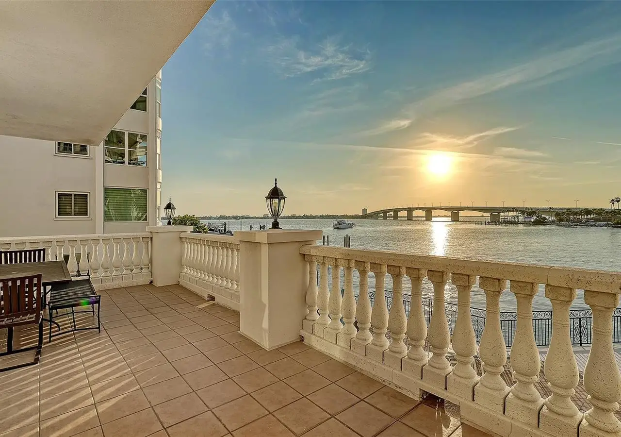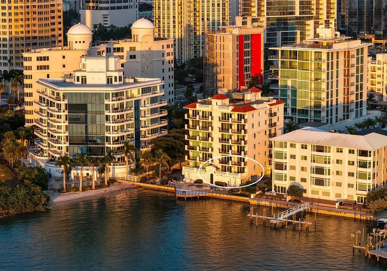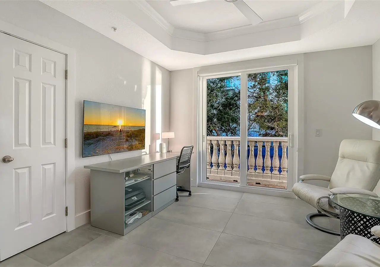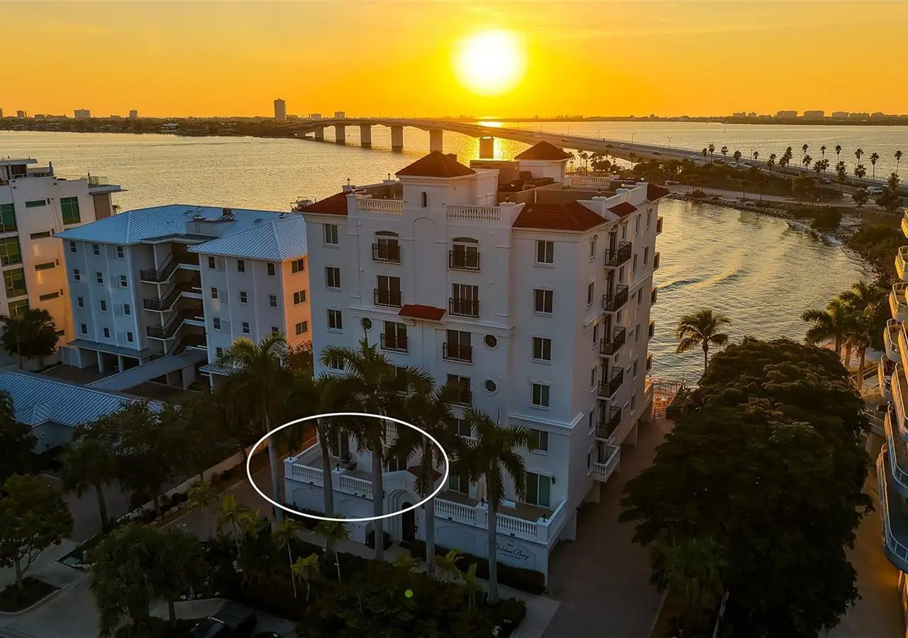 Direct waterfront on Golden Gate Point downtown Sarasota! Golden Bay is a boutique condominium building of only 10 units. You will enjoy the intimacy and peaceful setting of this remodeled residence overlooking Sarasota Bay and Ringling Bridge. An elevator will bring you directly to your private foyer. The sunsets are spectacular! This second-floor corner unit features high ceilings, 3 bedrooms, an office/4th brm, 3 full baths and benefits of two large terraces (27' x 9'). The West sunsets terrace is accessible from the living room and the primary bedroom, and the East sunrises terrace is accessible from the two guest bedrooms. The current owners replaced all the windows and patio doors, updated the entire unit with a 4x2 grey porcelain tiles, redid all 3 bathrooms, and installed custom blinds on all windows. The gourmet kitchen is equipped with stainless-steel appliances including a Sub Zero refrigerator, white cabinetry with lots of storage, beautiful new quartz countertops, and two wine refrigerators. The spacious primary suite, with access to the terrace that overlooks the bay, provides two walk-in closets, an elegant bathroom with two sinks, a walk-in shower, and a comfortable sitting area (plumbing in place for a tub if desired). Both guest bedrooms are en-suite.The large office has a slider door that opens to a Romeo & Juliette balcony, has a double closet and can be used as a 4th bedroom. Well thought laundry room with cabinetry, a sink, and stackable washer/dryer will facilitate your task. There is an additional stairway directly from your unit that goes to your private sizeable 2 car garage 19’ x 25’ and the pool deck where you can grill and enjoy the heated pool and day dock. On the desired Golden Gate Point, this location is a short walk to restaurants, theatres, shops, and minutes to famous St. Armands Circle and sandy Lido Beach.