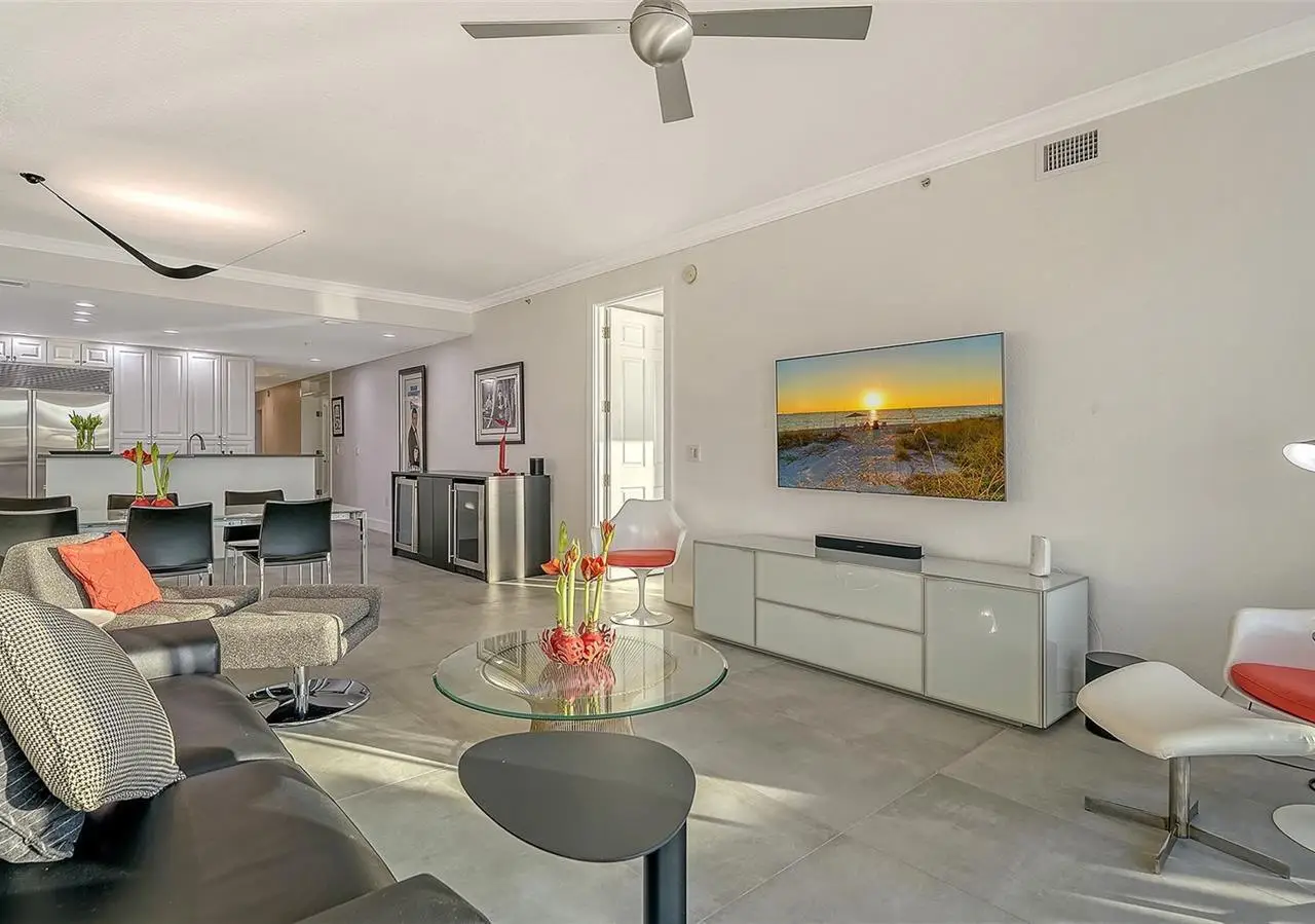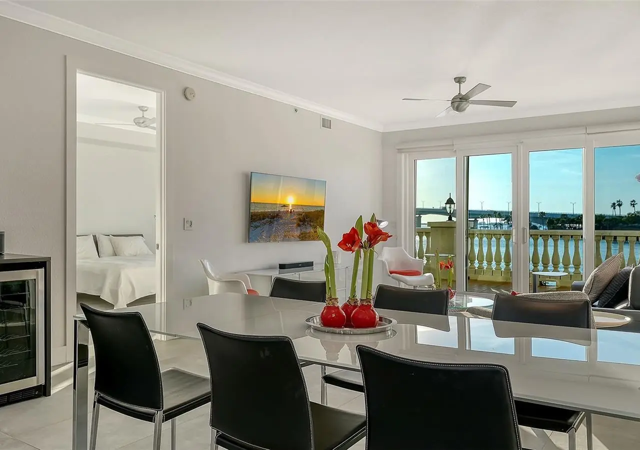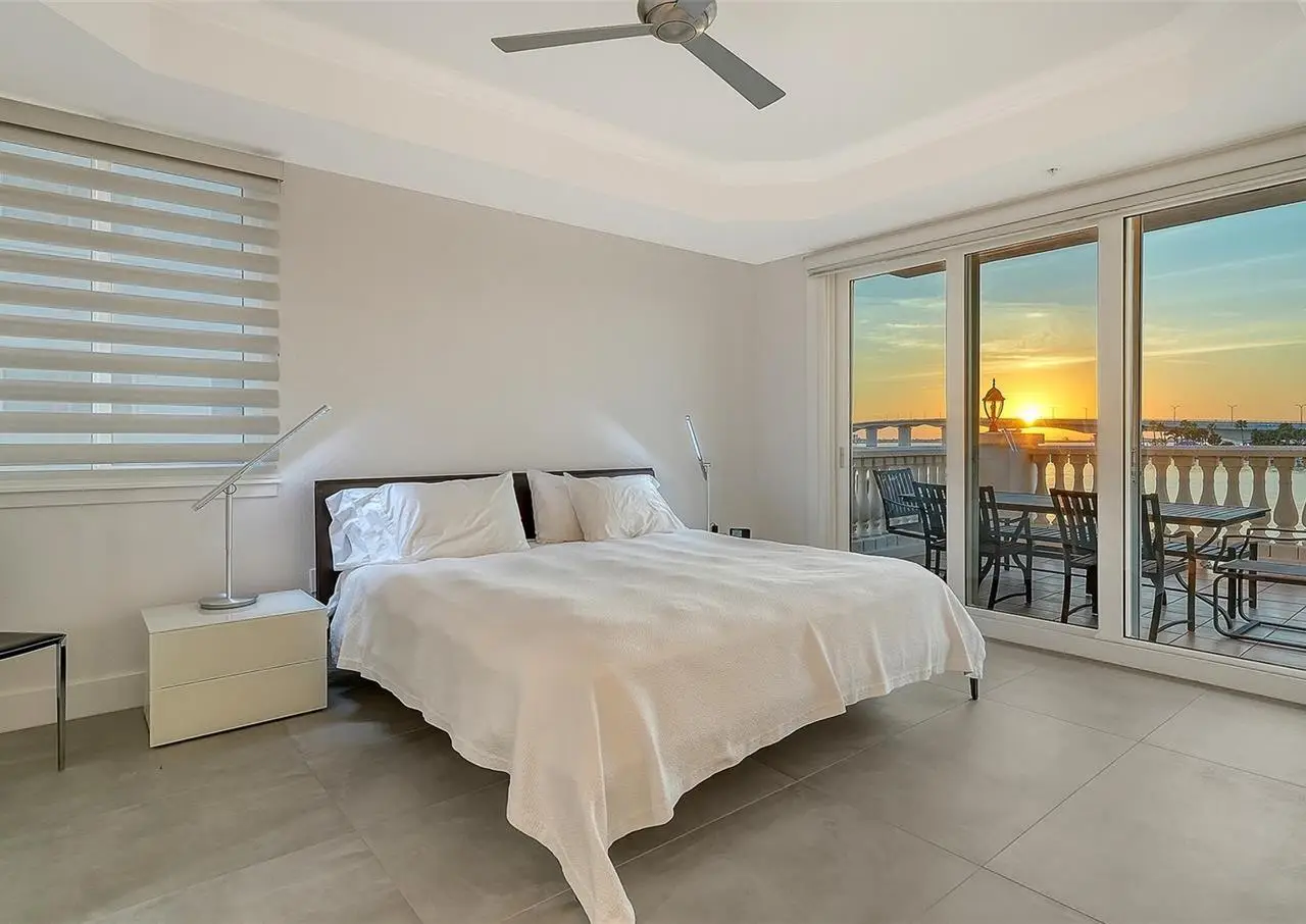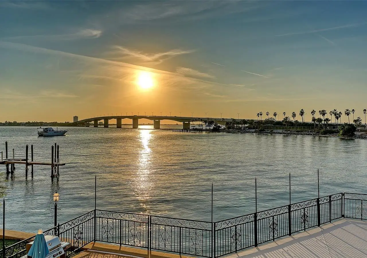 Direct waterfront on Golden Gate Point downtown Sarasota! Golden Bay is a boutique condominium building of only 10 units. You will enjoy the intimacy and peaceful setting of this remodeled residence overlooking Sarasota Bay and Ringling Bridge. An elevator will bring you directly to your private foyer. The sunsets are spectacular! This second-floor corner unit features high ceilings, 3 bedrooms, an office/4th brm, 3 full baths and benefits of two large terraces (27' x 9'). The West sunsets terrace is accessible from the living room and the primary bedroom, and the East sunrises terrace is accessible from the two guest bedrooms. The current owners replaced all the windows and patio doors, updated the entire unit with a 4x2 grey porcelain tiles, redid all 3 bathrooms, and installed custom blinds on all windows. The gourmet kitchen is equipped with stainless-steel appliances including a Sub Zero refrigerator, white cabinetry with lots of storage, beautiful new quartz countertops, and two wine refrigerators. The spacious primary suite, with access to the terrace that overlooks the bay, provides two walk-in closets, an elegant bathroom with two sinks, a walk-in shower, and a comfortable sitting area (plumbing in place for a tub if desired). Both guest bedrooms are en-suite.The large office has a slider door that opens to a Romeo & Juliette balcony, has a double closet and can be used as a 4th bedroom. Well thought laundry room with cabinetry, a sink, and stackable washer/dryer will facilitate your task. There is an additional stairway directly from your unit that goes to your private sizeable 2 car garage 19’ x 25’ and the pool deck where you can grill and enjoy the heated pool and day dock. On the desired Golden Gate Point, this location is a short walk to restaurants, theatres, shops, and minutes to famous St. Armands Circle and sandy Lido Beach.