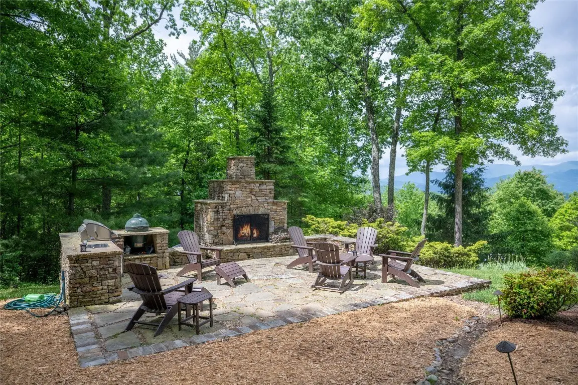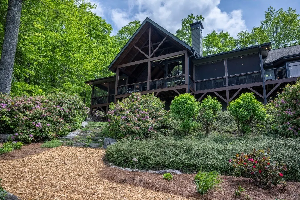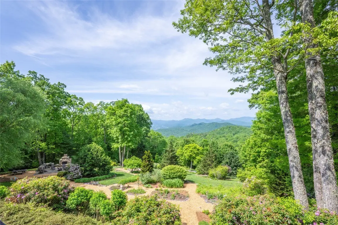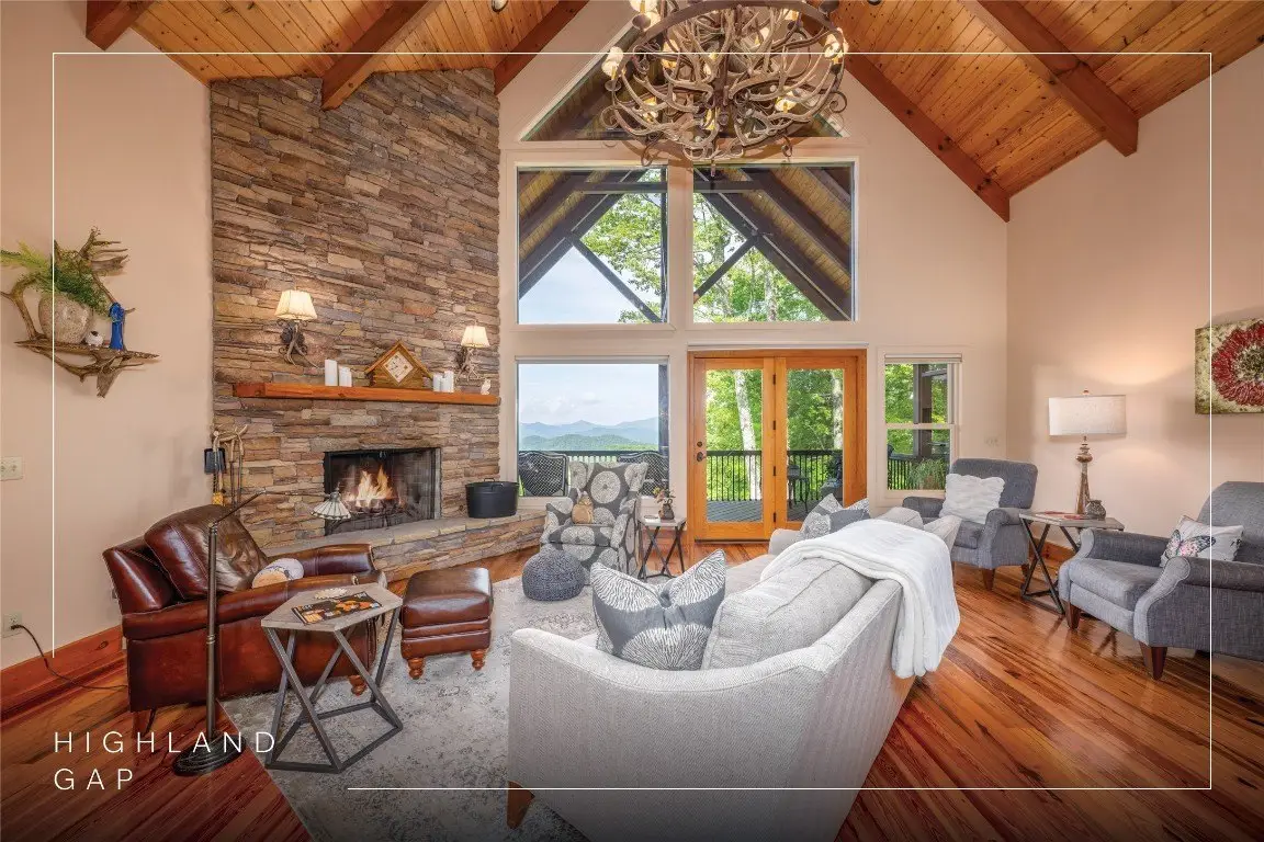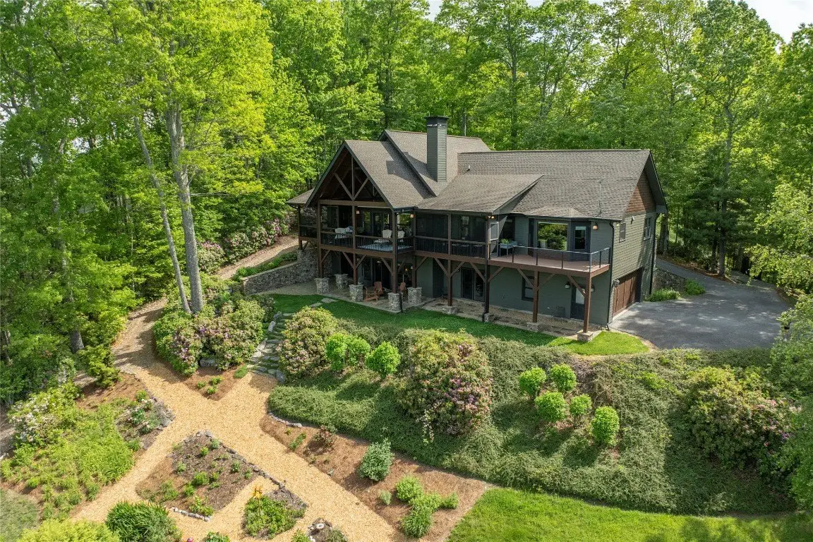 Enjoy breathtaking long-range mountain views and exceptional artistry in this meticulously designed mountain home located on a quiet private road in Highland Gap. Surrounded by lush landscaping and manicured gardens, this stunning retreat blends natural beauty with luxurious living. The main level is designed for entertaining, starting with an expansive chef's kitchen that boasts double ovens, a pot filler, a warming drawer, a mixer lift, and custom pull-out cabinet features. The kitchen also includes a wet bar with a wine cooler, a coffee bar, a cozy sitting area with a gas fireplace, and a large picture window that frames the incredible mountain views. Adjacent to the kitchen, the dining room provides ample space for gatherings and leads into the living room, which features a soaring wood-beamed ceiling, a stone wood-burning fireplace, and an authentic antler chandelier. A large carpeted loft overlooks the living space, adding additional versatility. The primary suite offers a private sanctuary with a gas fireplace, a painted wood ceiling, built-in closets, and a screened porch. The luxurious ensuite bathroom has a jetted tub, heated floors, a walk-in shower with a rain showerhead, and extra dual fixtures. An office with built-in bookcases and one additional full bathroom complete the main level. The lower level is designed for relaxation and entertaining, with a media room featuring coffered wood ceilings, a wet bar, and access to the terrace. This level also includes three bedrooms with painted wood ceilings and two full bathrooms. Two of the bedrooms open directly to the terrace, one of which offers ensuite privacy. A spacious two-and-a-half-car garage with a workshop space features custom hemlock garage doors. From the terrace, stone-lined paths lead to manicured perennial gardens, raised beds, and a stacked stone outdoor kitchen. From May through October, the gardens burst with color, and blueberry bushes add a seasonal charm. Stroll along the illuminated paths or relax in thoughtfully placed seating areas nestled among the blooms. Detailed artistry and refined design are evident, with arched doorways, solid alder wood doors, heart pine floors, and stained cypress ceilings on the screened porches. Additional highlights include a 400-foot-deep well with a 25-gallon-per-minute flow. Offered furnished, this remarkable home is a mountain retreat ready for immediate enjoyment.