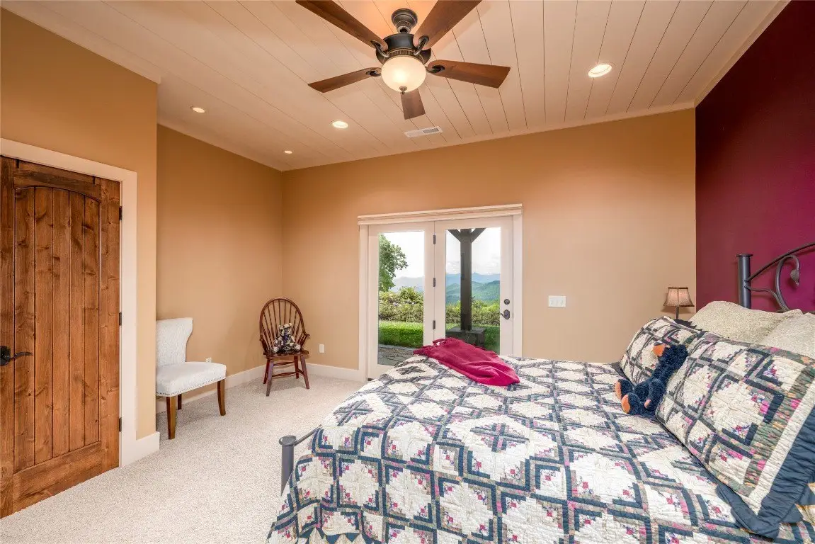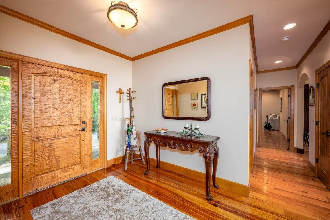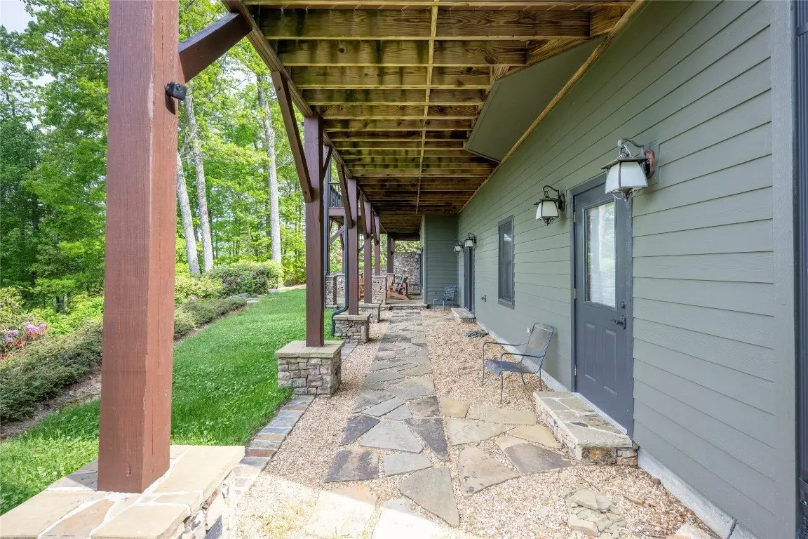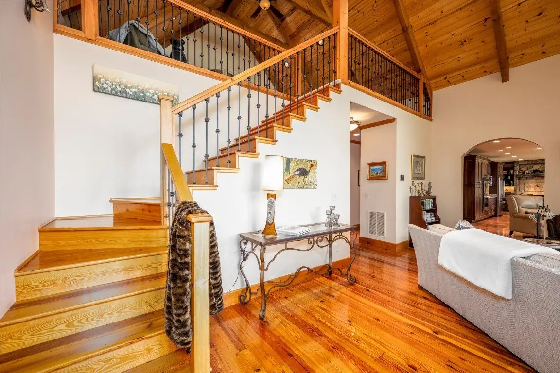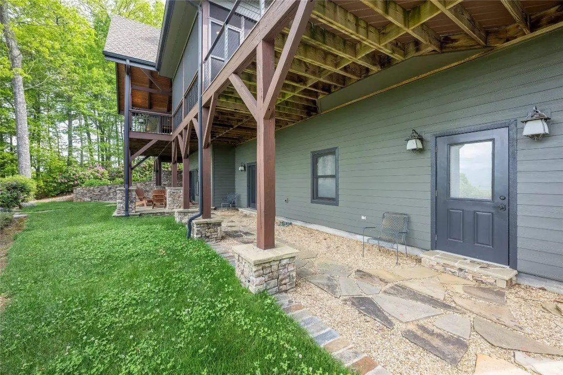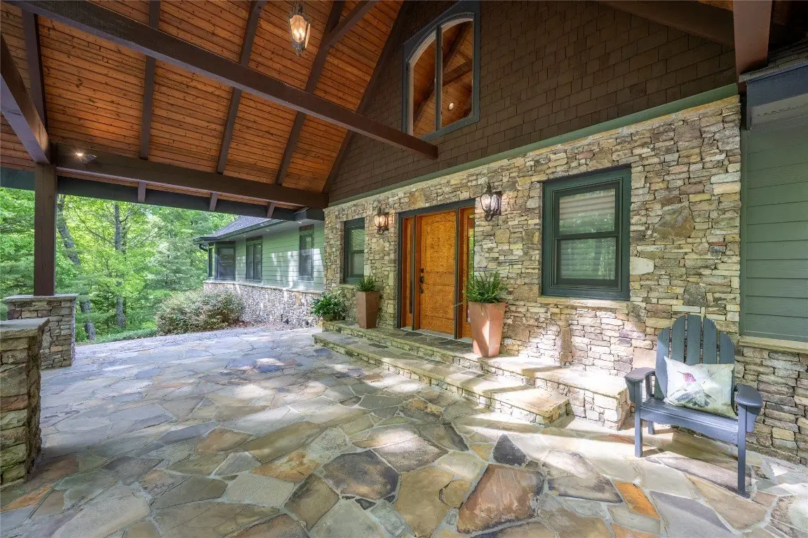 Enjoy breathtaking long-range mountain views and exceptional artistry in this meticulously designed mountain home located on a quiet private road in Highland Gap. Surrounded by lush landscaping and manicured gardens, this stunning retreat blends natural beauty with luxurious living. The main level is designed for entertaining, starting with an expansive chef's kitchen that boasts double ovens, a pot filler, a warming drawer, a mixer lift, and custom pull-out cabinet features. The kitchen also includes a wet bar with a wine cooler, a coffee bar, a cozy sitting area with a gas fireplace, and a large picture window that frames the incredible mountain views. Adjacent to the kitchen, the dining room provides ample space for gatherings and leads into the living room, which features a soaring wood-beamed ceiling, a stone wood-burning fireplace, and an authentic antler chandelier. A large carpeted loft overlooks the living space, adding additional versatility. The primary suite offers a private sanctuary with a gas fireplace, a painted wood ceiling, built-in closets, and a screened porch. The luxurious ensuite bathroom has a jetted tub, heated floors, a walk-in shower with a rain showerhead, and extra dual fixtures. An office with built-in bookcases and one additional full bathroom complete the main level. The lower level is designed for relaxation and entertaining, with a media room featuring coffered wood ceilings, a wet bar, and access to the terrace. This level also includes three bedrooms with painted wood ceilings and two full bathrooms. Two of the bedrooms open directly to the terrace, one of which offers ensuite privacy. A spacious two-and-a-half-car garage with a workshop space features custom hemlock garage doors. From the terrace, stone-lined paths lead to manicured perennial gardens, raised beds, and a stacked stone outdoor kitchen. From May through October, the gardens burst with color, and blueberry bushes add a seasonal charm. Stroll along the illuminated paths or relax in thoughtfully placed seating areas nestled among the blooms. Detailed artistry and refined design are evident, with arched doorways, solid alder wood doors, heart pine floors, and stained cypress ceilings on the screened porches. Additional highlights include a 400-foot-deep well with a 25-gallon-per-minute flow. Offered furnished, this remarkable home is a mountain retreat ready for immediate enjoyment.
