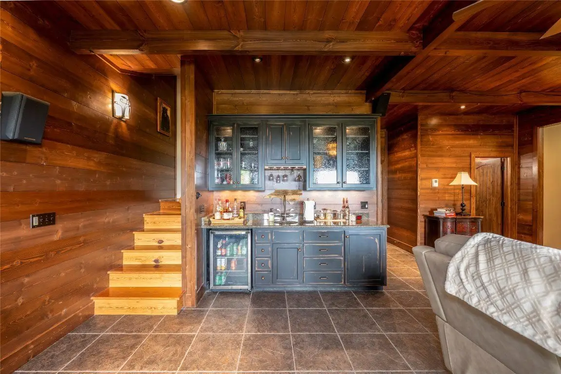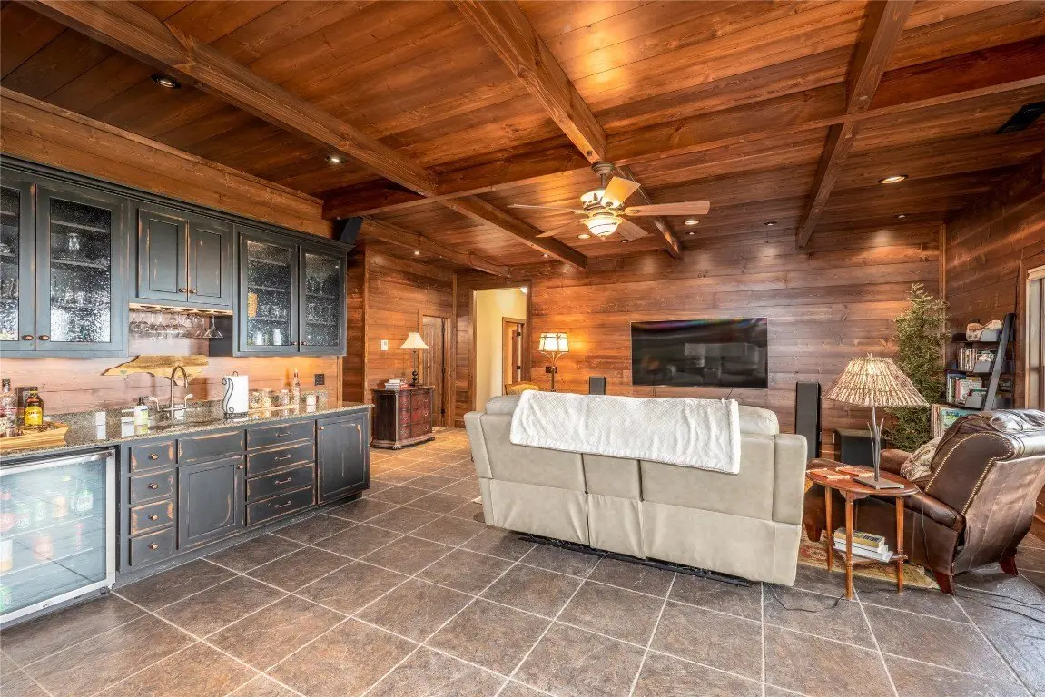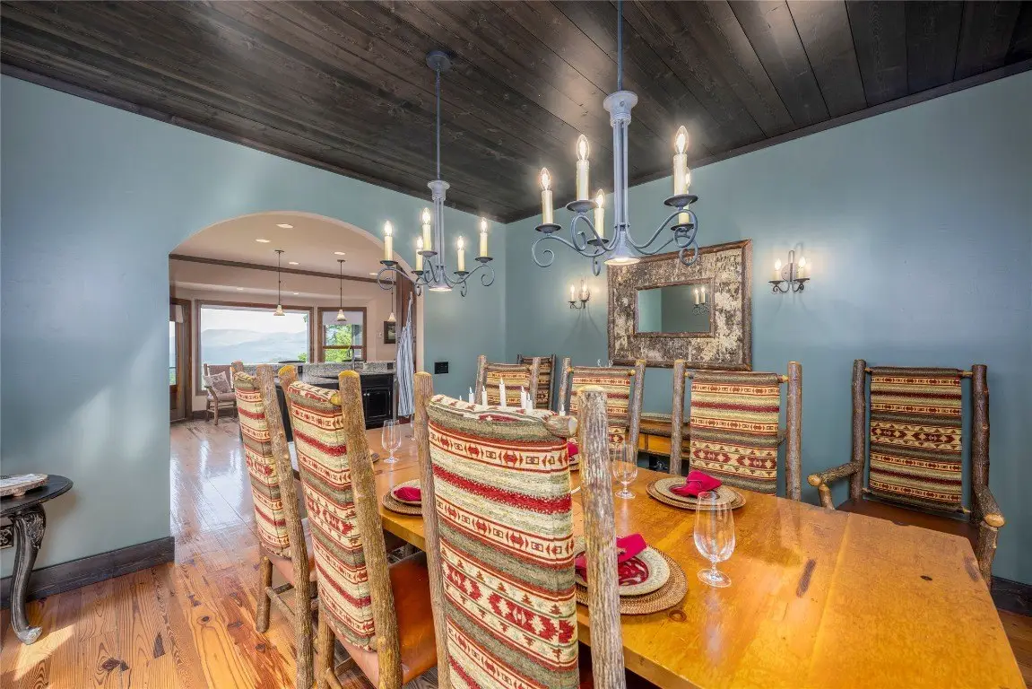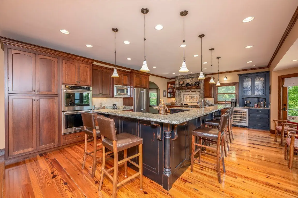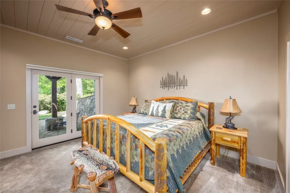 Enjoy breathtaking long-range mountain views and exceptional artistry in this meticulously designed mountain home located on a quiet private road in Highland Gap. Surrounded by lush landscaping and manicured gardens, this stunning retreat blends natural beauty with luxurious living. The main level is designed for entertaining, starting with an expansive chef's kitchen that boasts double ovens, a pot filler, a warming drawer, a mixer lift, and custom pull-out cabinet features. The kitchen also includes a wet bar with a wine cooler, a coffee bar, a cozy sitting area with a gas fireplace, and a large picture window that frames the incredible mountain views. Adjacent to the kitchen, the dining room provides ample space for gatherings and leads into the living room, which features a soaring wood-beamed ceiling, a stone wood-burning fireplace, and an authentic antler chandelier. A large carpeted loft overlooks the living space, adding additional versatility. The primary suite offers a private sanctuary with a gas fireplace, a painted wood ceiling, built-in closets, and a screened porch. The luxurious ensuite bathroom has a jetted tub, heated floors, a walk-in shower with a rain showerhead, and extra dual fixtures. An office with built-in bookcases and one additional full bathroom complete the main level. The lower level is designed for relaxation and entertaining, with a media room featuring coffered wood ceilings, a wet bar, and access to the terrace. This level also includes three bedrooms with painted wood ceilings and two full bathrooms. Two of the bedrooms open directly to the terrace, one of which offers ensuite privacy. A spacious two-and-a-half-car garage with a workshop space features custom hemlock garage doors. From the terrace, stone-lined paths lead to manicured perennial gardens, raised beds, and a stacked stone outdoor kitchen. From May through October, the gardens burst with color, and blueberry bushes add a seasonal charm. Stroll along the illuminated paths or relax in thoughtfully placed seating areas nestled among the blooms. Detailed artistry and refined design are evident, with arched doorways, solid alder wood doors, heart pine floors, and stained cypress ceilings on the screened porches. Additional highlights include a 400-foot-deep well with a 25-gallon-per-minute flow. Offered furnished, this remarkable home is a mountain retreat ready for immediate enjoyment.