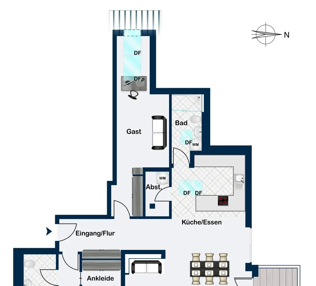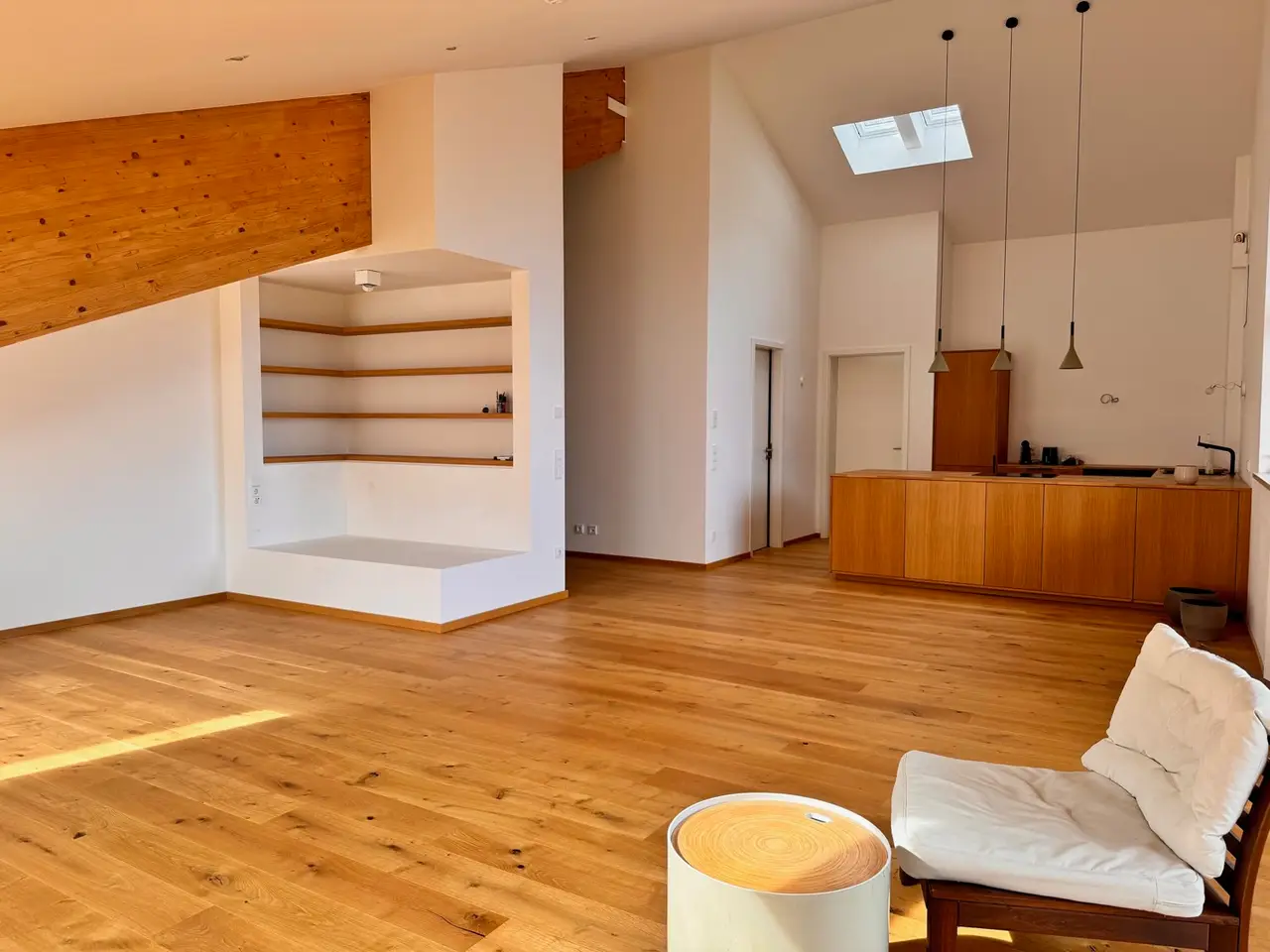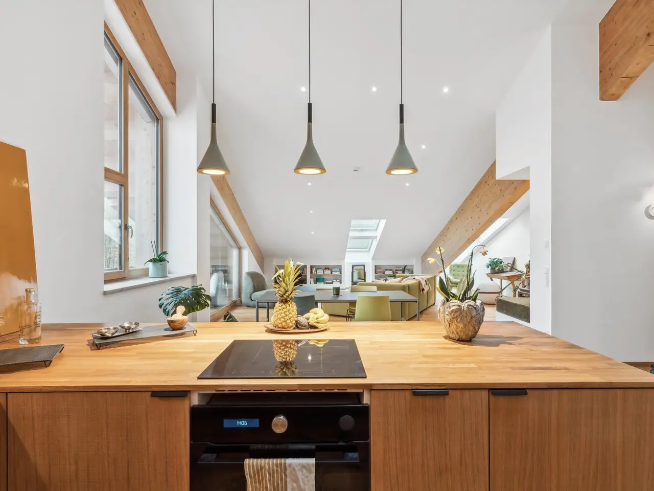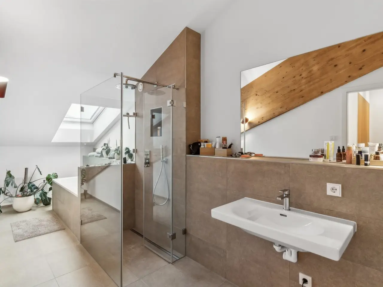 This very attractive top floor apartment is located in a modern apartment building and impresses with its upscale furnishings and generous living space of approx. 136.7 m².The property is heated by the environmentally friendly heating technology of a combined heat and power unit and offers all the comforts of an apartment in mint condition. The apartment has a total of three rooms, including two bedrooms and a spacious living room with a cozy retreat that offers open access to a large balcony. These generously proportioned rooms have been thoughtfully designed and offer a pleasant living atmosphere. The large balcony invites you to spend relaxing hours and is perfect for enjoying the sun. The two bathrooms in the apartment meet the highest standards. One of the bathrooms is equipped with a bathtub and shower, while the other has a shower and space for your washing machine. A special highlight is the opportunity to watch the open sky from the bathtub - a relaxing experience after a long day. The high-quality fittings and tasteful design underline the upscale furnishings of the apartment. The kitchen is open-plan and offers plenty of space next to the dining area. Modern electrical appliances and ample work surfaces make preparing meals a pleasure. The large window fronts not only allow plenty of daylight into the rooms, but also offer a pleasant view and access to the balcony. The apartment comes with two underground parking spaces, which are included in the purchase price. These offer convenient protection and safeguard the value of your vehicle. There is also ample parking space for visitors. A separate cellar room provides additional storage space and organizes the storage of items not needed on a daily basis. For cyclists, there is a separate bicycle room at the house. With its modern architecture and carefully designed outdoor area, the residential complex offers an appealing environment. Thoughtful details, such as skylights, ensure optimal lighting and underline the exclusive character of the apartment. This property not only offers a home, but also a functional room layout that provides singles, couples and small families with the best conditions for a comfortable living experience. Feel free to contact us for more information or to arrange a personal viewing appointment. Take the opportunity to see the benefits of this attractive top-floor apartment for yourself.