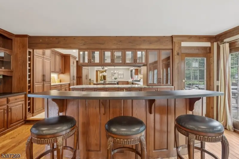 This exceptional 5-bedroom, 5.1-bath estate is a rare find, blending architectural interest with inspired design and functionality. Nestled on a quiet cul-de-sac in one of Scotch Plains' most desirable neighborhoods, it sits on 1.34 park-like acres with amenities for entertaining and everyday living. A striking stone exterior opens to expansive rooms, hardwood floors, five fireplaces, and a dramatic two-story living room with a spiral staircase to a wrap-around library. The chef's kitchen, renovated in 2019, features a 60" Lacanche range imported from France, dual Sub-Zero refrigerators, two dishwashers, and custom cherry cabinetry. The luxurious primary suite offers dual walk-in dressing closets, a spacious sitting area retreat with fireplace, and a private spiral staircase to a loft, creating a true spa-like escape. Multiple formal and informal living spaces make gathering easy. The third floor and finished lower level provide additional retreats, including two bedrooms, a full kitchen, wet bar, full bathroom, entertainment areas, game rooms, exercise room, and separate garage entrance. Outdoors, enjoy a heated in-ground pool and spa, three patios, a gazebo with lighting and integrated sound system, professional landscaping, and privacy on all sides. Two garages accommodate five cars, with the detached garage offering a workshop and additional storage.