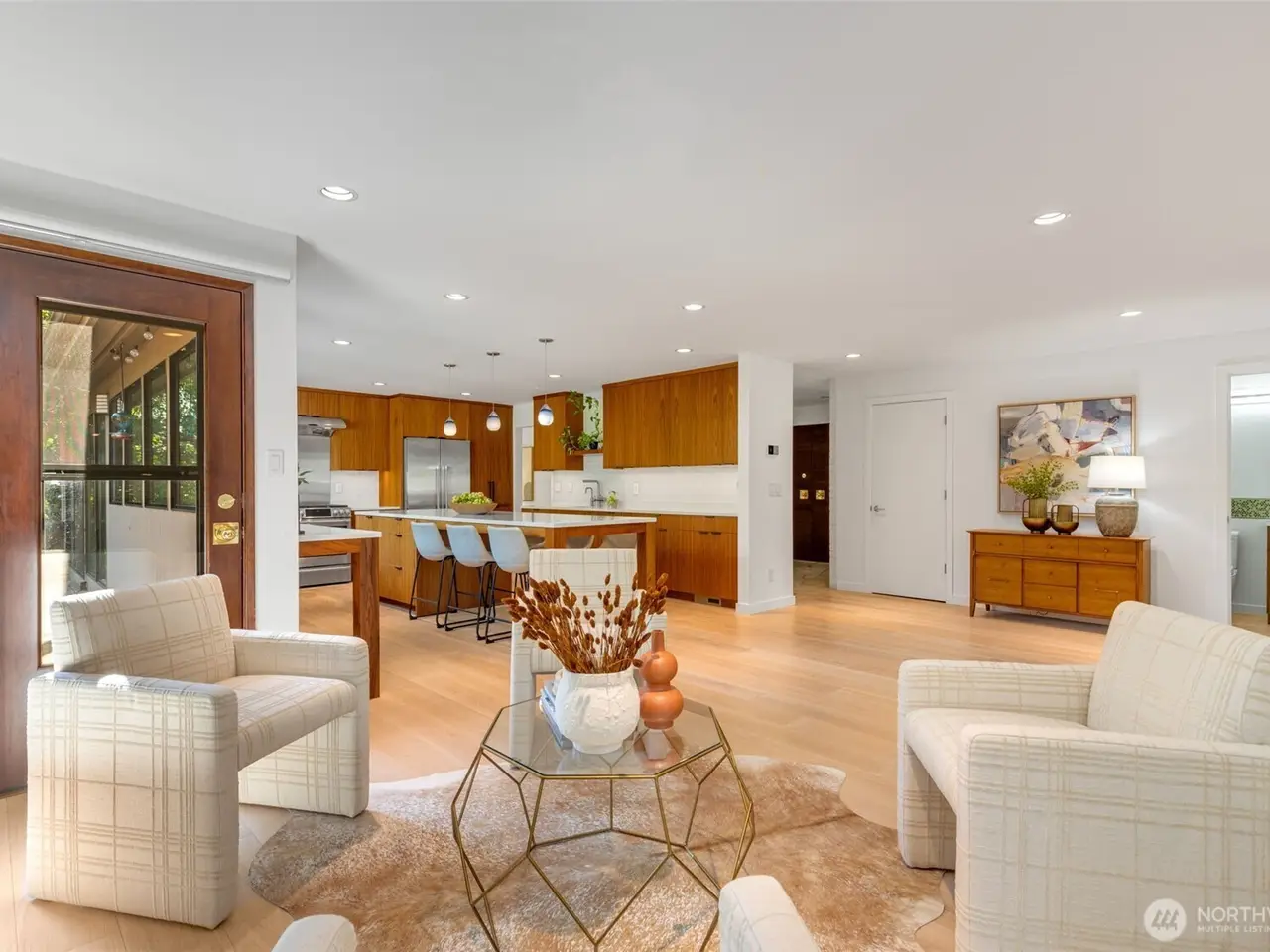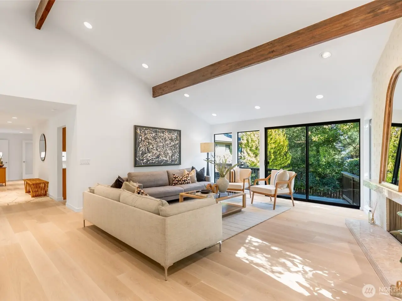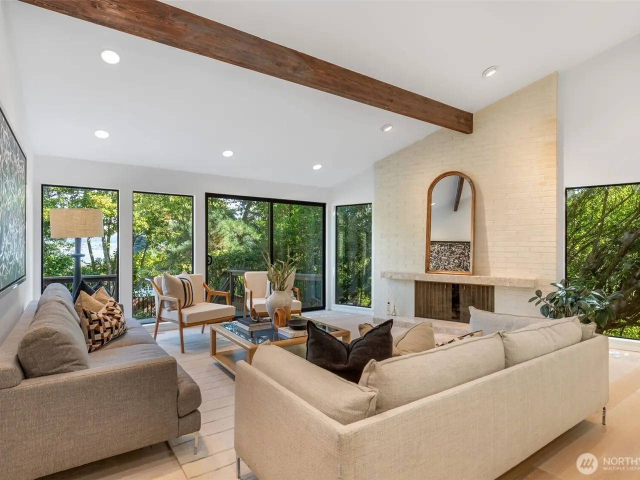 You can have it ALL in this carefully reconstructed Mid Century Marvel with PNW vibes. Its discreet exterior opens to reveal impressive vaulted ceilings, peaceful filtered lake views & all of today's wants, like open chef's kitchen, home gym, 2 car garage & AC. Totally overhauled from roof to sewer, from plumbing + electrical + HVAC systems to all interior surfaces, there's nothing left for you to do! Existing rooms were reconfigured into 4 gracious ensuites w/large attached sitting rooms/offices, a very desirable main floor multi-generational living option. Relax in the private & versatile backyard w/built-in BBQ grill, upper deck, lower patio & level grassy area w/fruit trees + garden space. Eligible for Windermere Beach Club & Security.