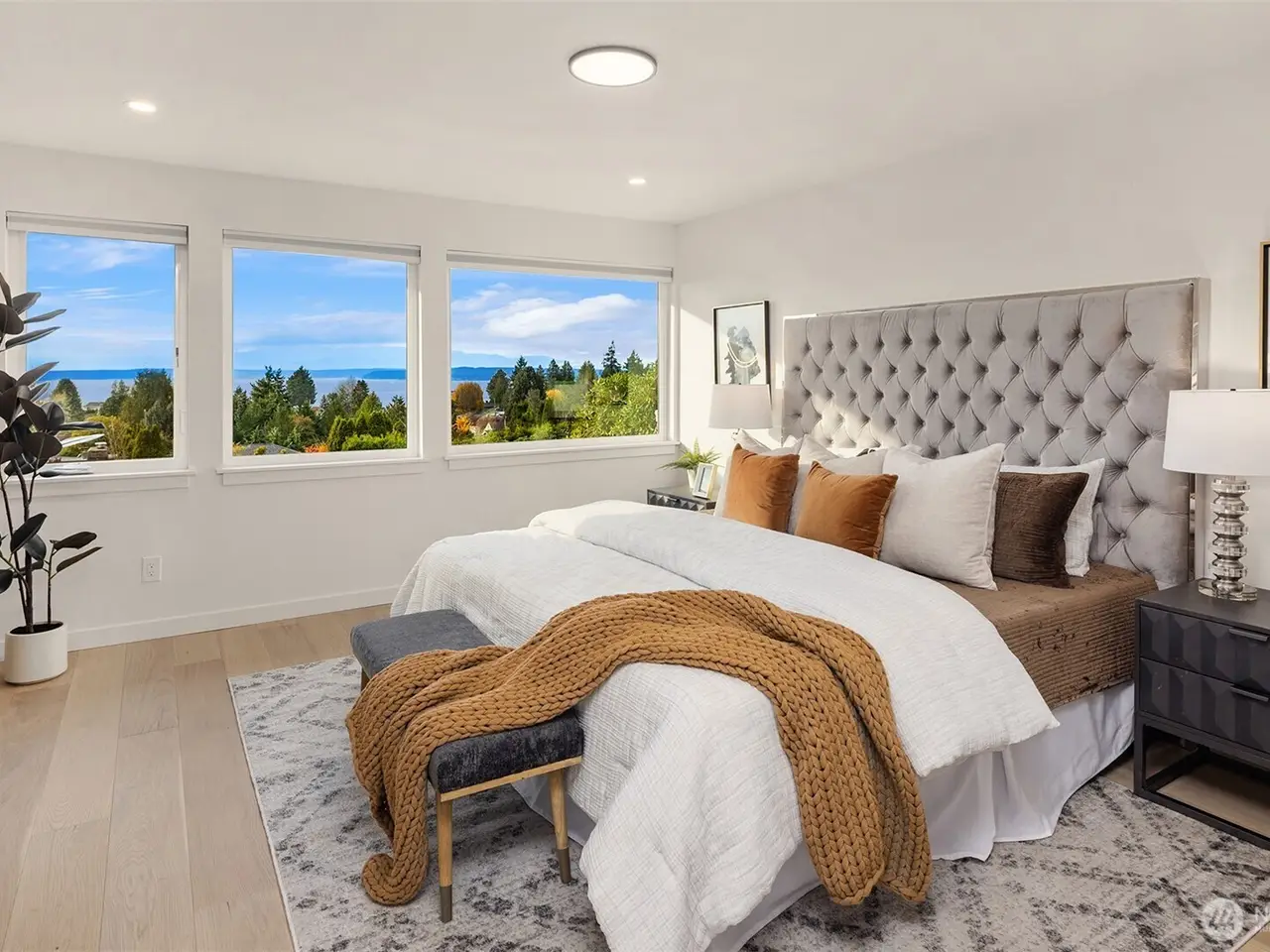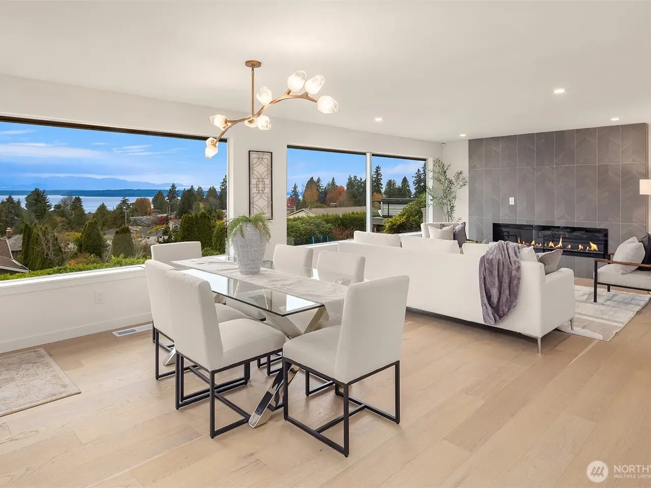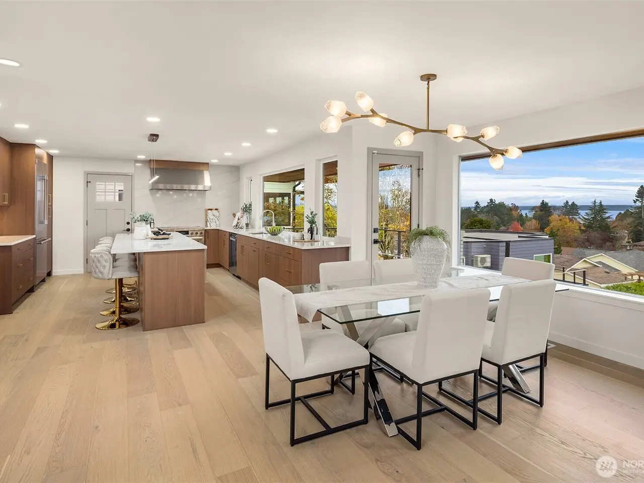 Enjoy dreamy sunset views and a sweeping Puget Sound and Olympic Mountain panorama from this stunning mid-century home perched in Broadview, a treasured northwest Seattle neighborhood. Gorgeous, newly remodeled interiors feature wide-plank engineered hardwoods, expansive windows, and designer fixtures & finishes. Stylish chef's kitchen w/ high-end appliances, beautiful custom cabinetry & quartz surfaces. Three bedrooms on main, incl. luxurious primary suite w/ 5-piece bath & walk-in closet. Huge lower-level rec room + 2 more bedrooms & generous laundry room. Extensively updated w/ new electrical, plumbing, A/C, paint, driveway & more. Explore Carkeek park & this delightful neighborhood setting minutes to Seattle shops, dining & amenities!