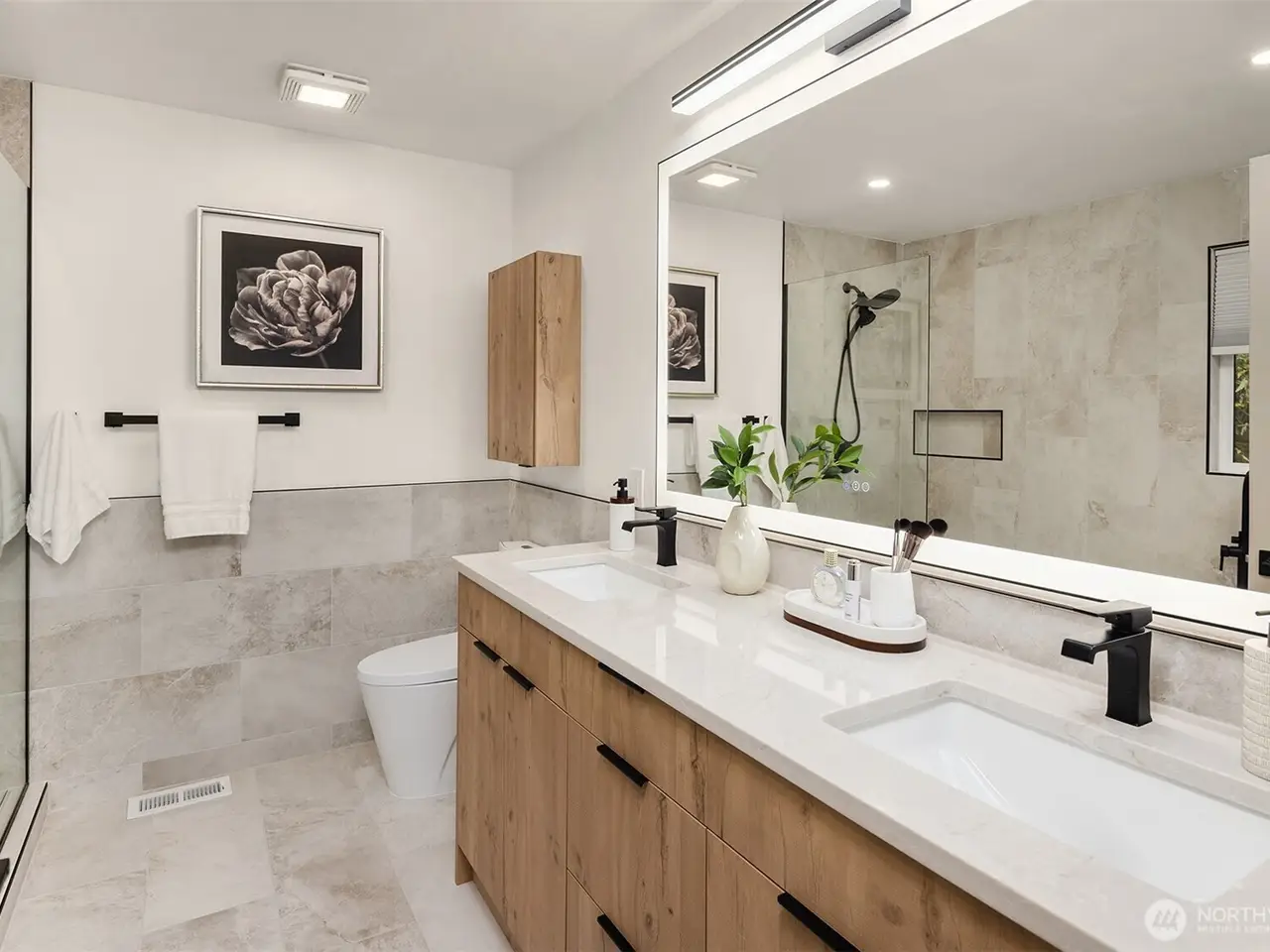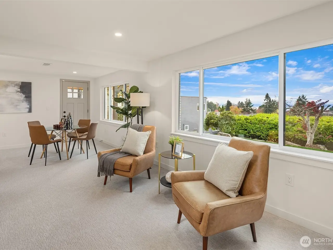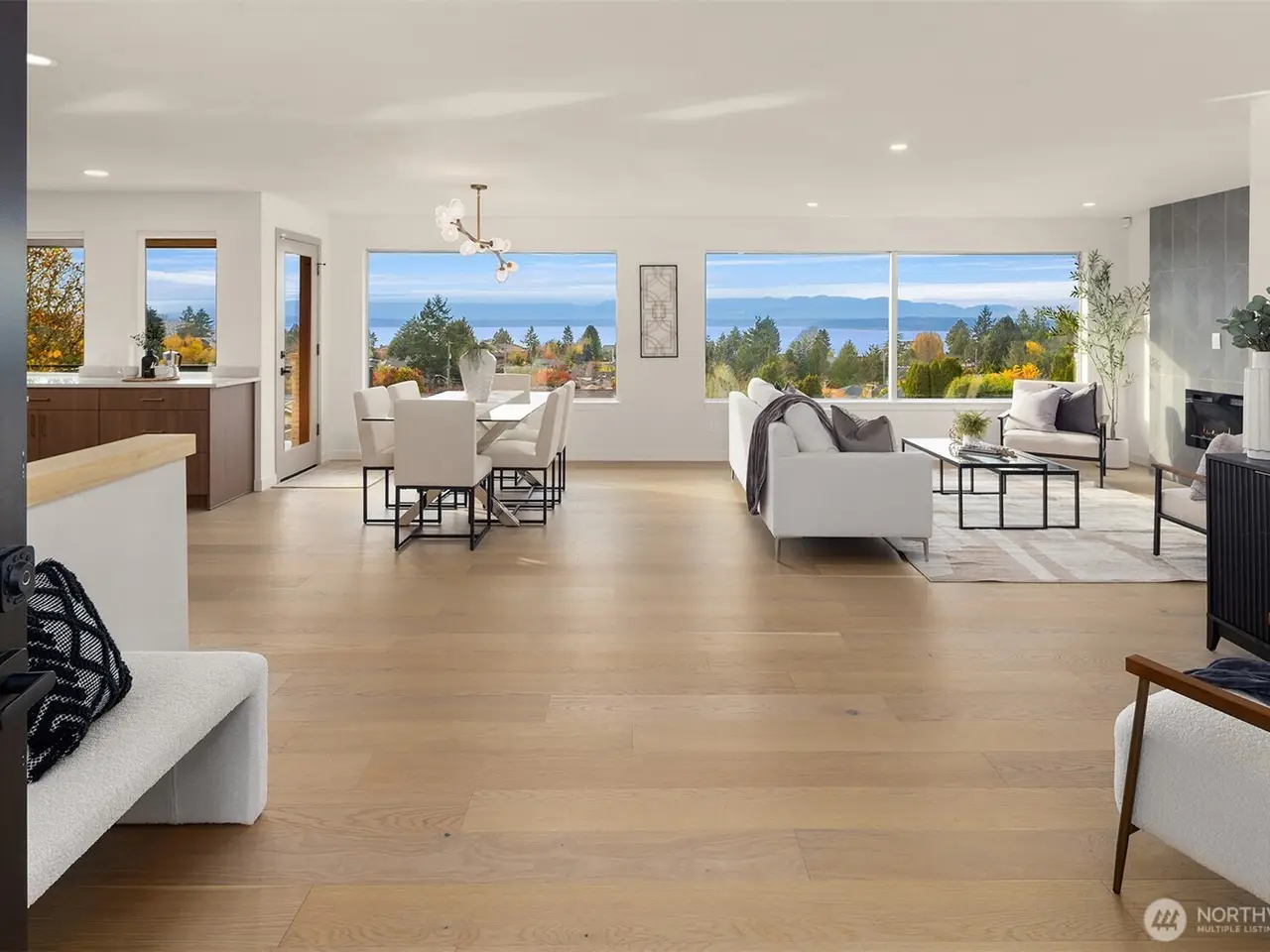 Enjoy dreamy sunset views and a sweeping Puget Sound and Olympic Mountain panorama from this stunning mid-century home perched in Broadview, a treasured northwest Seattle neighborhood. Gorgeous, newly remodeled interiors feature wide-plank engineered hardwoods, expansive windows, and designer fixtures & finishes. Stylish chef's kitchen w/ high-end appliances, beautiful custom cabinetry & quartz surfaces. Three bedrooms on main, incl. luxurious primary suite w/ 5-piece bath & walk-in closet. Huge lower-level rec room + 2 more bedrooms & generous laundry room. Extensively updated w/ new electrical, plumbing, A/C, paint, driveway & more. Explore Carkeek park & this delightful neighborhood setting minutes to Seattle shops, dining & amenities!