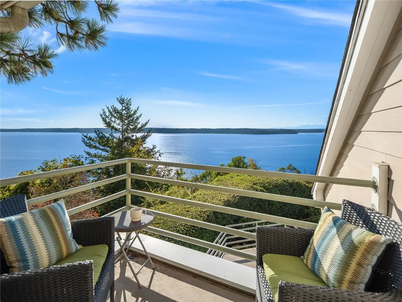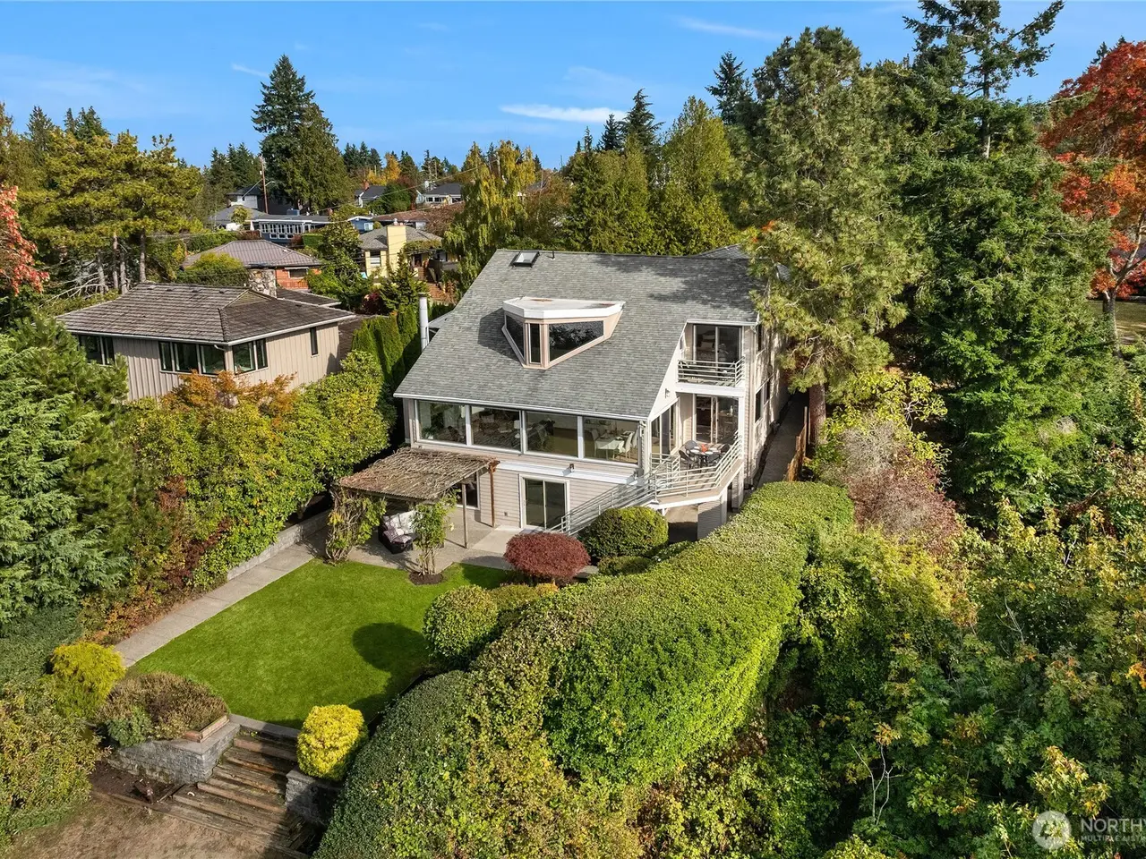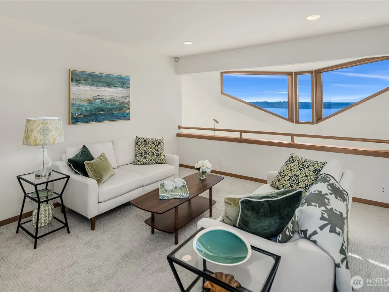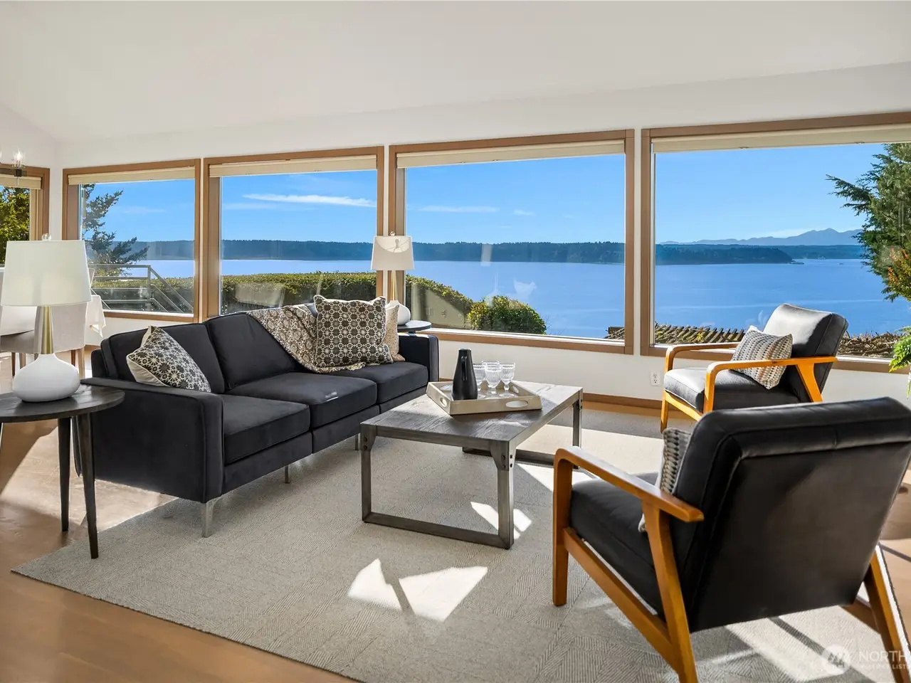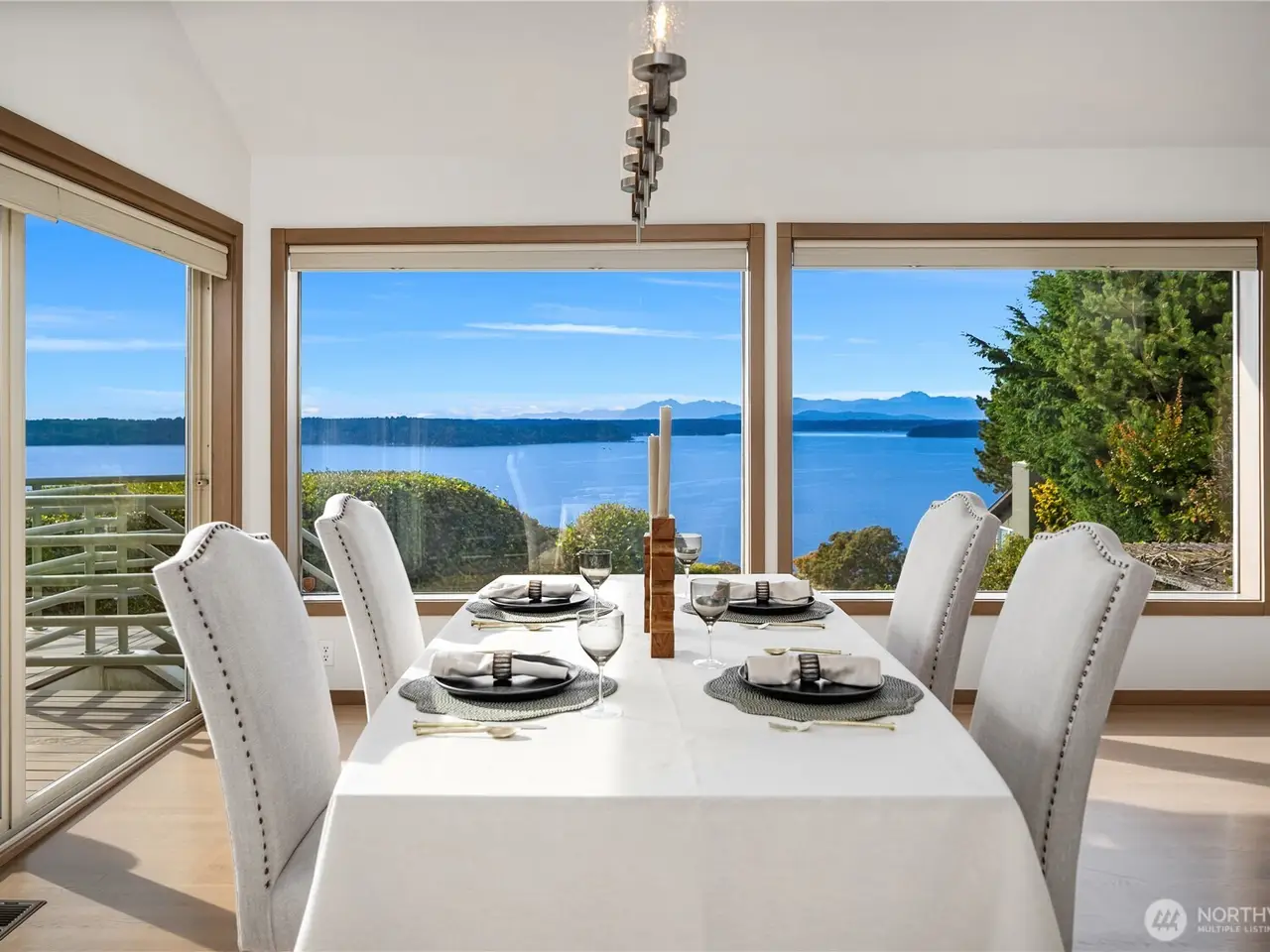 Amazing Northwest Contemporary home. Quiet and Peaceful. Sweeping Puget Sound views from all floors. Exceptional craftsmanship. Expansive living and dining areas. Family room next to gorgeous kitchen with dining nook and top of the line appliances. Upper floor features three bedrooms, two fantastic baths, and sitting or playroom loft space. Downstairs has huge rec room, or use as 2nd primary suite, with glass doors leading to patio and backyard. Office area, exercise room too. New interior paint, carpet, and tile. Beautifully landscaped. Privately tucked away from street down circular driveway that accesses two garages. 2nd garage has electric, water, and sewer for potential extra unit. Level entry. A truly grand property. Whole house A/C!