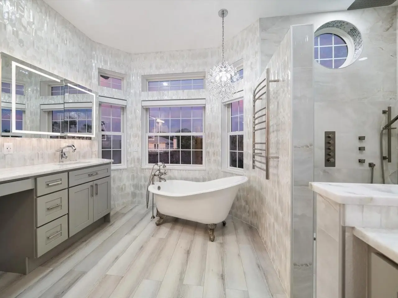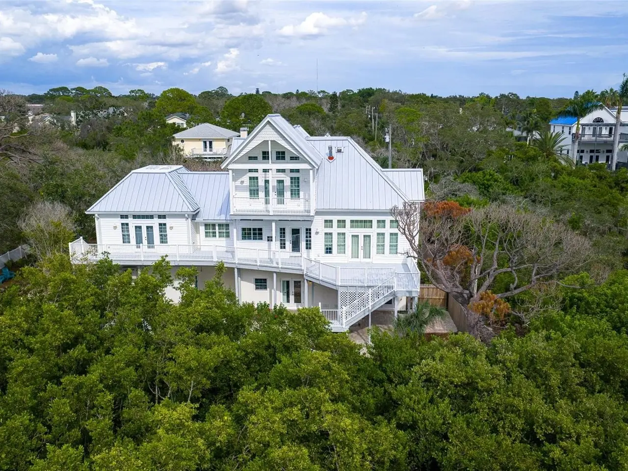 With its unparalleled blend of sophistication and natural serenity, this exquisite residence offers a tranquil setting, abundance of green space, and views that are captivating. The interior is defined by meticulous attention to detail and a sense of timeless, refined luxury. Elevated construction with living areas on the second and third levels are easily accessed by either stairs or elevator. The entry through double etched glass doors to the main living level is impressive with its vaulted ceilings, soft lighting and detailed rich planked wood ceilings. A spectacular kitchen with large center island, top of the line appliances such as a 6 burner gas stove is certain to impress the most selective chef. Family and guests will enjoy the two-sided fireplace during casual meals or grand-scale entertaining in the inviting dining room. Three additional bedrooms, one currently used as an office, provide a floor plan that is functional. The entire third level is comprised of the opulent primary suite featuring a lavish bath area with exquisite finishes- soaking tub, walk in shower with multiple heads, mirrors with touch activated lighting and temperature control; the area exudes refined luxury. Be delighted by the sensational sunsets from your expansive private terraces. Ground level flex area of approximately 580 sq. ft., not included in the heated square footage, provides additional space for exercise, hobbies or recreational activities and is equipped with a spacious bar and full bath. Additionally, the property offers an oversized air conditioned 4 car garage, separate work shop, storage and hard wired hook up for whole house generator. New items include; roof, gutters and drain systems, flooring, exterior paint. Appreciate the private side yard for gardening, play area, or various outdoor activities- Seller has acquired a plan for those who consider an addition of a pool and can be shared. This is a property with a multitude of possibilities for those with varied interest. The striking architectural design blends seamlessly with the natural landscape and allows for a private retreat where luxury meets the beauty of nature! And yet, it is just minutes from beaches, shopping and access roads to neighboring Tampa and St Petersburg. Don’t miss this one-it is outstanding!