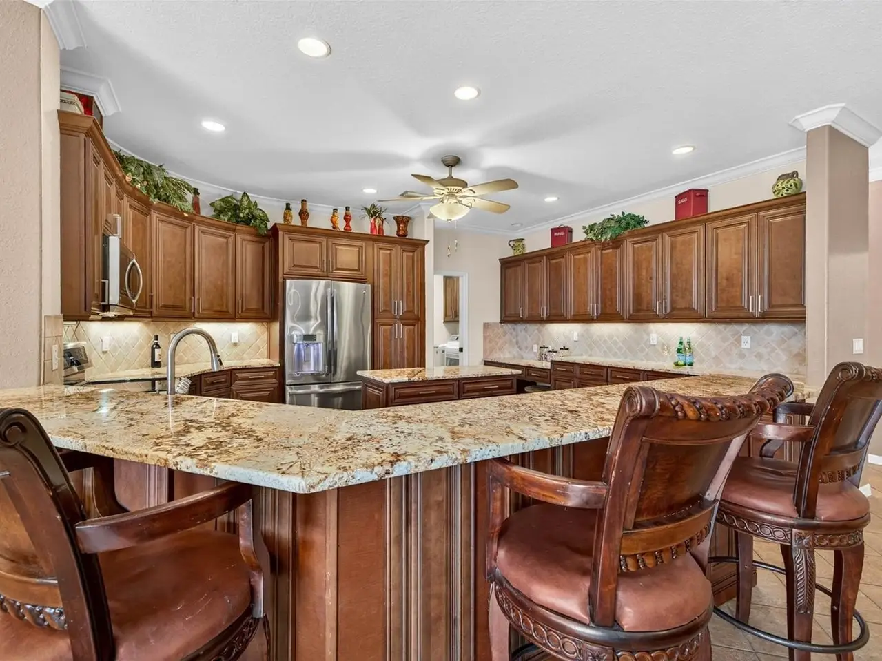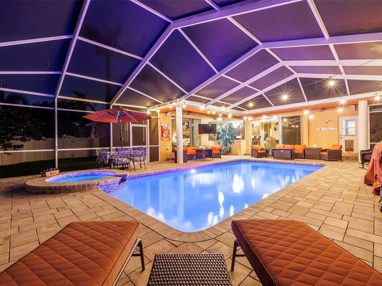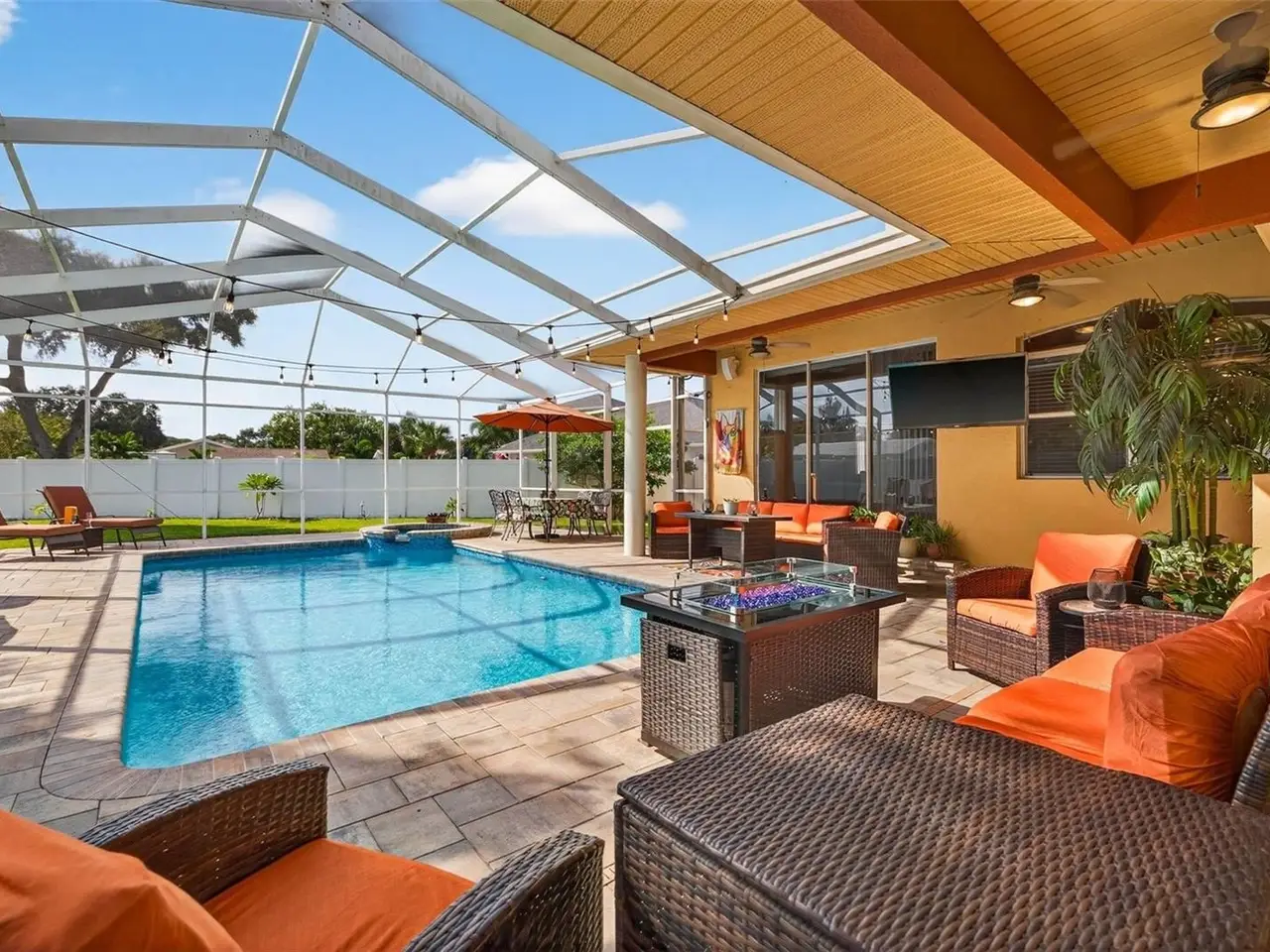 Welcome Home! Tucked away in the quiet, deed-restricted enclave of Sea Oaks, this 4-bedroom, 3-bath executive home offers over 3,100 square feet of beautifully balanced living space perfect for entertaining and families. Built in 2001 and thoughtfully updated throughout, this home combines modern comfort with a timeless sense of style. A stately entry welcomes you into an airy open floor plan, where generous living and dining areas flow effortlessly toward the heart of the home. The heart of the home centers around the beautifully updated kitchen (2022), featuring custom cabinetry, granite countertops, and high-end appliances that make cooking and gathering a joy. From here, panoramic sliding glass doors open wide to reveal a resort-style outdoor retreat. An oversized screened lanai with a sparkling pool and spa surrounded by abundant lounging and dining space. Whether hosting lively weekend barbecues, pool parties, or quiet evenings under the lights, this outdoor area truly extends the home’s living space year-round. The split-plan primary suite provides a peaceful retreat with a large walk-in closet and well-appointed bath. A versatile bonus room offers endless flexibility, perfect for an executive home office, fitness studio, library, or creative space. Upstairs, a private den with a custom bar makes the ideal setting for game nights, weekend gatherings, or quiet evenings in. With recent upgrades including a 2020 roof, 2022 HVAC, and 2019 water heater, this home is as practical as it is inviting. Set on an elevated quarter-acre lot, not located in any flood zone (high and dry), located less than five minutes from the beach, in a top-rated school zone, and with exceptional shopping and dining, this is Florida living at its best!