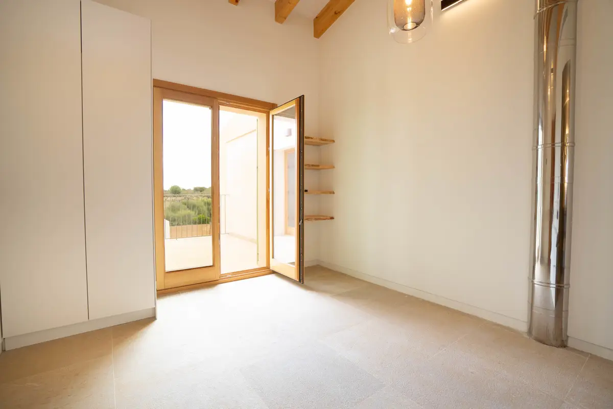Modern townhouse, recently built. From the entrance, the house exudes a modern ambience with hints of the traditional Mallorcan style. On the ground floor there is an entrance hall with cloakroom, a guest toilet and a spacious living area with fireplace, perfectly integrated with an open plan kitchen and dining room. A glazed courtyard in the middle of the ground floor adds a luxurious touch and provides plenty of light. The high, sloping ceilings with their exposed beams give a feeling of spaciousness and charm. The upper floor consists of three spacious double bedrooms, each with its own en suite bathroom. There is also a separate laundry and machine room. Central air conditioning and underfloor heating with aerothermal heating guarantee optimal temperatures all year round and promise maximum comfort. Outside there is a beautiful relaxation area with a veranda and a large saltwater swimming pool, as well as a maintenance house with bathroom. The property includes a garage with plenty of storage space. It is possible to purchase the property furnished.