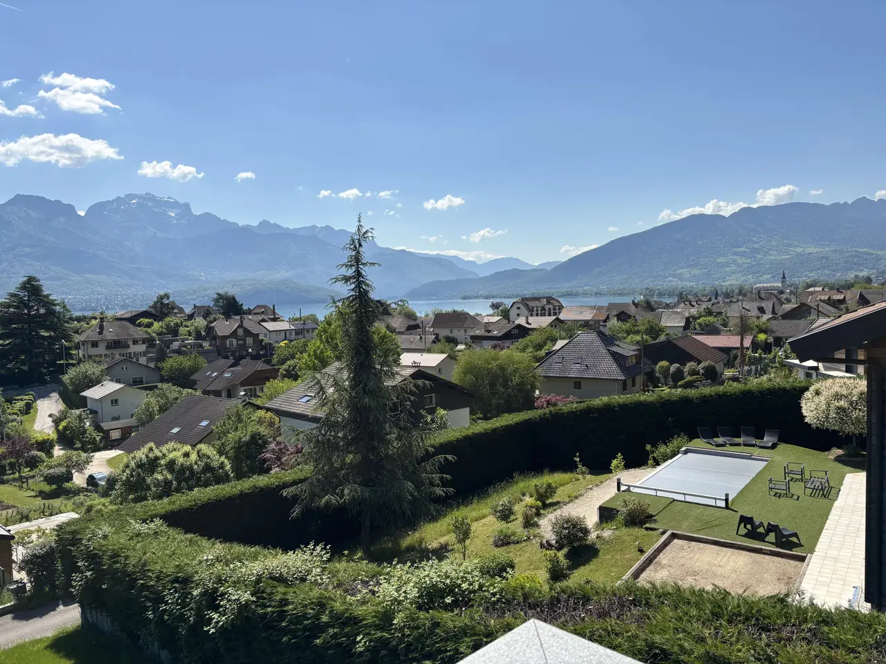 Discover this sumptuous contemporary luxury villa, ideally located in a peaceful and privileged setting where elegance, comfort, and refinement come together to offer an exceptional daily lifestyle. Designed as a true haven of peace, this unique property offers a spectacular panoramic view of the lake and the mountains — a breathtaking landscape visible from every living space. Main features: 300m² of living space with generous volumes and panoramic bay windows 3 spacious bedrooms, including a sumptuous master suite with private balcony Bright living area of over 80m², extended by a large terrace Wine cellar High-end contemporary kitchen with premium appliances Pool, landscaped garden, and terraces in perfect harmony with nature Independent apartment for staff or guests, with separate access High-quality finishes, noble materials, and absolute comfort All nestled in an exclusive natural setting, combining peace, discretion, and immediate access to essential amenities. A rare residence that brings together contemporary architecture, exceptional views, and top-tier features — designed for a discerning clientele in search of well-being and serenity. Contact us for a private viewing and let yourself be charmed.