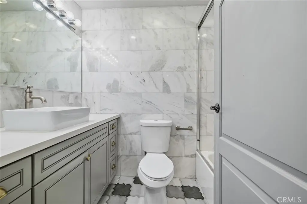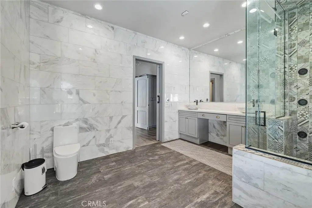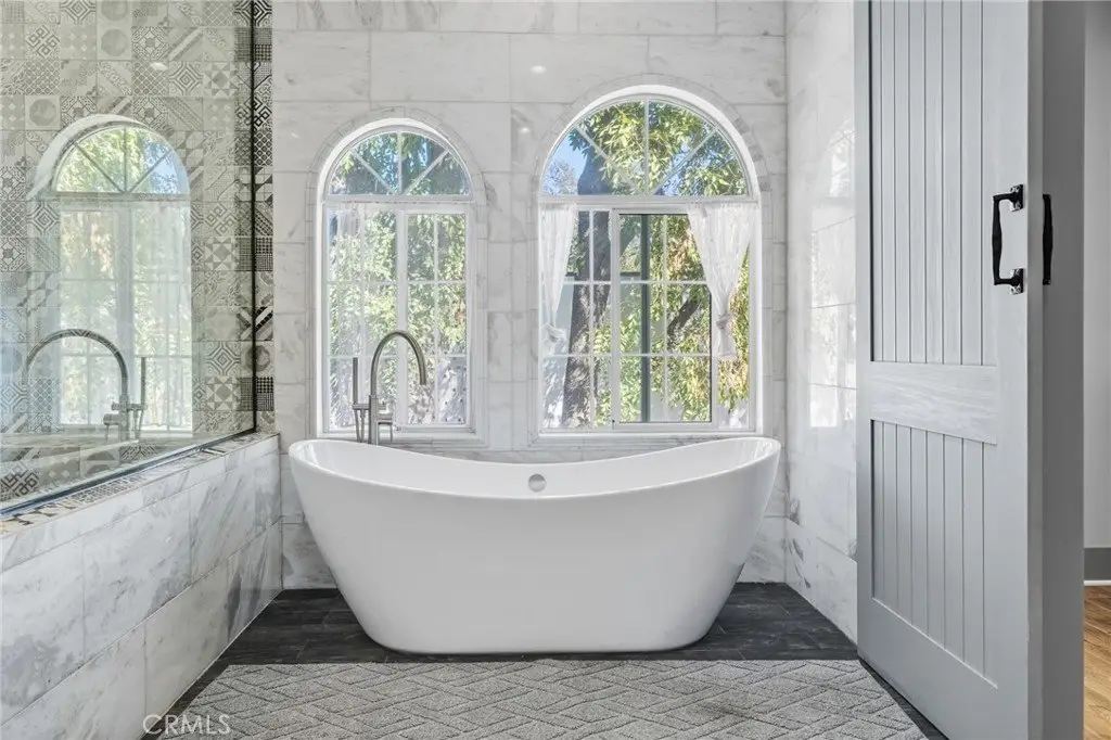 • Glass-enclosed mosaic-tiled walk-in shower with multiple shower heads
