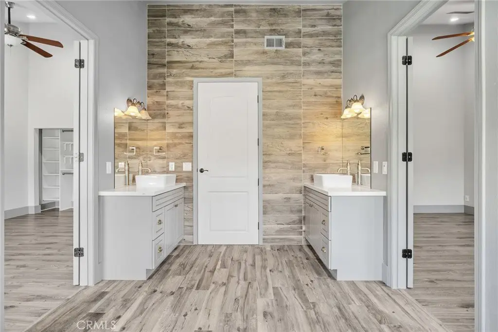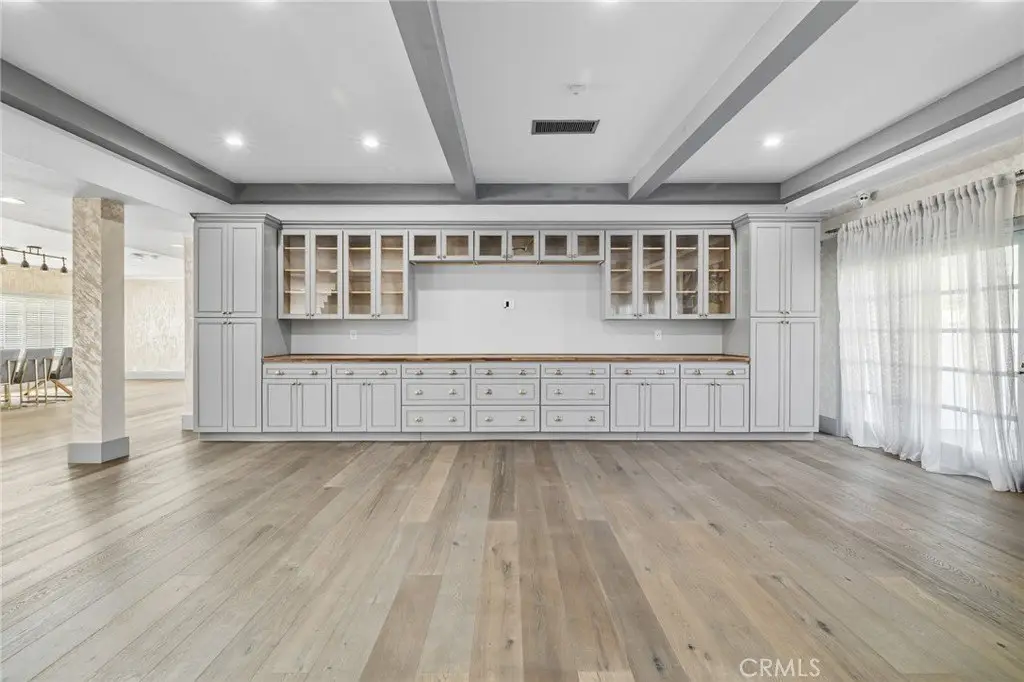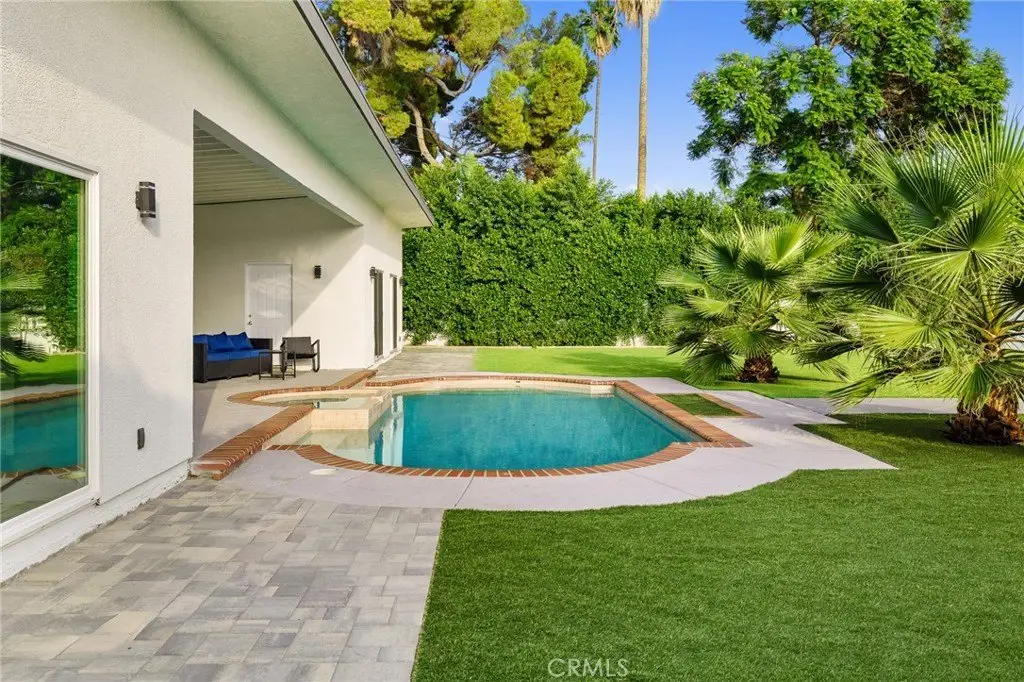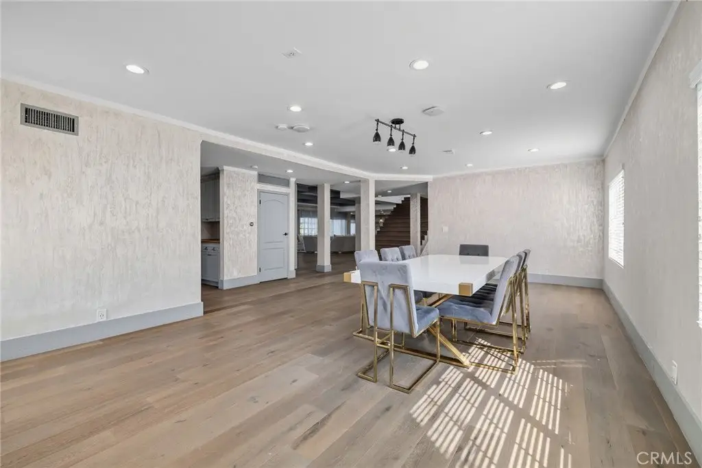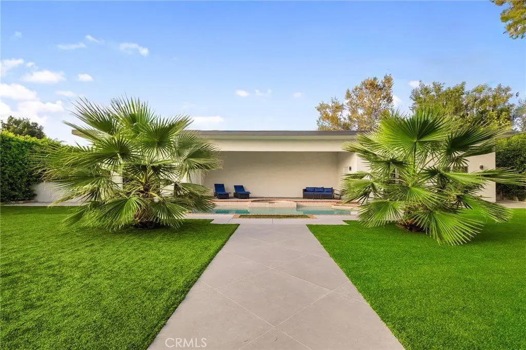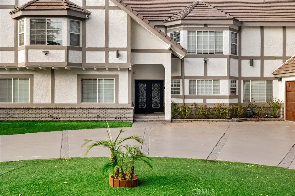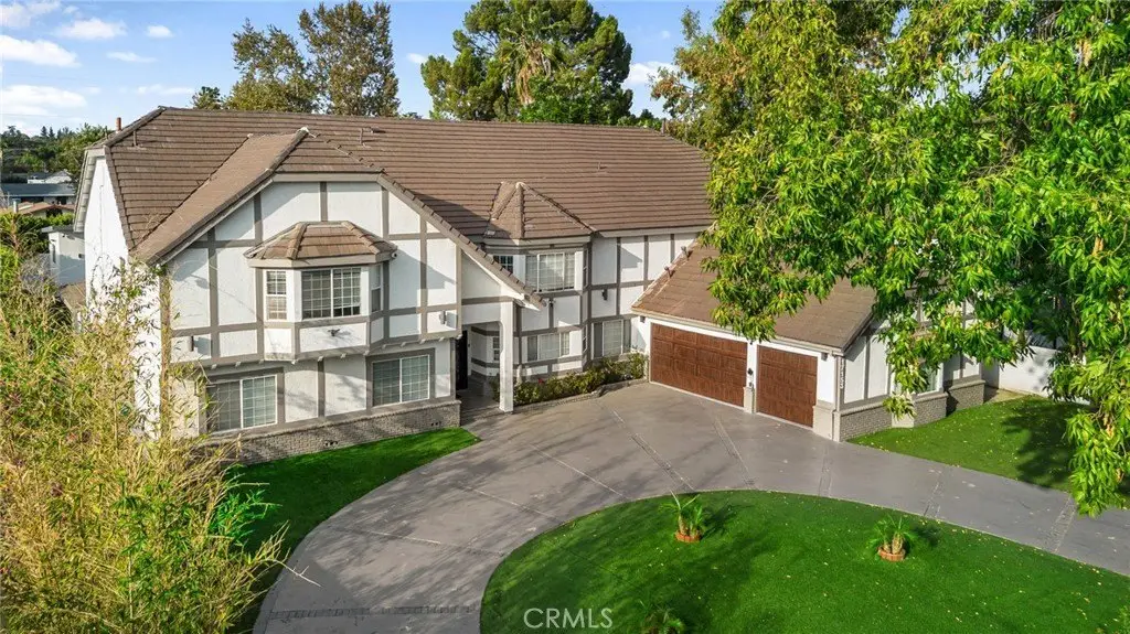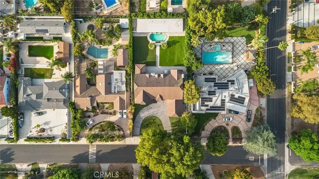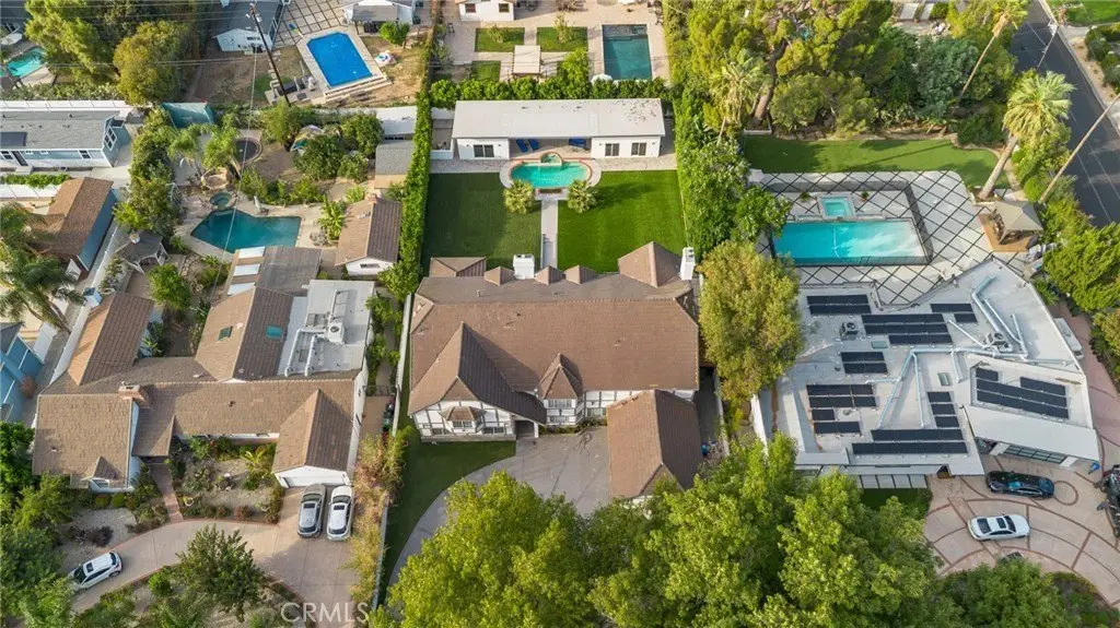 Welcome to this elegantly remodeled estate in the highly desirable community of Sherwood Forest, one of the largest homes in the neighborhood. This 7, 007 square foot residence is situated on a rare 21, 000 square foot lot. As you enter through the automatic gates, you are greeted by an expansive circular driveway and this modern contemporary Tudor home. The wrought iron double entry glass doors welcome you into a vast open floor plan that includes a grand family room, a sitting foyer, a formal dining room, and a remodeled kitchen. The eye-catching, upgraded oversized kitchen island, complete with custom built-in drawers and a breakfast bar, invites you into a chef's kitchen. All stainless steel appliances and custom cabinetry, accented with brass hardware, enhance your cooking experience. This bright open space is perfect for entertaining and welcoming families. The main floor's west wing features a spacious and desirable first-floor bedroom suite with a walk-in closet and private bath, along with one of two laundry areas. The east wing boasts a beautifully remodeled powder room and guest quarters, complete with a bedroom, a private bath, and an additional room with custom built-in cabinets, ideal for an in-home office or gym. The luxurious double-wide staircase leads you to a total of five upper bedrooms. Two spacious bedrooms are located in the upper east wing, accompanied by a remodeled bathroom in the common area. Two additional bedrooms with a Jack and Jill bathroom and vaulted ceilings are situated in the upper middle area, leaving the entire upper west wing dedicated to the primary suite. The primary suite features high vaulted ceilings, perfect for the elegant chandelier that greets you at the double door entrance. Custom built-ins, a retreat area with a fireplace, and a balcony create a cozy atmosphere within this expansive wing. As you enter the barn door-enclosed bathroom, relax in the glass-enclosed mosaic-tiled walk-in shower, complete with multiple shower heads and jets. Alternatively, find sanctuary in the Roman bathtub, perfect for soaking. A specially designed, automatically lit massive walk-in closet offers ample space for clothing, shoes, and accessories. The backyard is an entertainer's dream, featuring a sprawling turfed lawn that leads to a pool, tiled flooring, and lush landscaping. An additional value-added ADU with 1 bedroom and 1 bathroom-17155 Rayen, aprox. add. 800 sq ft offers its own address, making it perfect for in-laws.