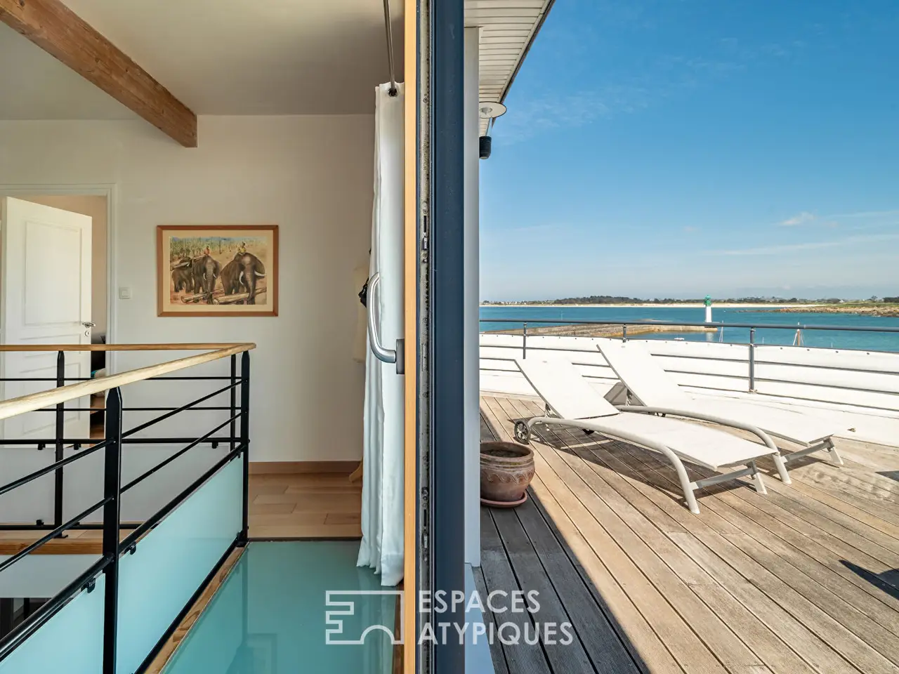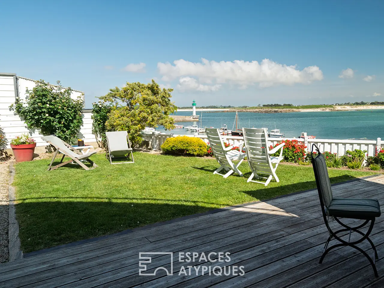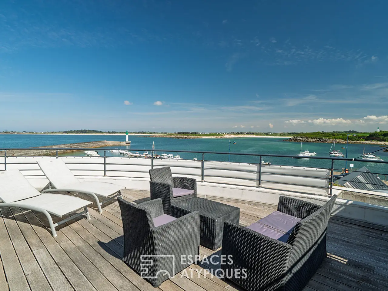 In Mogueriec, a small coastal port in northern Finistere, this architect-designed house seems to have dropped anchor facing the ocean. Like a ship poised between sky and sea, it overlooks the fine sandy beach and the comings and goings of boats passing by the lighthouse. Facing out to sea, it enjoys a changing panorama, bathed in light from early morning. A former fisherman's house, it underwent a complete metamorphosis under the hand of a renowned architect, who gave it a new silhouette: refined, open, and resolutely turned towards the horizon. From every room, the sea invites itself in as an obvious presence, moving and majestic. Here, one lives to the rhythm of the tides, lulled by the song of the gulls, with direct access to the water and the constant feeling of being at sea.Inside, the volumes are organized like an upper deck, where the sea remains visible from one end to the other. The living area is centered around a large glass-enclosed lounge, entirely facing the terrace and garden, with the ocean on the horizon. The dining room is part of a bold tropical decor, combining plant notes, graphic tones, and dizzying ceiling heights. The eye is guided by a staircase suspended from the aerial line, a true backbone of the space. Thermal comfort is at the rendezvous: electric underfloor heating provides gentle warmth, complemented by the presence of a wood-burning stove that reinforces the cozy atmosphere of maritime evenings. Further back, the fitted and equipped kitchen seduces with its contemporary aesthetic. It subtly opens onto the rest of the room, without ever breaking the visual fluidity. The whole extends naturally towards the outside: a vast wooden terrace invites contemplation, the enclosed garden ensures privacy, and always the sea as a backdrop, omnipresent and moving.On the ground floor, a sleeping area with a shower room has been designed as a discreet refuge. A laundry room and a separate toilet complete this level. From the living room, an aerial staircase leads to the upper floor, where circulation is completely transparent.The mezzanine, open to the living room and bordered by frosted glass railings, dominates the space like a suspension bridge. As soon as you reach the top of the staircase, an unexpected space opens up as a viewpoint: a suspended roof terrace, open 180° onto the sea and the ballet of boats. This orientation offers a breathtaking view of the sea, towards the cove of Guillec and the island of Sieck, where each sunrise reveals new nuances on the water. Here, the gaze stretches to infinity, between the port jetty, the beach and the banks that outline the bay. The first bedroom upstairs has direct access to this panoramic terrace, for waking up facing the ocean. The second bedroom, bright and peaceful, also overlooks the sea, with a rare view of the Mogueriec lighthouse. The mezzanine space, currently used as an office, could easily be partitioned to accommodate an additional bedroom, without altering the balance of the volume. A bathroom with toilet and a storage space complete this level, in a peaceful and functional atmosphere.Outside, the enclosed garden unfolds facing the sea in a gentle seaside atmosphere. Bordered by flowers and local species, it invites you to relax on the wooden terrace or in the heart of the lawn, with the sea and the lighthouse as a backdrop. A woodshed and an annex space offer storage options. A covered carport allows for parking two vehicles with complete peace of mind. In terms of amenities, the house benefits from a central vacuum system and a rainwater recovery system for the washing machine and toilet. It is connected to the mains drainage system and equipped with fiber optics. An atypical property requiring no renovations, perfect for settling down and fully enjoying the sea and fine sandy beaches. Ideal as a primary or secondary residence, or as a rental project, it offers a unique living environment, combining immediate comfo