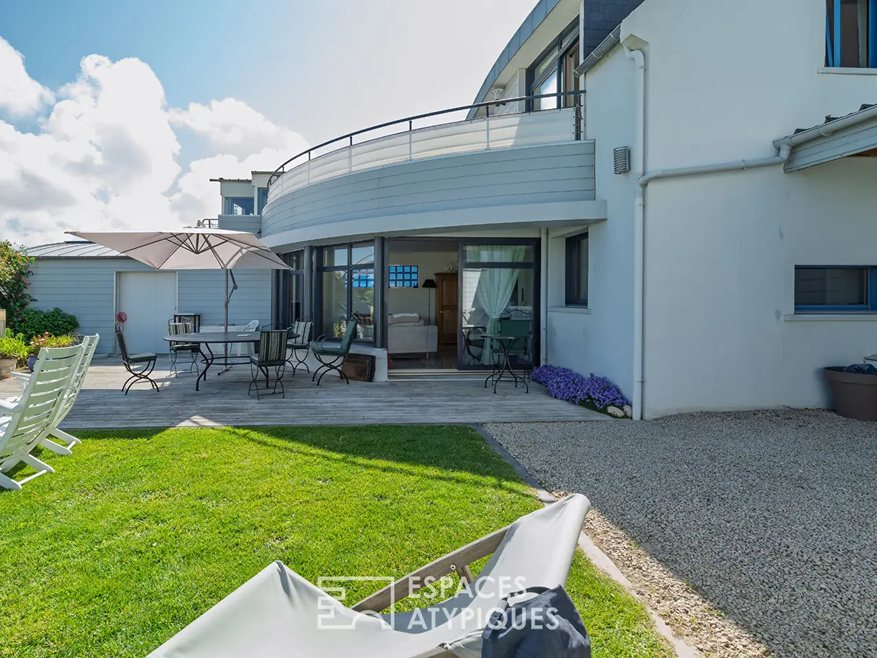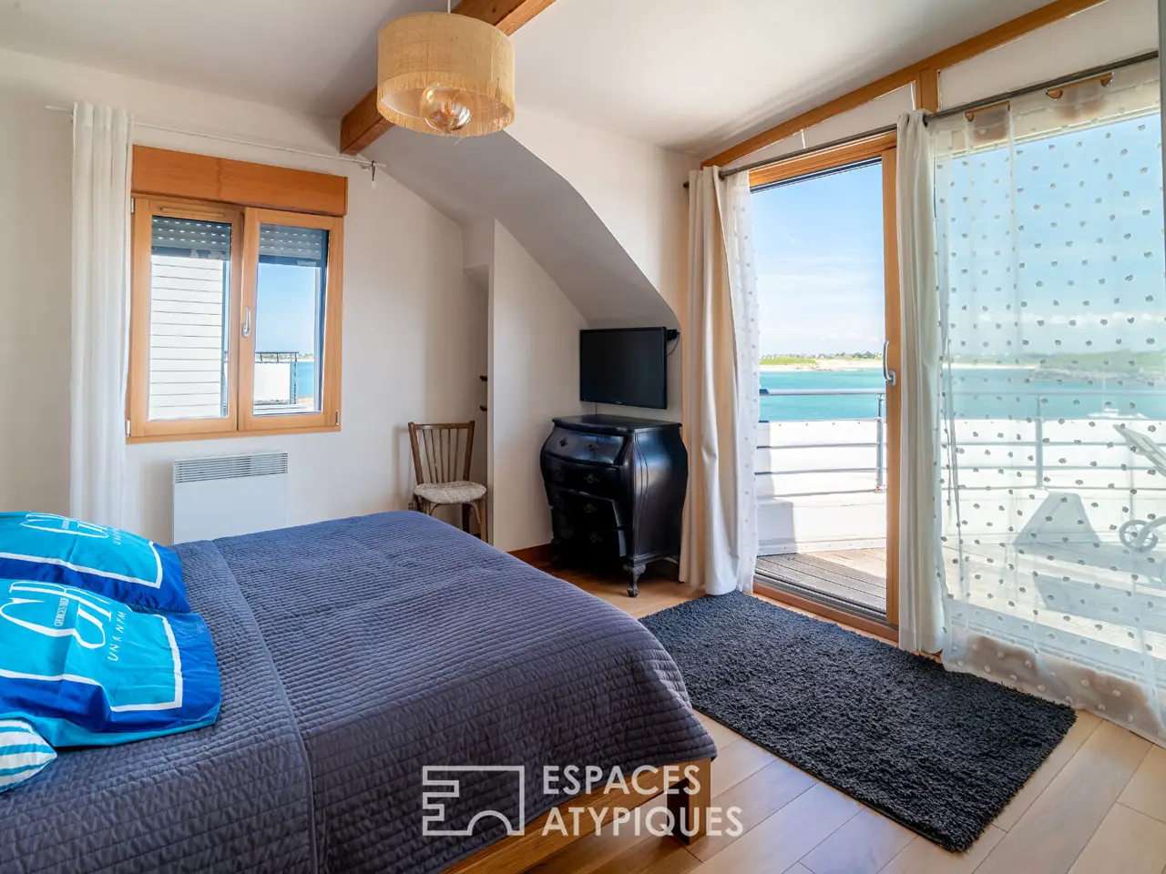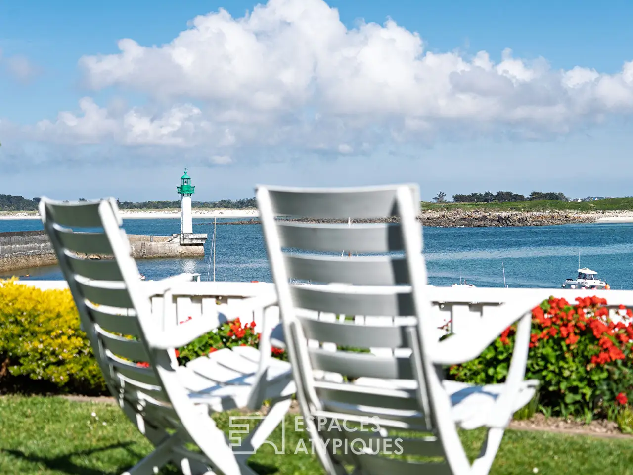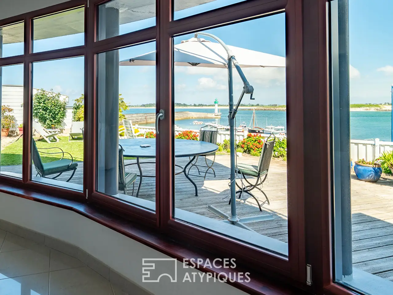 In Mogueriec, a small coastal port in northern Finistere, this architect-designed house seems to have dropped anchor facing the ocean. Like a ship poised between sky and sea, it overlooks the fine sandy beach and the comings and goings of boats passing by the lighthouse. Facing out to sea, it enjoys a changing panorama, bathed in light from early morning. A former fisherman's house, it underwent a complete metamorphosis under the hand of a renowned architect, who gave it a new silhouette: refined, open, and resolutely turned towards the horizon. From every room, the sea invites itself in as an obvious presence, moving and majestic. Here, one lives to the rhythm of the tides, lulled by the song of the gulls, with direct access to the water and the constant feeling of being at sea.Inside, the volumes are organized like an upper deck, where the sea remains visible from one end to the other. The living area is centered around a large glass-enclosed lounge, entirely facing the terrace and garden, with the ocean on the horizon. The dining room is part of a bold tropical decor, combining plant notes, graphic tones, and dizzying ceiling heights. The eye is guided by a staircase suspended from the aerial line, a true backbone of the space. Thermal comfort is at the rendezvous: electric underfloor heating provides gentle warmth, complemented by the presence of a wood-burning stove that reinforces the cozy atmosphere of maritime evenings. Further back, the fitted and equipped kitchen seduces with its contemporary aesthetic. It subtly opens onto the rest of the room, without ever breaking the visual fluidity. The whole extends naturally towards the outside: a vast wooden terrace invites contemplation, the enclosed garden ensures privacy, and always the sea as a backdrop, omnipresent and moving.On the ground floor, a sleeping area with a shower room has been designed as a discreet refuge. A laundry room and a separate toilet complete this level. From the living room, an aerial staircase leads to the upper floor, where circulation is completely transparent.The mezzanine, open to the living room and bordered by frosted glass railings, dominates the space like a suspension bridge. As soon as you reach the top of the staircase, an unexpected space opens up as a viewpoint: a suspended roof terrace, open 180° onto the sea and the ballet of boats. This orientation offers a breathtaking view of the sea, towards the cove of Guillec and the island of Sieck, where each sunrise reveals new nuances on the water. Here, the gaze stretches to infinity, between the port jetty, the beach and the banks that outline the bay. The first bedroom upstairs has direct access to this panoramic terrace, for waking up facing the ocean. The second bedroom, bright and peaceful, also overlooks the sea, with a rare view of the Mogueriec lighthouse. The mezzanine space, currently used as an office, could easily be partitioned to accommodate an additional bedroom, without altering the balance of the volume. A bathroom with toilet and a storage space complete this level, in a peaceful and functional atmosphere.Outside, the enclosed garden unfolds facing the sea in a gentle seaside atmosphere. Bordered by flowers and local species, it invites you to relax on the wooden terrace or in the heart of the lawn, with the sea and the lighthouse as a backdrop. A woodshed and an annex space offer storage options. A covered carport allows for parking two vehicles with complete peace of mind. In terms of amenities, the house benefits from a central vacuum system and a rainwater recovery system for the washing machine and toilet. It is connected to the mains drainage system and equipped with fiber optics. An atypical property requiring no renovations, perfect for settling down and fully enjoying the sea and fine sandy beaches. Ideal as a primary or secondary residence, or as a rental project, it offers a unique living environment, combining immediate comfo