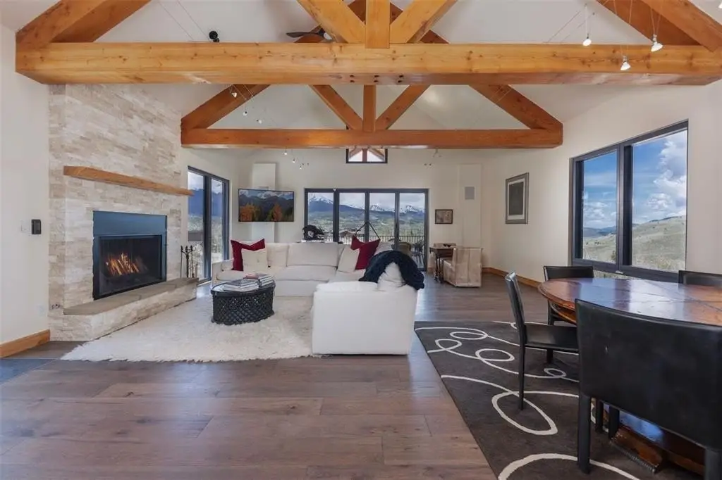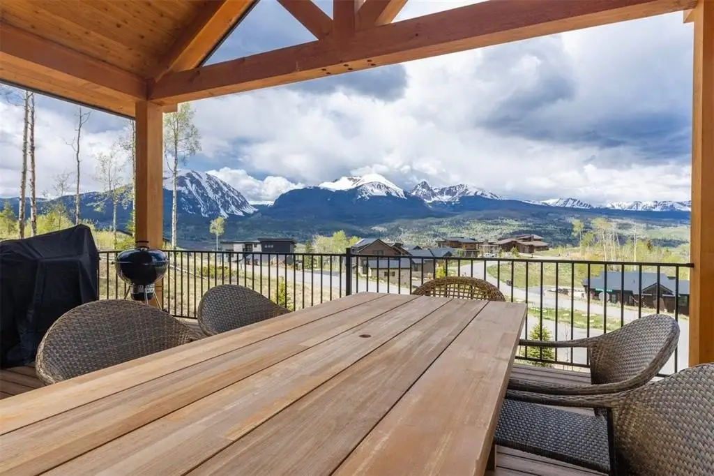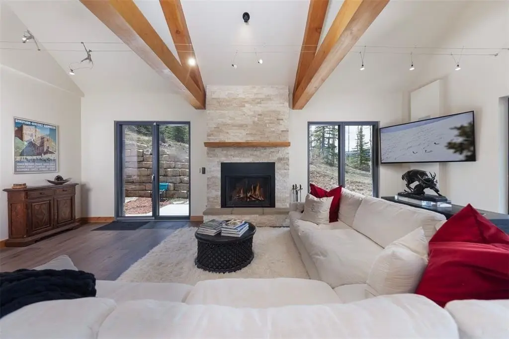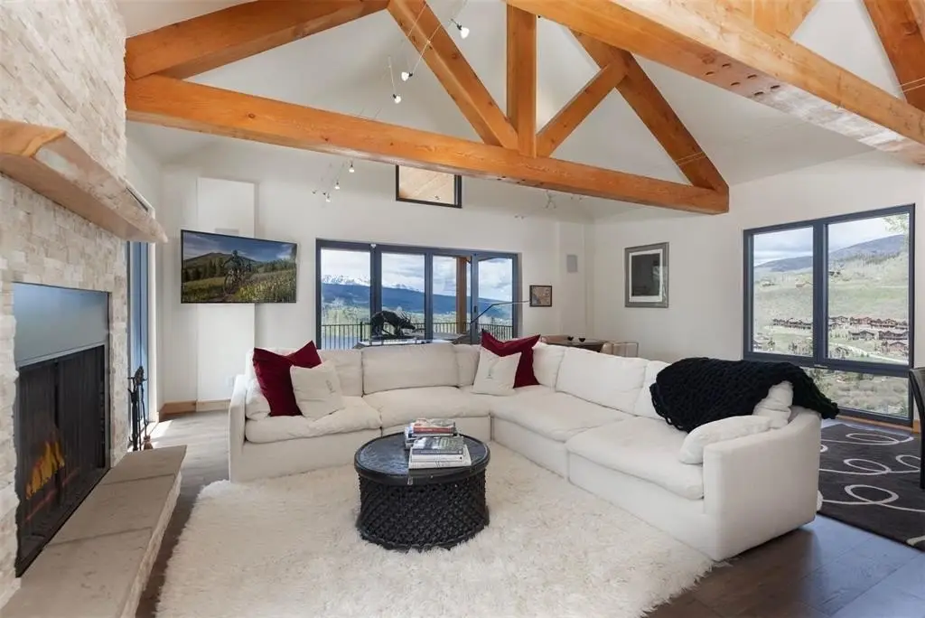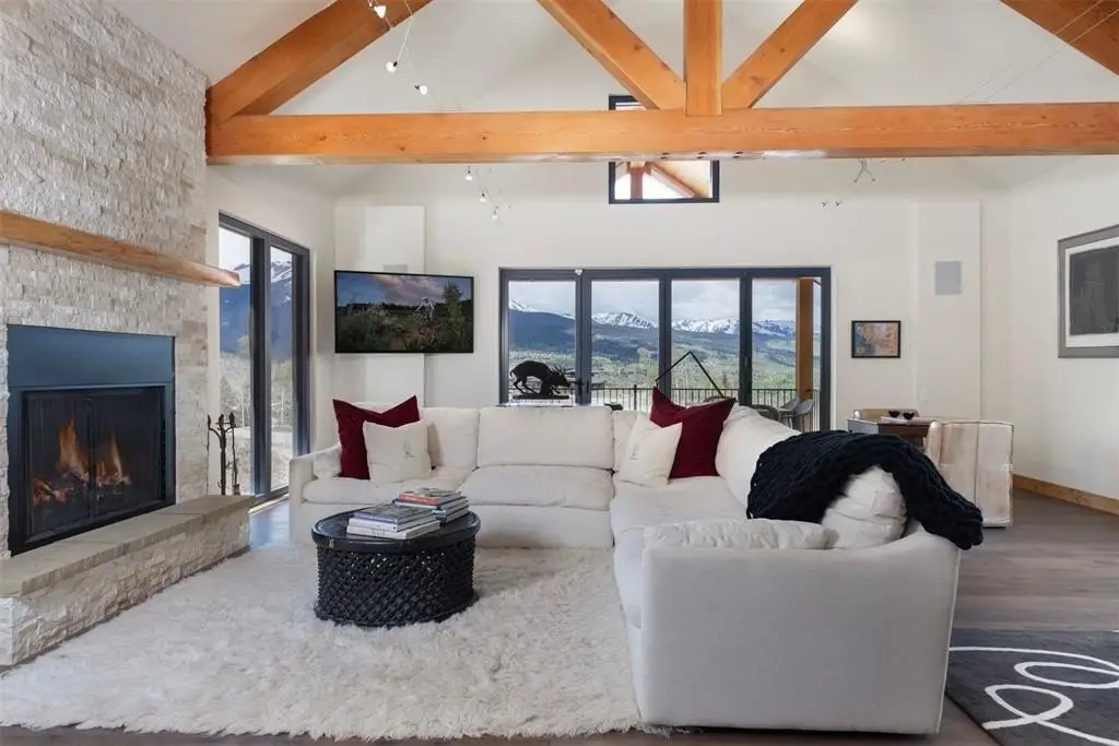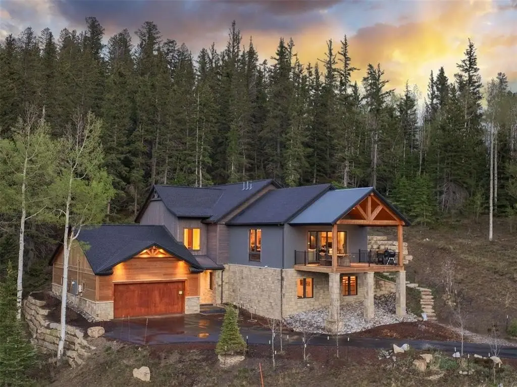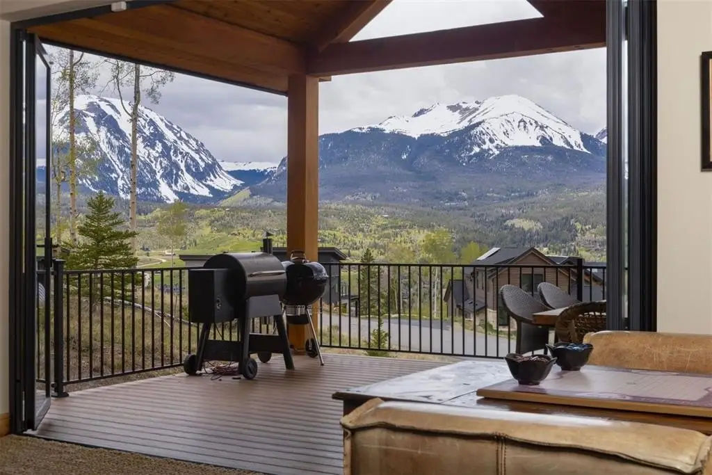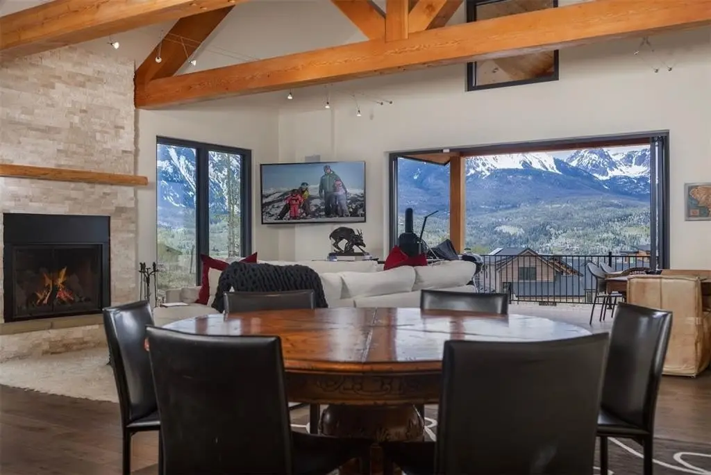 Tucked above Angler Mountain Ranch and backed by forested open space, this custom Silverthorne home offers privacy, soaring Gore Range views, and a smart mix of modern design with mountain character. Stunning Douglas fir beams and the large windows bring the outdoors inside, while an 8.6 kW owned solar array, triple-pane European windows, and high-performance thermal upgrades keep the home comfortable and efficient through all seasons. The cook's kitchen is built for real living and entertaining—featuring Bosch and GE Café appliances, dual ovens, two dishwashers, wine fridge, and a wet bar with extra beverage storage. The kitchen overlooks the vaulted great room and out through a folding glass wall onto a west-facing covered deck, where you can soak in sunset views after a day exploring Summit County in any season. Downstairs is a space to unwind and gather, with a home theater equipped with stadium seating recliners, pool table, a second wet bar for convenience, and private bedrooms that offer quiet spots for friends and family. This home is loaded with smart home technology to include whole-house automation, security, and a zoned sound system with controls in every room. The oversized 4 car garage has room for a workshop or extra gear — ready for whatever mountain adventures come your way. Functional, efficient, and built for mountain life—this home offers space, comfort, and a connection to the outdoors.