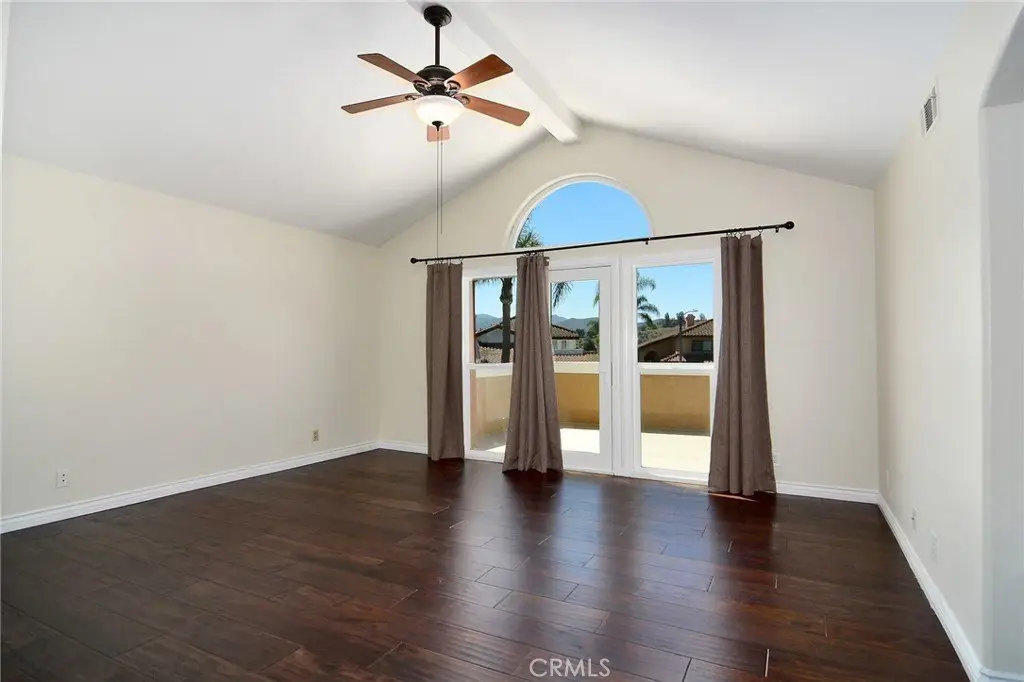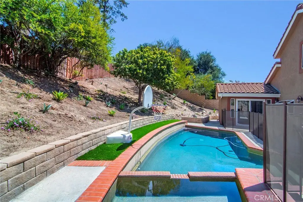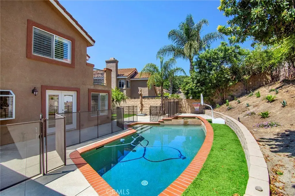 Nestled on a quiet cul-de-sac, this stunning Wood Ranch “Regalia” residence offers soaring ceilings, abundant natural light, and a spacious yet private backyard retreat. Relax by the serene Pebble Tec pool and spa while enjoying the diverse wildlife that call the hillside trees and shrubs home. Inside, you’ll find a rare main-floor multi-purpose bonus room with vaulted ceilings, a wall of built-in cabinetry, a bar sink, and two sets of double doors opening to both the formal dining room and the pool area—perfect as a home office, artist studio, gym, guest suite, or cabana bar. The upgraded kitchen features slab granite countertops, stainless steel appliances (including refrigerator and a back-saving double-drawer dishwasher), breakfast bar, and an oversized walk-in pantry. The downstairs bedroom—currently used as an office—offers soundproofed walls, double French doors, beautiful Acacia wood floors, and built-ins. A full shower bath is conveniently located nearby, along with a laundry room (washer and dryer included). Upstairs, rich Acacia wood floors flow through the hallway and primary suite, with newer carpet in the secondary bedrooms. The primary suite features a walk-in closet, water closet, double-sink vanity, and new decking off its expansive balcony. A second balcony is shared by one of the secondary bedrooms. Both upstairs baths feature newer wood-look tile, and a whole-house fan with timer adds comfort and efficiency. This home also includes solar, providing significant energy savings year-round, along with a large poolside cabana perfect for entertaining. Move-in ready with neutral paint, plantation shutters, and most windows replaced—this is a rare combination of style, comfort, and resort-style living in Wood Ranch.