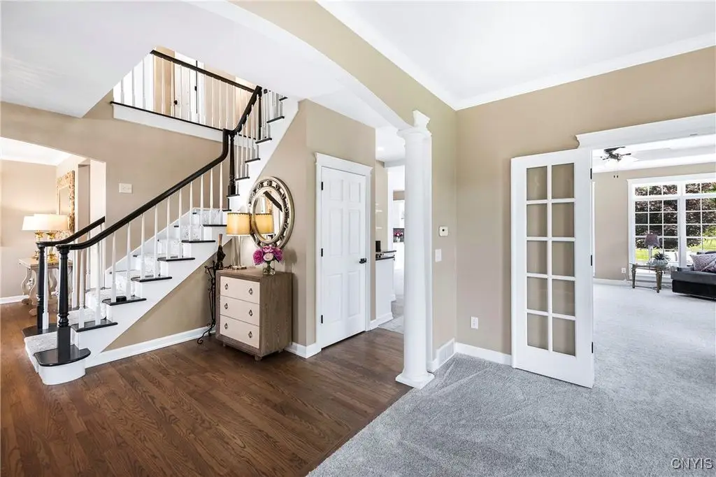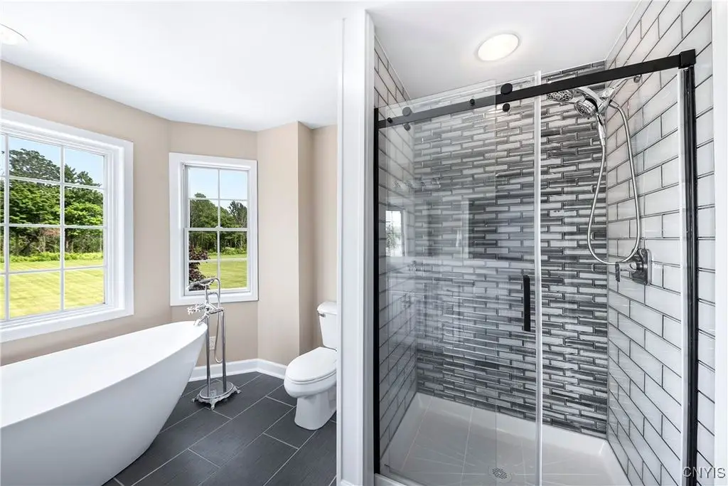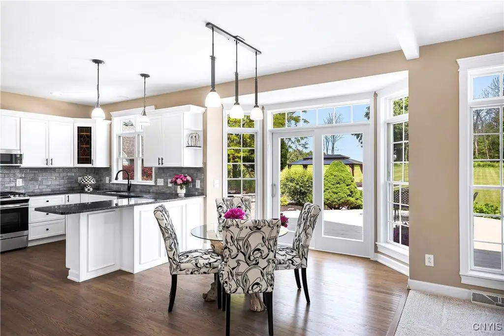 This magnificent custom-built Colonial residence is situated on over 18 acres of land, surrounded by beautifully landscaped grounds that enhance its overall curb appeal. The property features 4-5 bedrooms, two full bathrooms, and one half bathroom. As you step inside, you are greeted by a welcoming foyer, formal dining and living areas, and a recently updated kitchen with a convenient coffee station that flows into the cozy family room with a gas fireplace. The family room is bright and airy with plenty of windows and sliders that open up to the spacious back deck overlooking the lush yard. Additional amenities include a butler's pantry, mudroom with hooks, and a half bathroom. Upstairs, you will find a laundry room, a primary bedroom with an updated ensuite bathroom featuring a double vanity, soaking tub, tiled shower, water closet, and walk-in closet. There are also three more bedrooms, a bonus room above the garage that can serve as a fifth bedroom or office, and another updated full bathroom. The finished lower level offers an additional 1000 square feet of living space with a gas fireplace. Located in the award-winning Skaneateles school district and just a short drive away from schools and the village center, this exceptional property is truly a gem.
