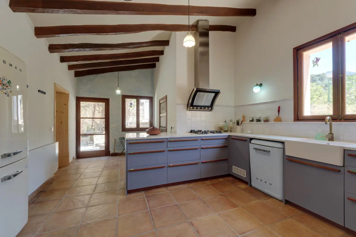 This beautiful finca is located in the Orange Valley near Soller, only about 10 minutes walk from the famous central market place with its bars, cafés and shops. The origin of the house goes back over 100 years and the careful renovation in 2022 has carefully preserved the style and the original. The beautiful garden with its 2805m2 is a true oasis of peace, the many fruit trees and palm trees create different areas to relax. The ensemble is completed by the old water fountain and the adjacent pool, as well as the wonderful summer kitchen and the various terraces. On the ground floor there is the entrance area, a spacious living area with pellet stove, the dining kitchen and two bedrooms, as well as a bathroom and WC. On the first floor there is a bedroom with en-suite bathroom and on the second floor another bedroom, also with en-suite bathroom. The equipment includes a modern heat pump, which cools or heats the house as needed. A private well supplies the house and the garden with water all year round via the irrigation system. There is also a carport and a charging station for electric vehicles.