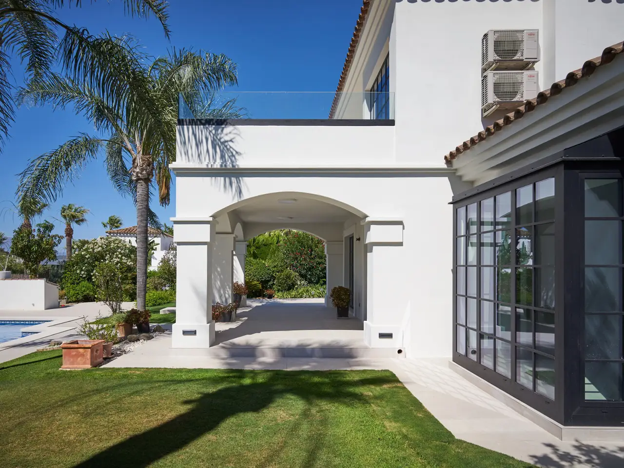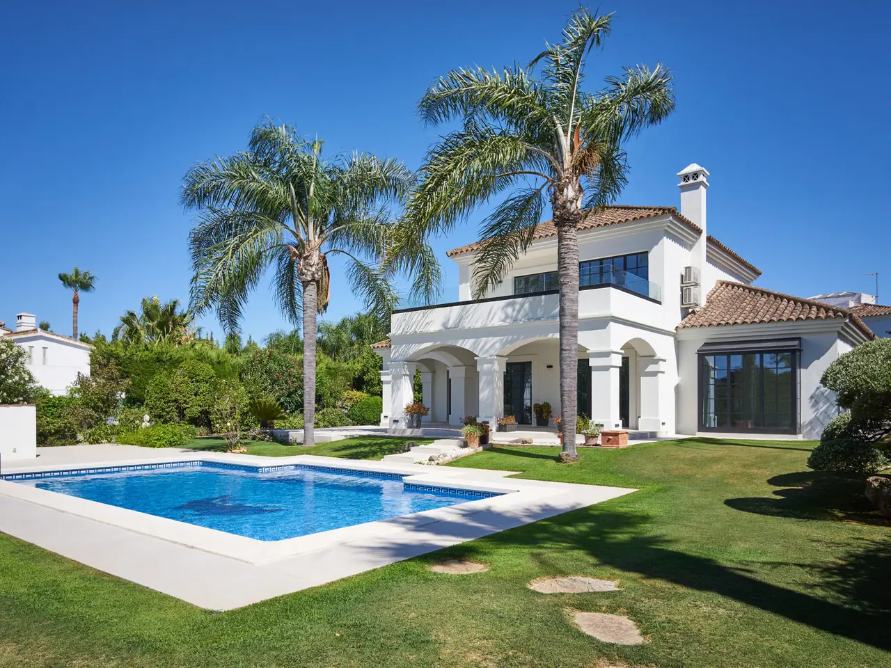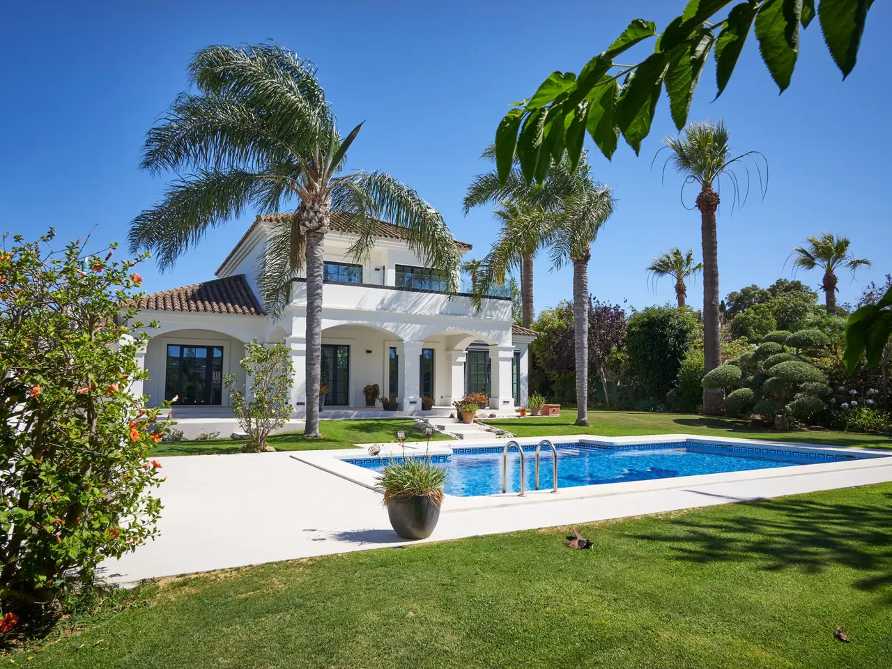 This extraordinary detached villa in Sotogrande Costa has been completely renovated in 2025 in line with the latest architecture and design trends. Generous spaces, abundant natural light and the integration of cutting-edge technology create an ideal setting both for year-round living and for enjoying holidays, combining comfort, aesthetics and functionality. The property offers three bedrooms. On the upper floor is the main suite, a private retreat with en-suite bathroom featuring a walk-in shower and bathtub, creating a true spa atmosphere. From here there is access to a large panoramic terrace with glass balustrade and open views over the lush garden, perfect for a first coffee of the day or to unwind at sunset. A spacious independent walk-in wardrobe, carefully designed to provide a sense of order and luxury, completes this room. The other two bedrooms are located on the ground floor and share a bathroom with shower, making this a very comfortable and practical home for the future; on this same level there is also a guest cloakroom, adding extra convenience to the day area. The main floor is laid out in an elegant open-plan concept that integrates living room, dining room and contemporary designer kitchen. Hidden within the kitchen is access to a multipurpose room and an additional room with bathroom. Large floor-to-ceiling Reynaers panoramic windows flood the interior with light and frame the outdoor scenery, visually linking the house with the garden and pool. The contemporary kitchen includes an integrated double-door fridge, wine fridge and hob with built-in extractor, as well as high-end Neff appliances that ensure efficiency and a first-class cooking experience. All bathrooms are fitted with Hansgrohe sanitary ware and electric underfloor heating, ensuring comfort all year round. In terms of climate control, the villa is equipped with a centralised hot/cold air-conditioning system. A marble-clad fireplace brings warmth and a sophisticated focal point to the living room. Reynaers carpentry guarantees excellent thermal and acoustic insulation. The property also enjoys a carefully landscaped private garden that frames the pool area and several outdoor seating areas. Outside, the villa preserves the classic charm of Andalusian cortijos, harmonised with contemporary lines and details. Its east–south–southwest orientation allows you to enjoy sunshine for most of the day and open views towards the mountains, the surrounding natural landscape, the golf course, the pool and the inner patio. The plot of approximately 1,335 m² accommodates a built area of about 372 m², plus 100 m² of covered and uncovered terraces, offering multiple corners for leisure and relaxation. The location is another of its great attractions: on the Costa del Sol, in a well-established residential area, just a step away from the beach and very close to prestigious golf courses, the marina, shops, services, international schools and the main hub of Sotogrande. The residential complex offers 24-hour security, gated access, electric shutters, reception service, fibre optic internet and excellent transport connections. The property benefits from a garage, covered and uncovered parking areas, independent laundry room and marble floors. Call us to arrange a viewing – it’s ready to move into!