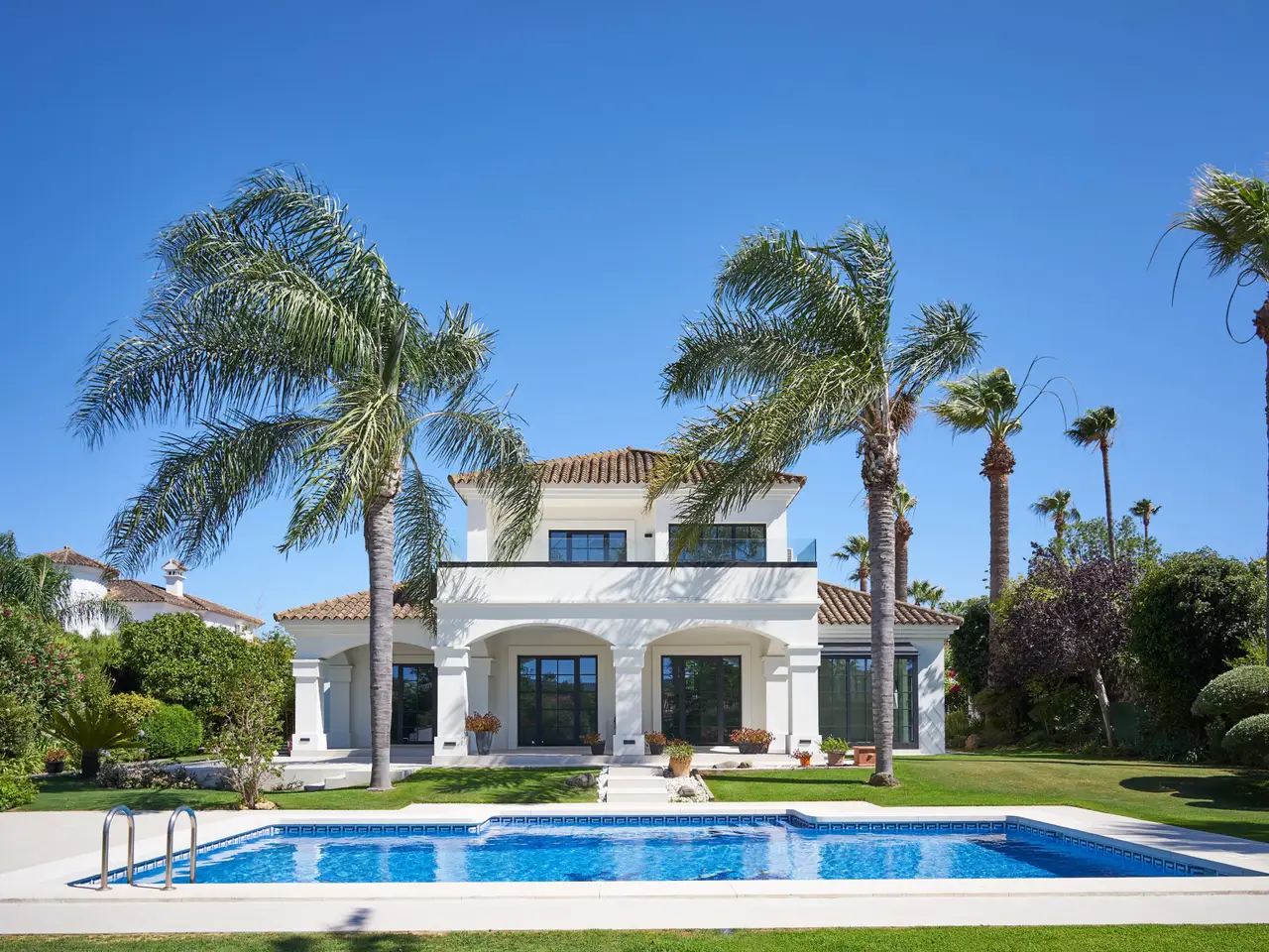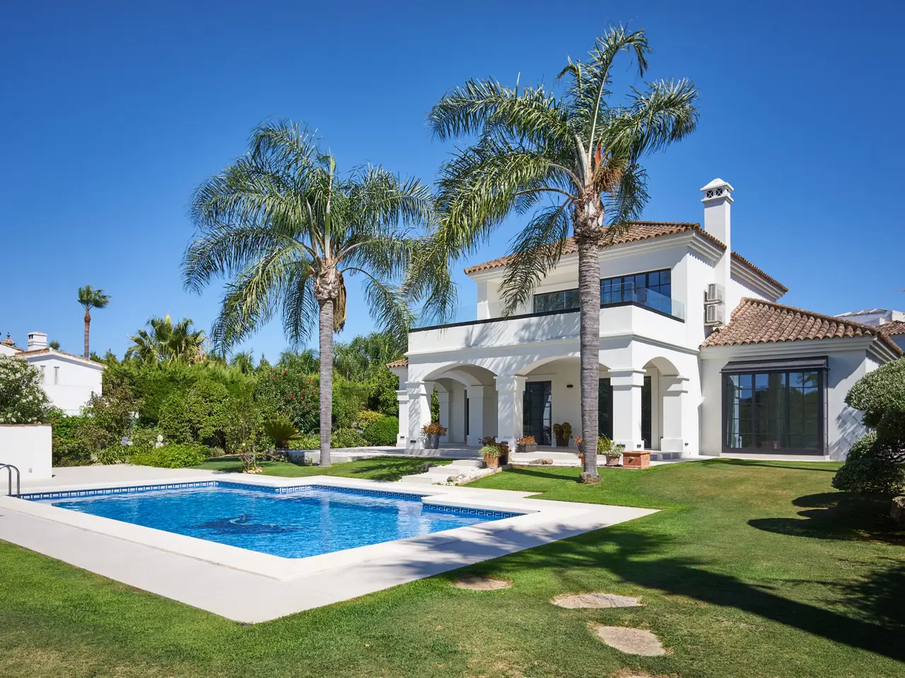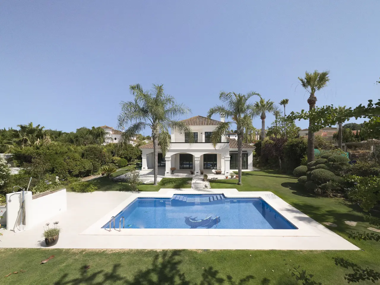 This extraordinary detached villa in Sotogrande Costa has been completely renovated in 2025 in line with the latest architecture and design trends. Generous spaces, abundant natural light and the integration of cutting-edge technology create an ideal setting both for year-round living and for enjoying holidays, combining comfort, aesthetics and functionality. The property offers three bedrooms. On the upper floor is the main suite, a private retreat with en-suite bathroom featuring a walk-in shower and bathtub, creating a true spa atmosphere. From here there is access to a large panoramic terrace with glass balustrade and open views over the lush garden, perfect for a first coffee of the day or to unwind at sunset. A spacious independent walk-in wardrobe, carefully designed to provide a sense of order and luxury, completes this room. The other two bedrooms are located on the ground floor and share a bathroom with shower, making this a very comfortable and practical home for the future; on this same level there is also a guest cloakroom, adding extra convenience to the day area. The main floor is laid out in an elegant open-plan concept that integrates living room, dining room and contemporary designer kitchen. Hidden within the kitchen is access to a multipurpose room and an additional room with bathroom. Large floor-to-ceiling Reynaers panoramic windows flood the interior with light and frame the outdoor scenery, visually linking the house with the garden and pool. The contemporary kitchen includes an integrated double-door fridge, wine fridge and hob with built-in extractor, as well as high-end Neff appliances that ensure efficiency and a first-class cooking experience. All bathrooms are fitted with Hansgrohe sanitary ware and electric underfloor heating, ensuring comfort all year round. In terms of climate control, the villa is equipped with a centralised hot/cold air-conditioning system. A marble-clad fireplace brings warmth and a sophisticated focal point to the living room. Reynaers carpentry guarantees excellent thermal and acoustic insulation. The property also enjoys a carefully landscaped private garden that frames the pool area and several outdoor seating areas. Outside, the villa preserves the classic charm of Andalusian cortijos, harmonised with contemporary lines and details. Its east–south–southwest orientation allows you to enjoy sunshine for most of the day and open views towards the mountains, the surrounding natural landscape, the golf course, the pool and the inner patio. The plot of approximately 1,335 m² accommodates a built area of about 372 m², plus 100 m² of covered and uncovered terraces, offering multiple corners for leisure and relaxation. The location is another of its great attractions: on the Costa del Sol, in a well-established residential area, just a step away from the beach and very close to prestigious golf courses, the marina, shops, services, international schools and the main hub of Sotogrande. The residential complex offers 24-hour security, gated access, electric shutters, reception service, fibre optic internet and excellent transport connections. The property benefits from a garage, covered and uncovered parking areas, independent laundry room and marble floors. Call us to arrange a viewing – it’s ready to move into!