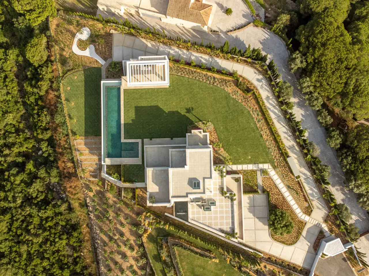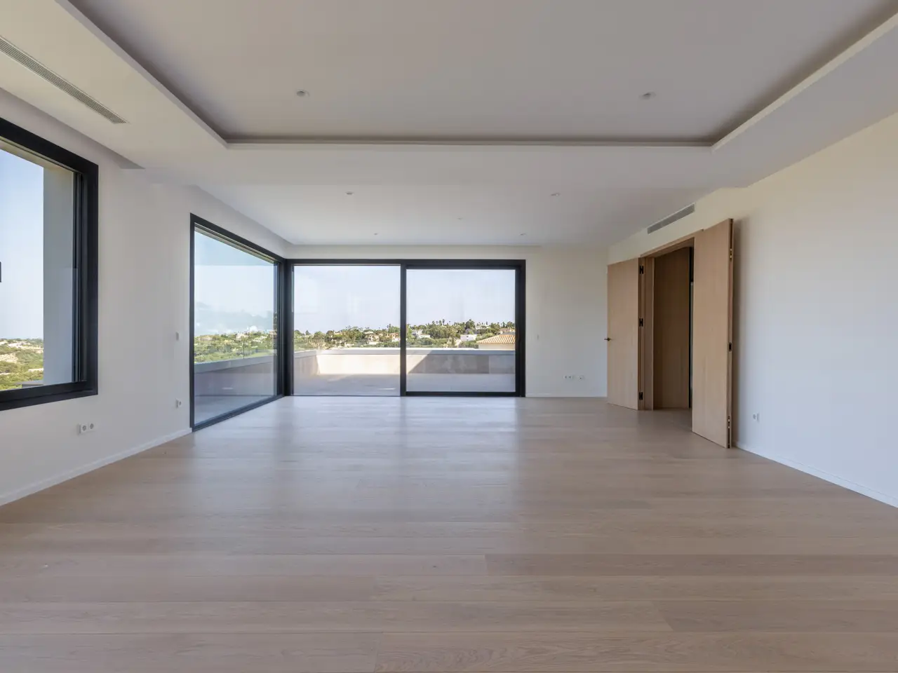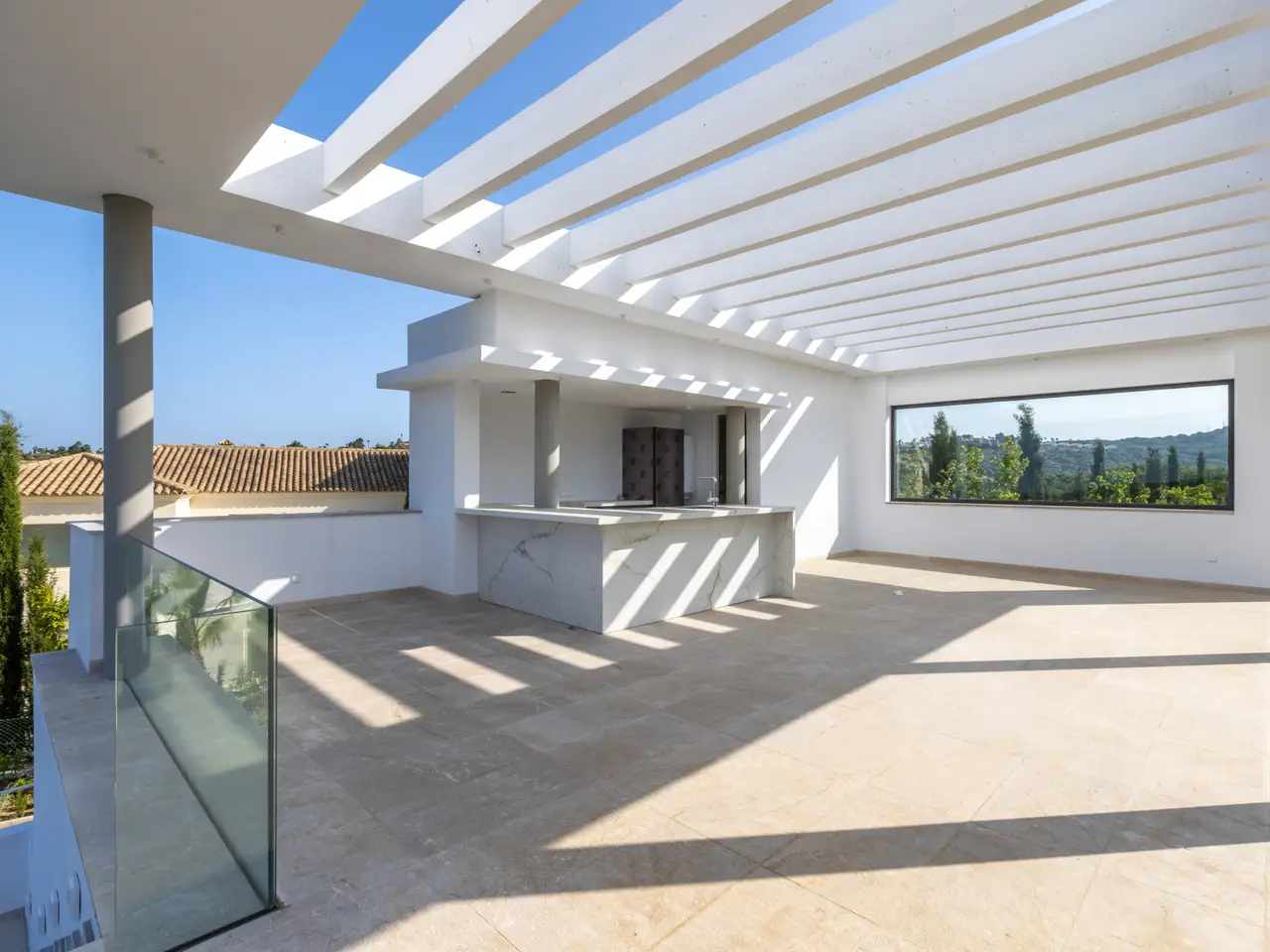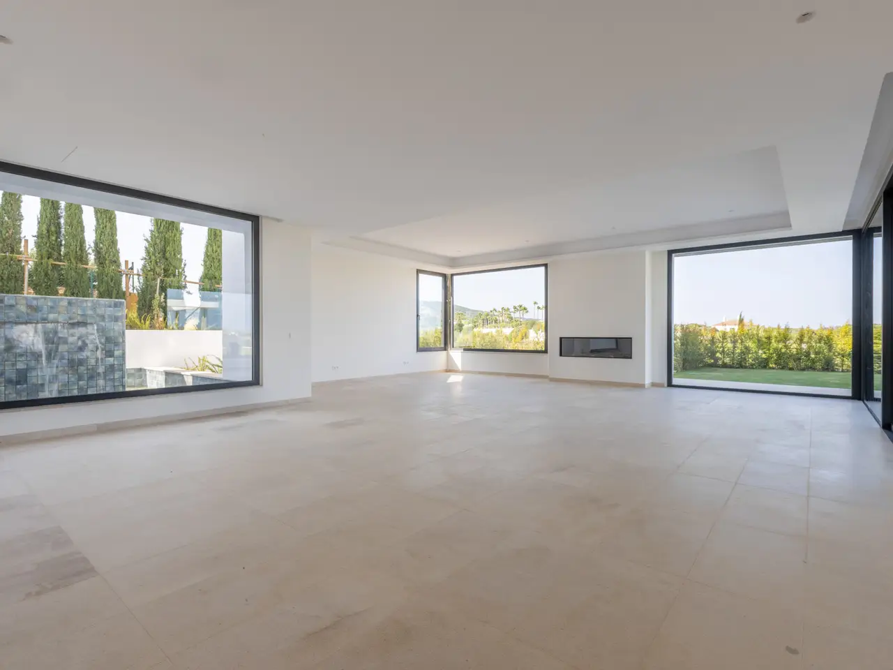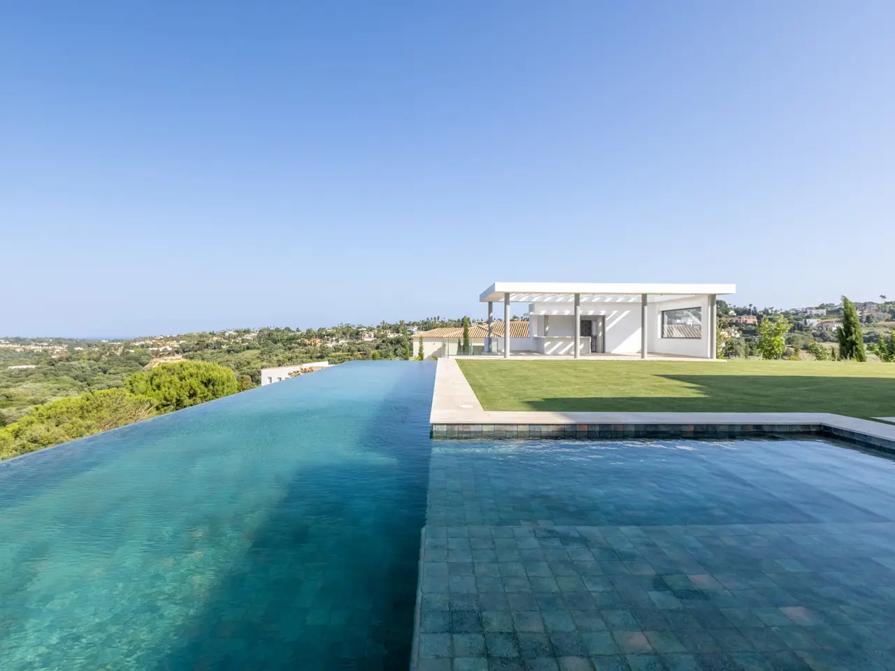 This incredible, recently built villa, located in a highly sought-after area, stands out for its spacious interiors, modern design, and spectacular panoramic views of the golf course, sea, and mountains. The villa sits on a generous 3,765 m² plot, offering a built area of 1,326 m² and an interior space of 920 m², complemented by a total of 308 m² of terraces and porches. The property features six bedrooms, seven full bathrooms, and an additional guest toilet, ensuring maximum comfort and privacy. Each room has been designed to provide brightness and spaciousness, and the property includes features such as underfloor heating throughout, air conditioning, central heating, smart home automation systems, and aerothermal technology. The layout also comprises a guest apartment, office, dressing room, main living room with fireplace, and several terraces (both covered and uncovered), including a solarium with breathtaking views. The exterior captivates with a meticulously maintained private garden, automatic irrigation system, and an impressive infinity pool that blends seamlessly with the landscape. The outdoor kitchen, fully equipped under a pergola, is ideal for enjoying barbecues and outdoor gatherings. The villa, located in a gated community with 24-hour security service, also boasts a private garage, storage room, elevator, accessible entrance for people with reduced mobility, and high-end finishes such as wooden floors and electric blinds. Thanks to its proximity to golf courses, the sea, marina, shops, schools, and all the amenities of Sotogrande, this villa represents a unique opportunity for those seeking exclusivity, privacy, and unparalleled views in one of the best residential areas of the Costa del Sol. Do not miss this opportunity and contact us for more information.