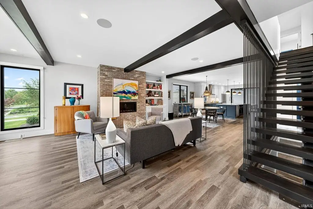 This STUNNING 4-bedroom, 3.5-bath home in the sought-after Riverwalk subdivision blends timeless style with modern convenience. Step inside to soaring ceilings, sun-filled spaces, and an open floor plan perfect for entertaining or everyday living. The gourmet kitchen with Bosch appliances flows seamlessly into the dining and living areas, where large windows frame serene views of the St. Joseph River and a cozy fireplace creates the perfect gathering space. Upstairs, the private primary suite offers a spa-like bath and its own deck ideal for quiet mornings or unwinding at the end of the day. The finished lower level is an extension of the home, complete with a media-ready family room, a full bathroom, and a private bedroom, perfect for guests or multigenerational living. Outdoors, multiple patios and decks provide spaces to relax or entertain. This home is as smart as it is beautiful, with integrated lighting, security, and whole-home audio making comfort and convenience just a tap away. Perfectly located 1.6 Miles from the University of Notre Dame. Close to local parks, shopping, and dining, Riverwalk living means every day feels like the best of both worlds, peaceful retreat and connected lifestyle.