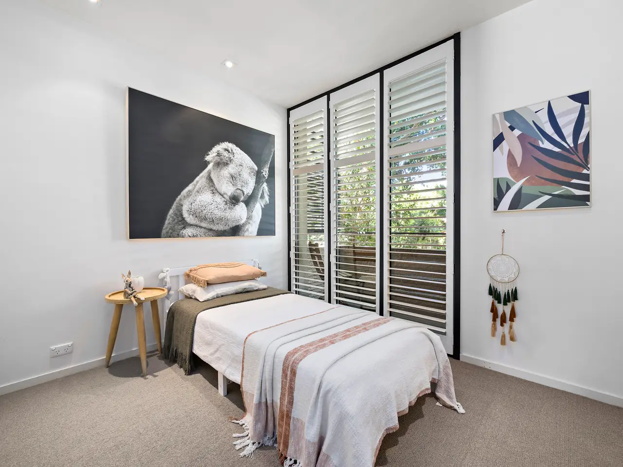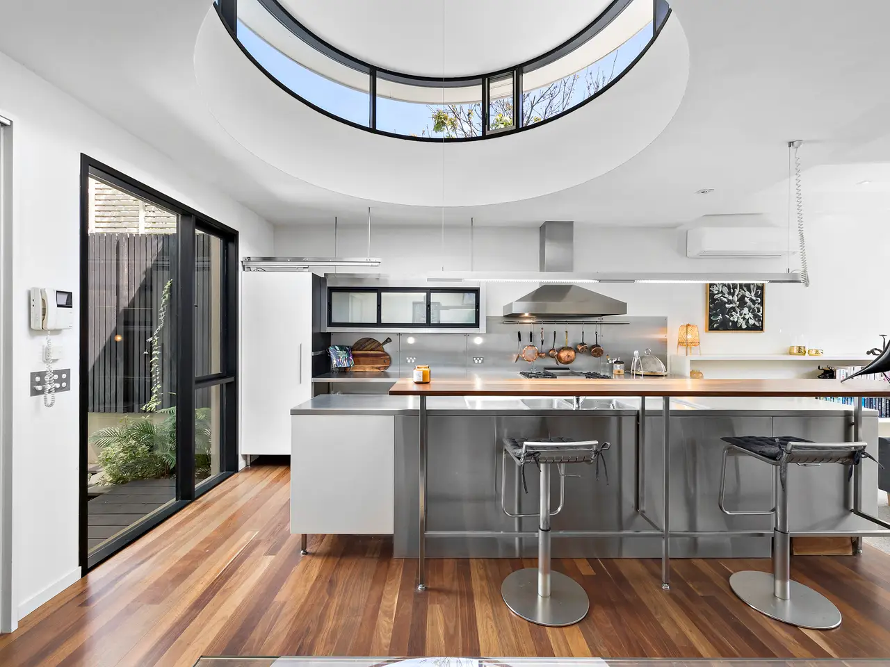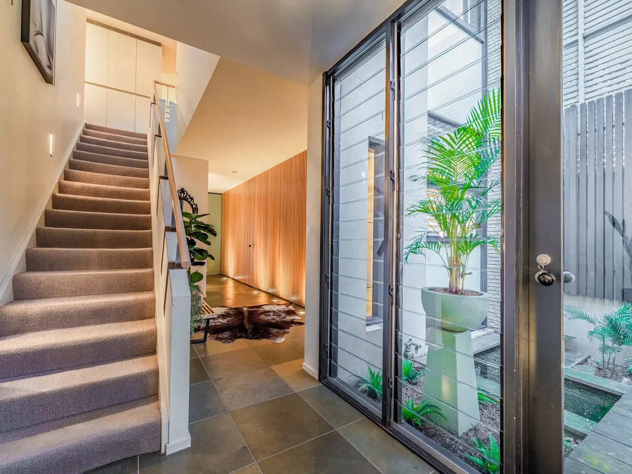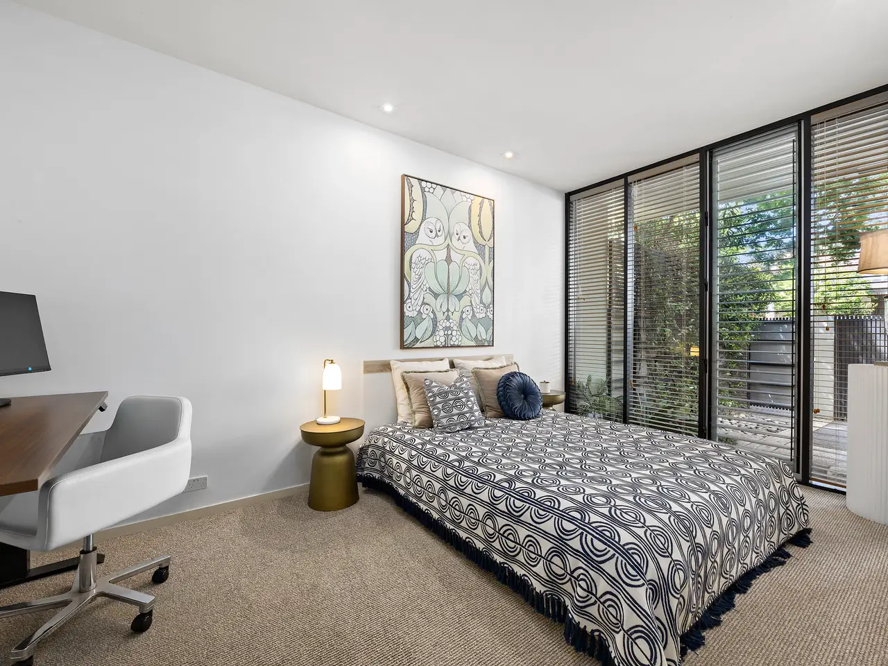 Designed by award-winning architect Peter Maddison of Grand Designs, this exceptional town residence showcases quality materials and exquisite craftsmanship throughout. The home greets you with a wide entrance hall featuring polished stone flooring and a striking skylight. The chef's kitchen boasts high-quality stainless steel appliances, open shelving, large wall refrigeration cabinets, and flows seamlessly into a spacious, light-filled living and dining area. A large sliding door opens to a sunlit entertainer's courtyard complete with a built-in table, seating, and a glorious gas log fireplace. Additional main-floor features include abundant storage, a versatile home office/study or guest bedroom, and a European-style bathroom and laundry with heated floors. Upstairs, the generous master bedroom with built-in robes adjoins an elegant central bathroom. Two more bedrooms and a private east-facing balcony complete the level. This low-maintenance property is equipped with heating and cooling throughout, excellent security, ample storage, a spacious outdoor area, and a single lockup garage with optional off-street parking for an additional car. Perfectly situated near Hawksburn Village and Chapel Street, the location offers boutique shopping and diverse dining options. Hawksburn Train Station is a mere 3-minute walk away, with just three stops to the city. Experience cosmopolitan living at its finest. Don't miss your chance to make this extraordinary property your own!