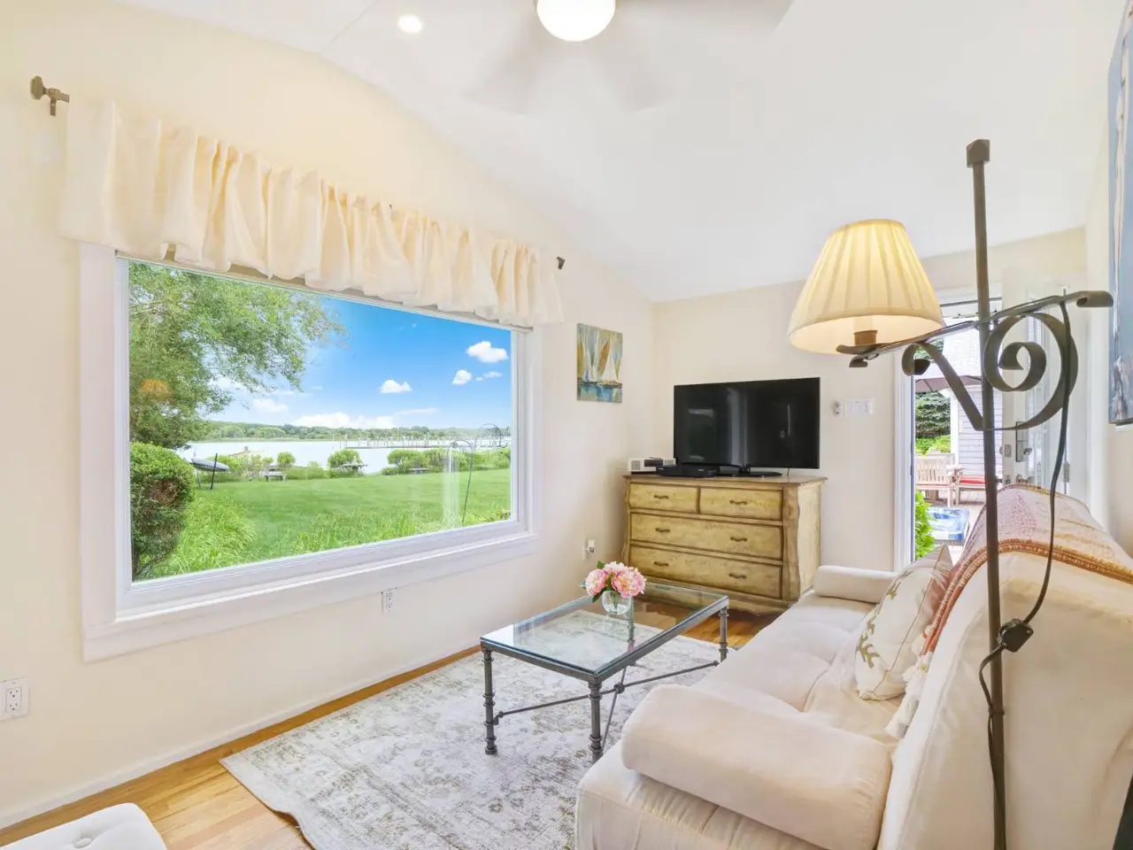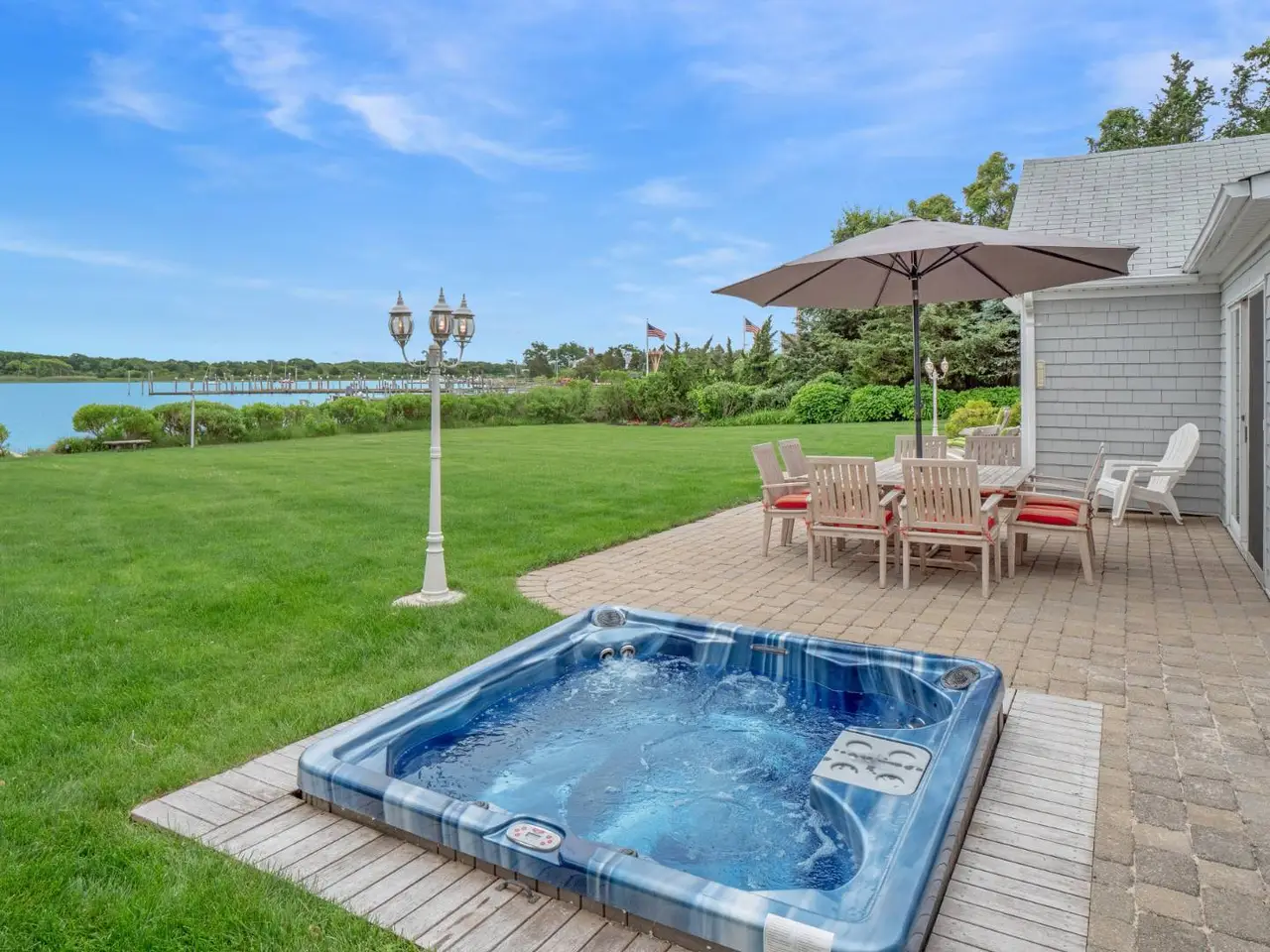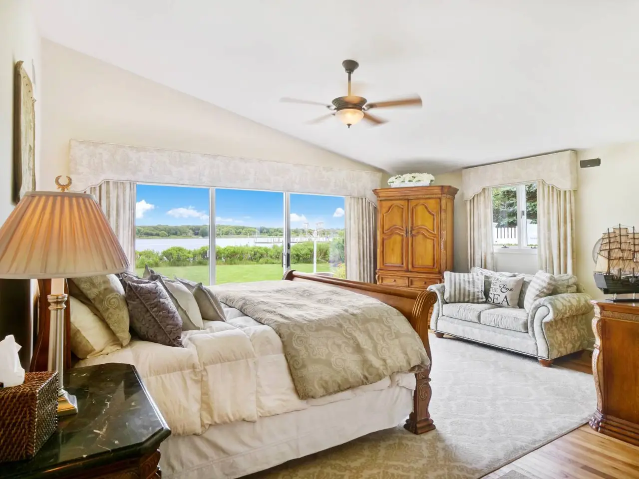 This charming and private waterfront cottage features a living room with vaulted ceilings and fireplace, as well as a library, dining area, and new country kitchen. The decor is light and airy for a peaceful experience. All rooms open to an aged patio with teak furnishings. This beautiful home also includes a heated gunite pool, hot tub, and 20-foot dock. A separate guest bungalow comes complete with one bedroom and one bathroom. Two-car detached garage. The views offer vistas of open space that are mesmerizing. Lush vegetation in the backyard ensures privacy.