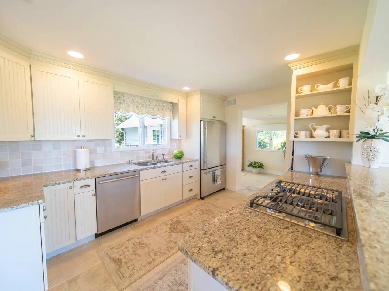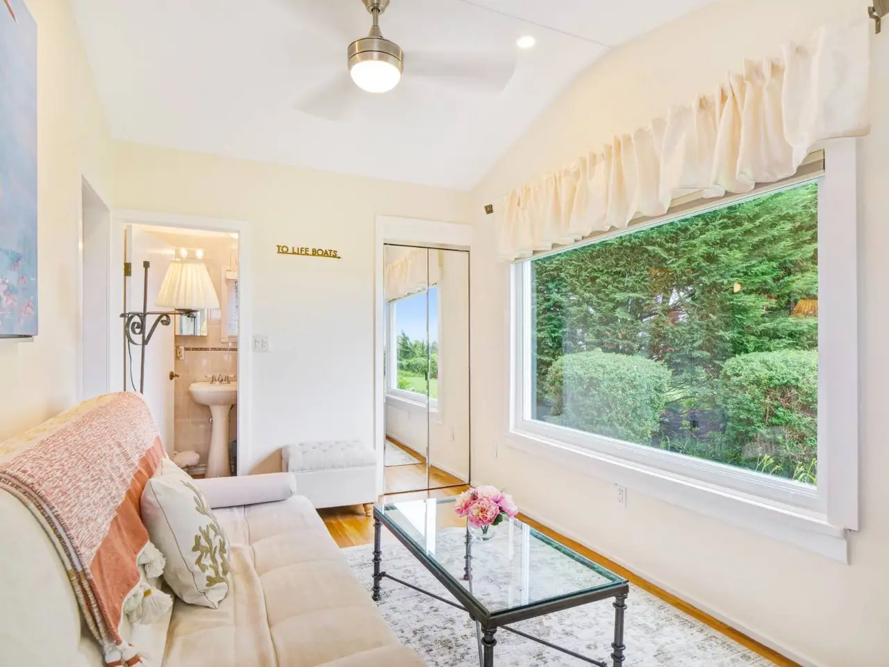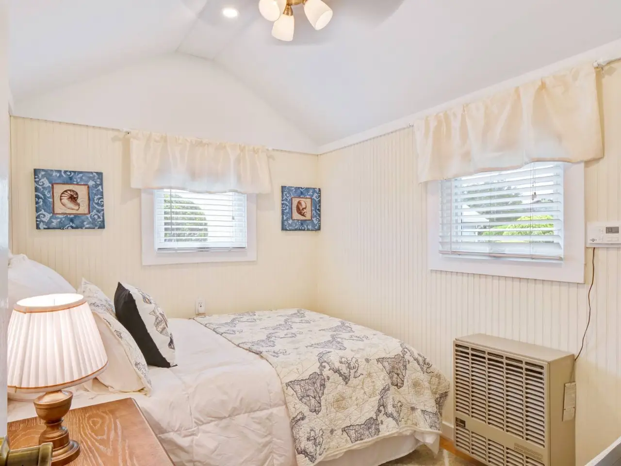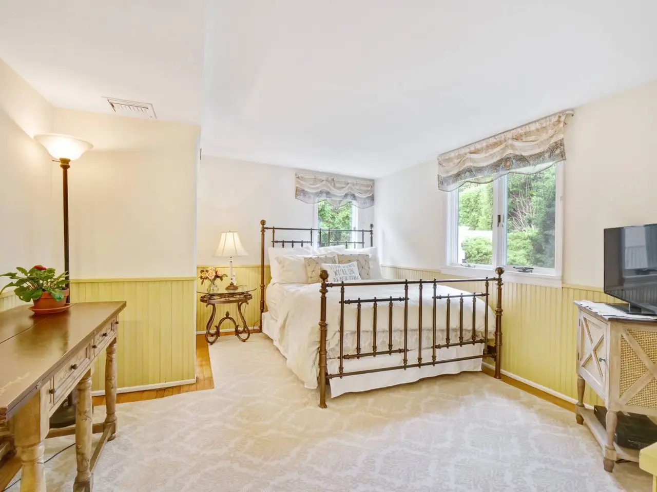 This charming and private waterfront cottage features a living room with vaulted ceilings and fireplace, as well as a library, dining area, and new country kitchen. The decor is light and airy for a peaceful experience. All rooms open to an aged patio with teak furnishings. This beautiful home also includes a heated gunite pool, hot tub, and 20-foot dock. A separate guest bungalow comes complete with one bedroom and one bathroom. Two-car detached garage. The views offer vistas of open space that are mesmerizing. Lush vegetation in the backyard ensures privacy.