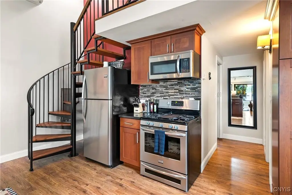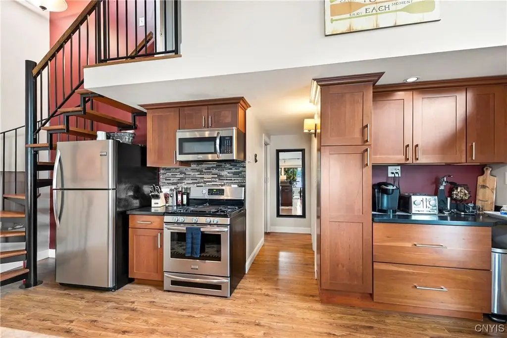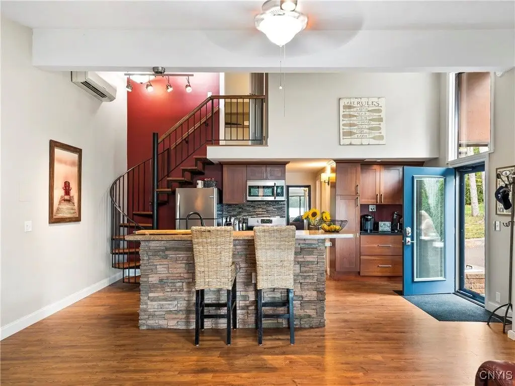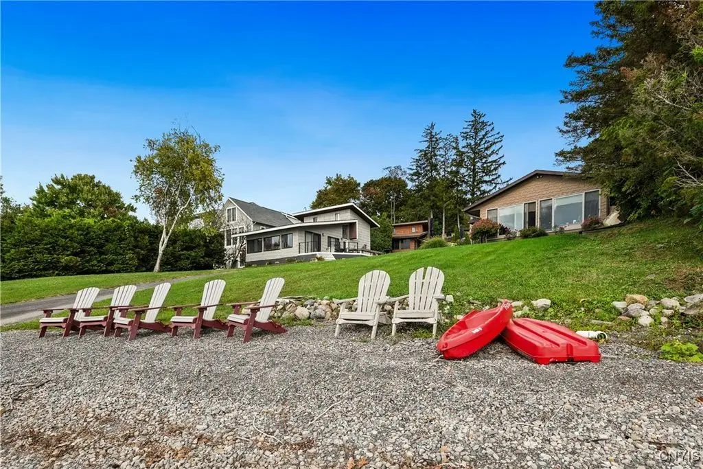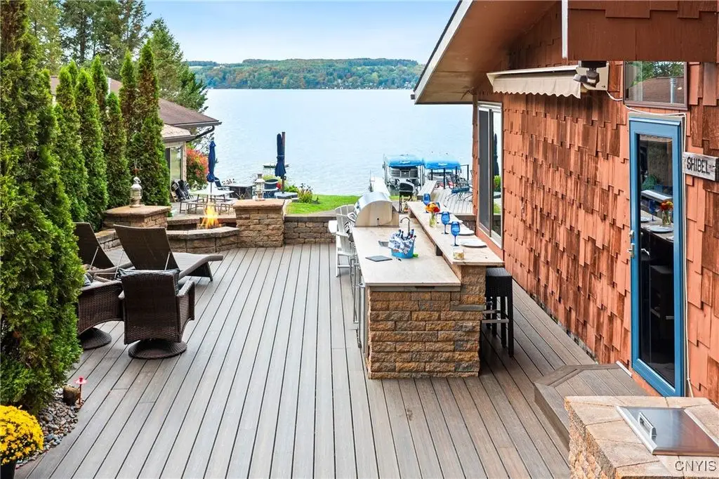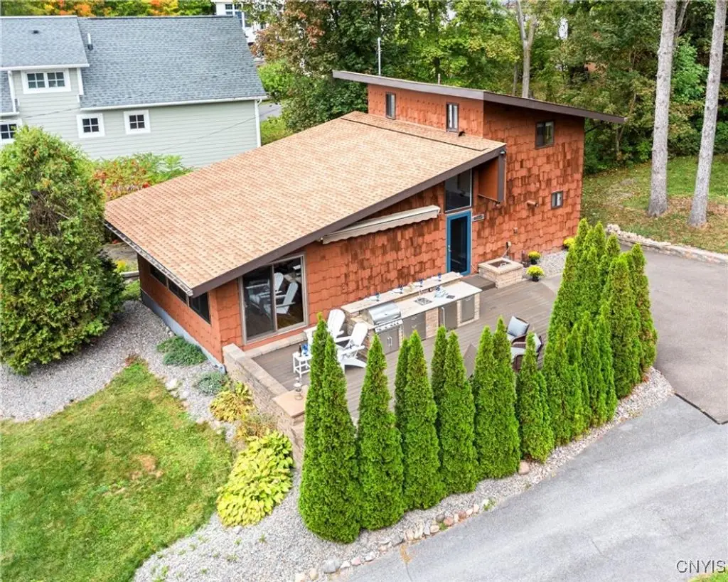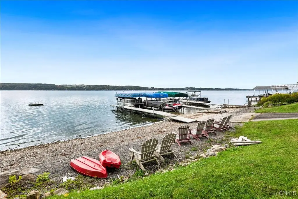 Welcome to Leopold Lodge, LLC - Cottage "C" on Skaneateles Lake. Located just 4 miles from the picturesque village of Skaneateles, this beautifully updated retreat offers breathtaking lake views and spectacular sunsets. Cottage "C" offers parking at your door step and features 2 bedrooms and 2 full baths. The space has been thoughtfully designed for both comfort and style. The kitchen is a true highlight with Kraftmaid cherry cabinetry, granite countertops, a center island with seating, and stainless-steel appliances - all flowing seamlessly into the bright living area with panoramic lake views. On the main floor, you'll find a bedroom currently set up with two twin beds and a full bath with walk-in shower conveniently across the hall. A stacked washer/dryer and on-demand hot water add everyday ease. Upstairs, a spiral staircase leads to the spacious primary suite with private ensuite. Outdoor living takes center stage here with sweeping lake views from the private composite deck. The fully equipped outdoor kitchen, complete with granite countertops, propane grill, refrigerator, bar sink, abundant prep and dining space, and a power awning for shade, provide ample space for entertaining. Gather around the cozy fire pit or simply relax and take in the view. With a mini-split system and natural gas fireplace, you'll stay comfortable whatever the weather, while level access to the pebble beach and waterfront mere steps from your door make lake living effortless. Leopold Lodge encompasses 1.3 acres with 99 feet of pristine Skaneateles Lake frontage, shared by five cottages in this truly special community. Ownership includes 20 shares (one-fifth interest) along with exclusive use of Cottage "C." Owners enjoy benefits such as boat hoist rights, use of common areas, shared maintenance expenses, and low, low property taxes! Just pack your bags - Cottage "C" is move-in ready and waiting for you to enjoy the very best of Skaneateles Lake living.