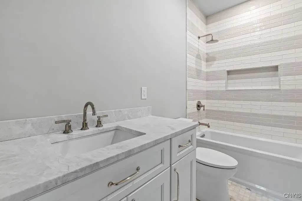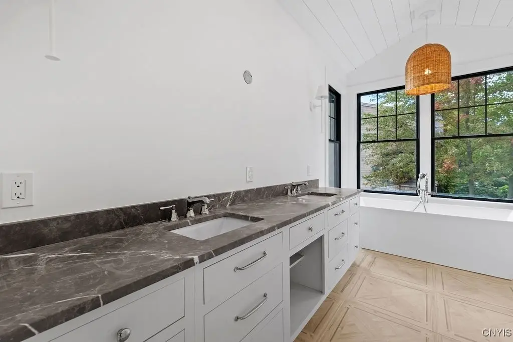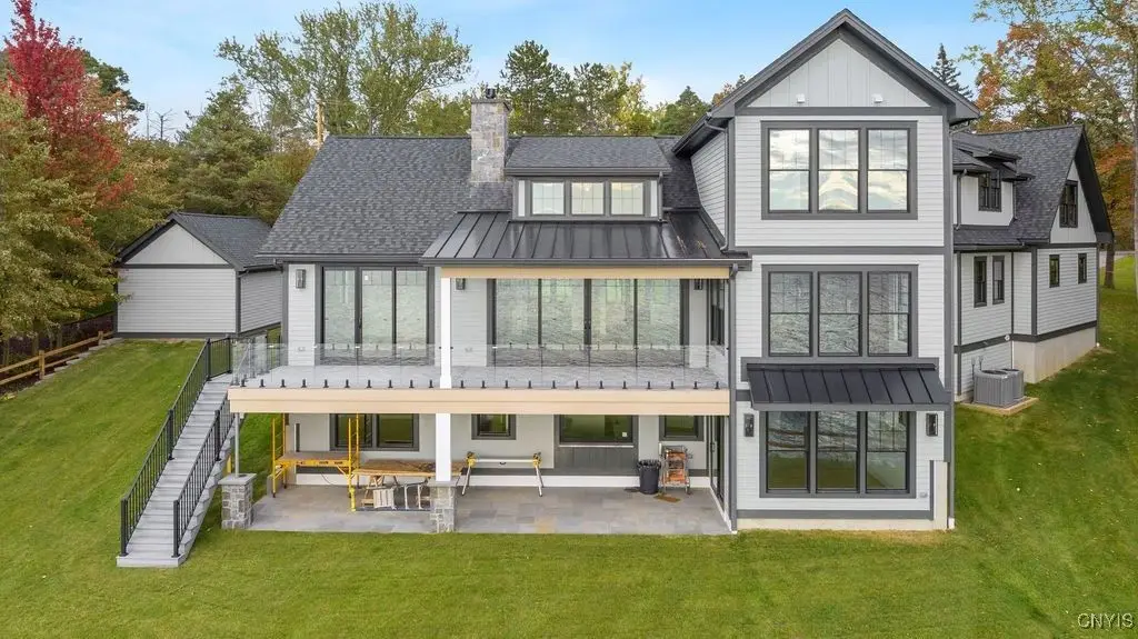 Gorgeous newly built home perched above the crystal clear waters of Skaneateles Lake. This stunning property boasts over 100 feet of private waterfront. The home is designed with meticulous attention to detail and features high-end finishes throughout. The open floor plan on the first floor includes a custom chef's kitchen with beautiful wood cabinets, quartz countertops, and top-of-the-line appliances. Large windows provide breathtaking views of the lake from every room. The vaulted ceilings with custom beams and stone gas fireplace add a touch of elegance to the space. The first floor also includes an office with custom built-ins, a primary bedroom with sliding glass doors to the deck and a luxurious ensuite bathroom, as well as a half bath and laundry room. Upstairs, you'll find a bunk room and two additional bedrooms, each with their own private ensuite baths. The partially finished walk-out lower level features a family room with a fireplace, a second kitchen, a second laundry room, and a bedroom and full bath. The property also includes an attached two-car garage and a separate one-car garage. Situated on a private lane just outside the village center, this home is located in the highly acclaimed Skaneateles School district.