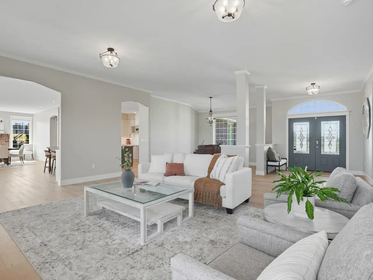 Timeless Brick Rancher situated on 13.21 fully fenced and gated acres, offering privacy and luxury. This 4,730 sq. ft. home has been tastefully updated from top to bottom with high-end finishes, including stunning engineered hardwood floors, a gourmet kitchen featuring a custom walnut-topped island, high-end appliances, RO water, and quartz countertops throughout. The primary bedroom feels like a retreat with a 5-piece ensuite and direct access to the large trex deck, which offers incredible views of the countryside. Downstairs, you will find a spacious daylight walkout basement complete with an oversized living room, game room, home gym, and wet bar. The recently constructed, 4-tier water feature, hardscaping, and landscaping are equally impressive as the home. The property also includes a sports court and a massive 65 x 40 insulated shop, complete with a workshop area, loft, and 3 RV hookups, a whole-house generator, and more! This home harmonizes luxury, practicality, and accessible country living.