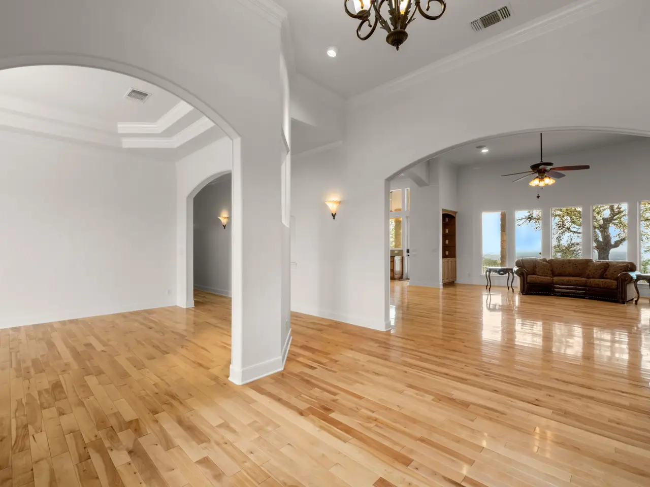 • Soaring ceilings with oak wood flooring