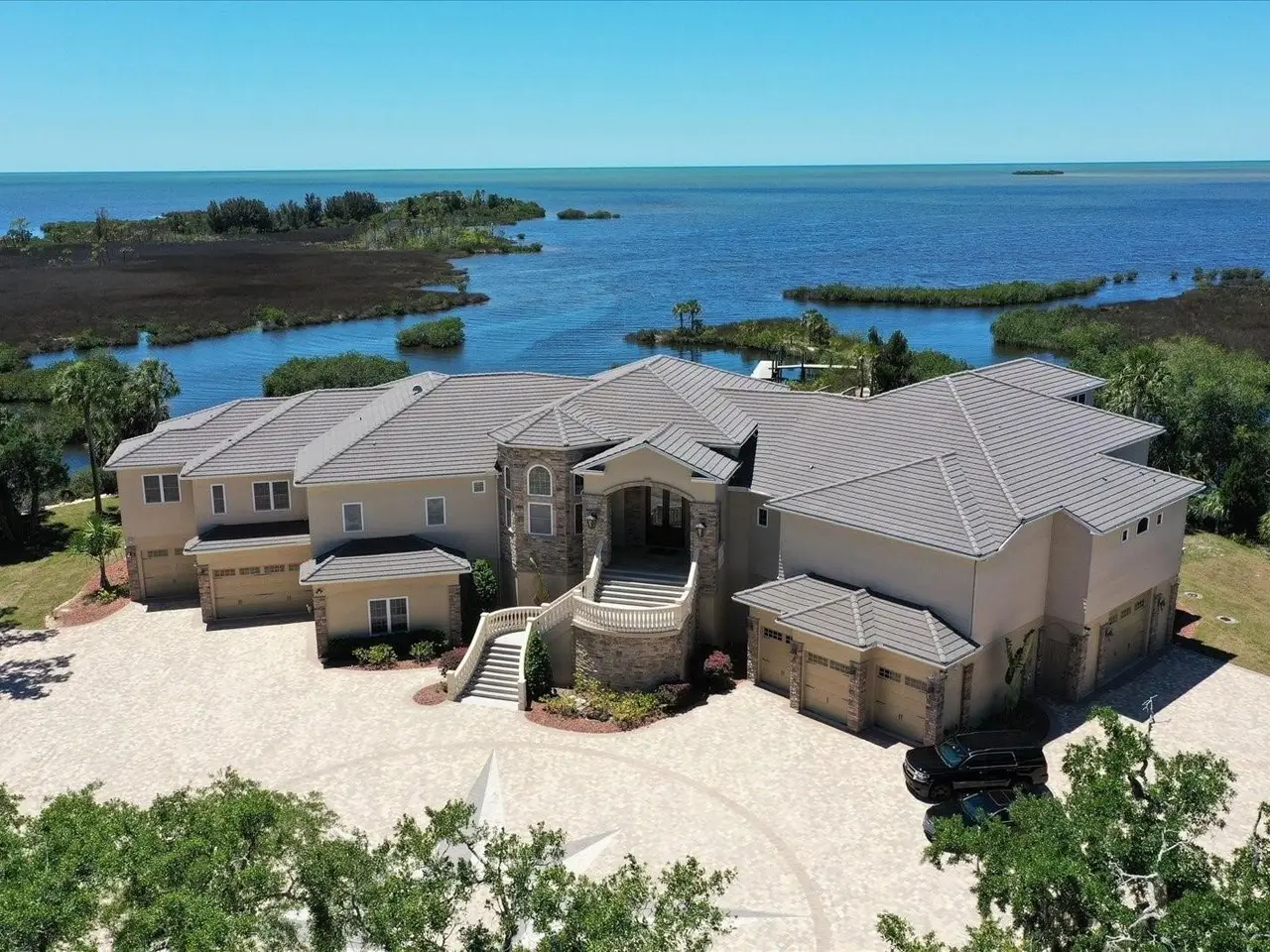 BUILT TO WITHSTAND A CAT 5 HURRICANE, LIVING SPACE OF THE HOME COMPLETELY UNTOUCHED BY HURRICANE HELENE! Some repairs being made to outbuildings and garage doors below the home. MOVE IN READY! TROPICAL GULF OF MEXICO LUXURY ESTATE – This stunning Gulf front property, comprised of over 23 acres, with over 1,100 feet of waterfront on the Gulf of Mexico, with incredible water views from every room is a one-of-a-kind opportunity. The residence is comprised of 5 bedrooms and 5/2 bathrooms in over 8,950 sq ft of living area. Bathed in sunlight, the split plan residence comprises a large entrance hall, living room, generous dining room, butler’s pantry, gourmet kitchen, 350-bottle wine cellar, large walk-in pantry, informal dining area, family room, billiard room, library, professional built 28 seat home theatre, exquisite master suite, opulent en-suite, all showcasing breathtaking views of the Gulf of Mexico. Gated, safe & secure, with a generator that will run the entire home for a month. Outside, a magnificent west facing terrazzo terrace extends the entire length of the home, with an outdoor kitchen with breathtaking Gulf views. Outdoor highlights also include a boat ramp, rustic boat house, a historical rustic guest house, a bridge which leads to an island with a floating boat dock, and double (lighted) tennis courts all amid the beautiful coastal wilderness. A car collectors dream featuring a 40+ car garage, with height for car racks and 12 garage doors, including a utility door, for Helicopter or RV and spans the entire space under the home. The 30,000 sq. ft. motor court makes landing a helicopter easy! The region is a prime spot for water sports and fishing. One of Florida’s most captivating Gulf Coast homes, this private, opulent home is cleverly designed to maximize its position overlooking the Gulf of Mexico.