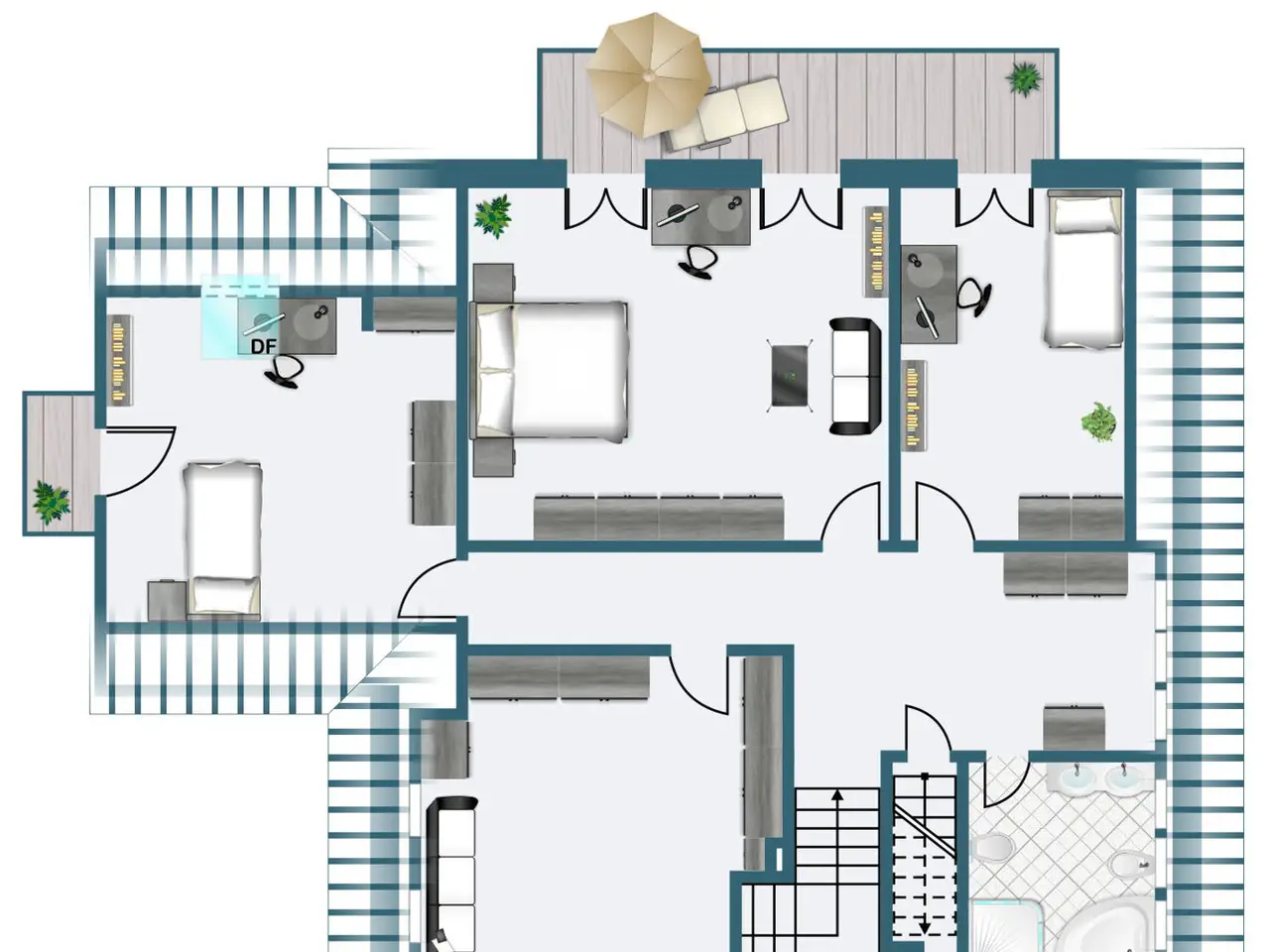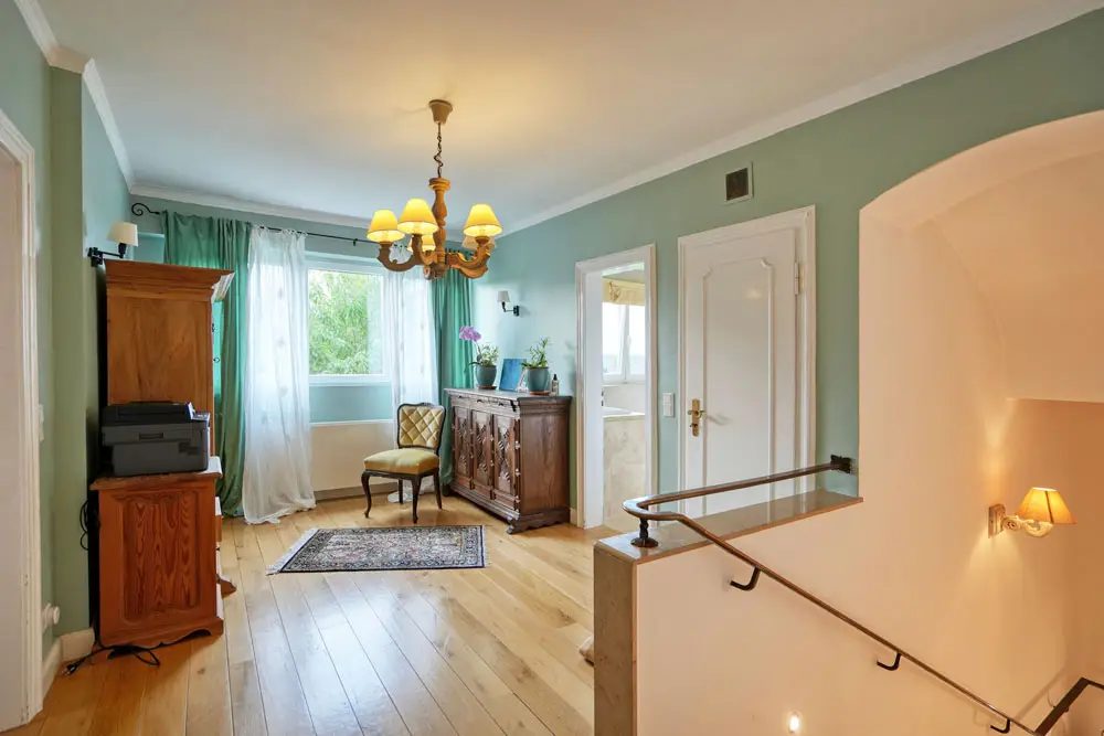 This exceptional property radiates great solidity. The generously proportioned detached house was built around 1951 in solid construction as a manufacturer's villa and furnished to a very high standard. It was extensively modernized in 2012-2015 and carefully maintained on an ongoing basis. It has a very bright and friendly design and is exceptionally well maintained. On the first floor, starting from the vestibule, there is a checkroom and guest WC on the right-hand side and a spacious hallway with the staircase to the upper floor and access to the spacious living area on the left-hand side. This is equipped with a fireplace and has a conservatory-like room attached to the side. From the living room and the adjoining dining room there is access to the very large terrace and from there to the park-like garden. The dining room is adjoined by the well-equipped kitchen, which offers space for a further dining table. On the upper floor, the central hallway provides access to the three children's or guest bedrooms, the children's bathroom and the parents' area. This consists of a dressing room in the transition to the large bedroom and the bathroom, which is equipped with a large shower area and free-standing bathtub, two washbasins, WC and bidet. All bedrooms have access to balconies of various sizes. The loft is completely converted into a living area and offers plenty of space for playing and/or working. There is also a shower room here. The full basement offers plenty of space for the utility rooms as well as for a living room-like room that is used as a home office. The garden has park-like dimensions and is attractively landscaped, with spacious lawns, shrubs and an outdoor pool, which is currently disused. A car garage and several parking spaces in front of the house round off the offer. Part of the plot could optionally be separated off for further development. An energy certificate is currently being prepared.