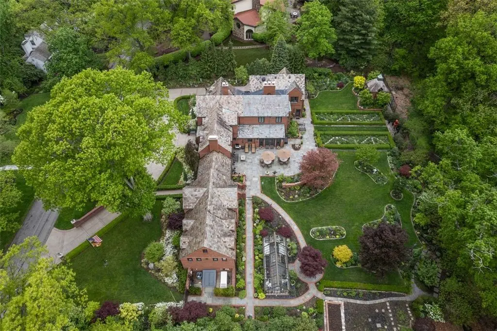 An extraordinary offering in Upper St. Clair, this English Manor Tudor estate pairs timeless architecture with refined modern living. Privately set on nearly an acre beside historic Gilfillan Farm, the 4+ bed, 3.5 bath home exudes quiet sophistication. Rich in character and craftsmanship, it features artisan millwork, stained glass windows, arched doorways, and a graceful layout ideal for both everyday living and elegant entertaining. A chef's kitchen with Subzero/Thermador appliances and walnut and quartzite counters, first-floor owner's suite with den and custom closets, and an elevator enhance comfort and convenience. Professionally designed gardens envelop the home with year-round beauty, offering serene outdoor spaces and a rare sense of privacy. Just minutes from schools, parks, and amenities, this is a rare opportunity to own a legacy property where heritage, design, and natural beauty converge in perfect harmony. A truly distinguished home for the discerning buyer.
