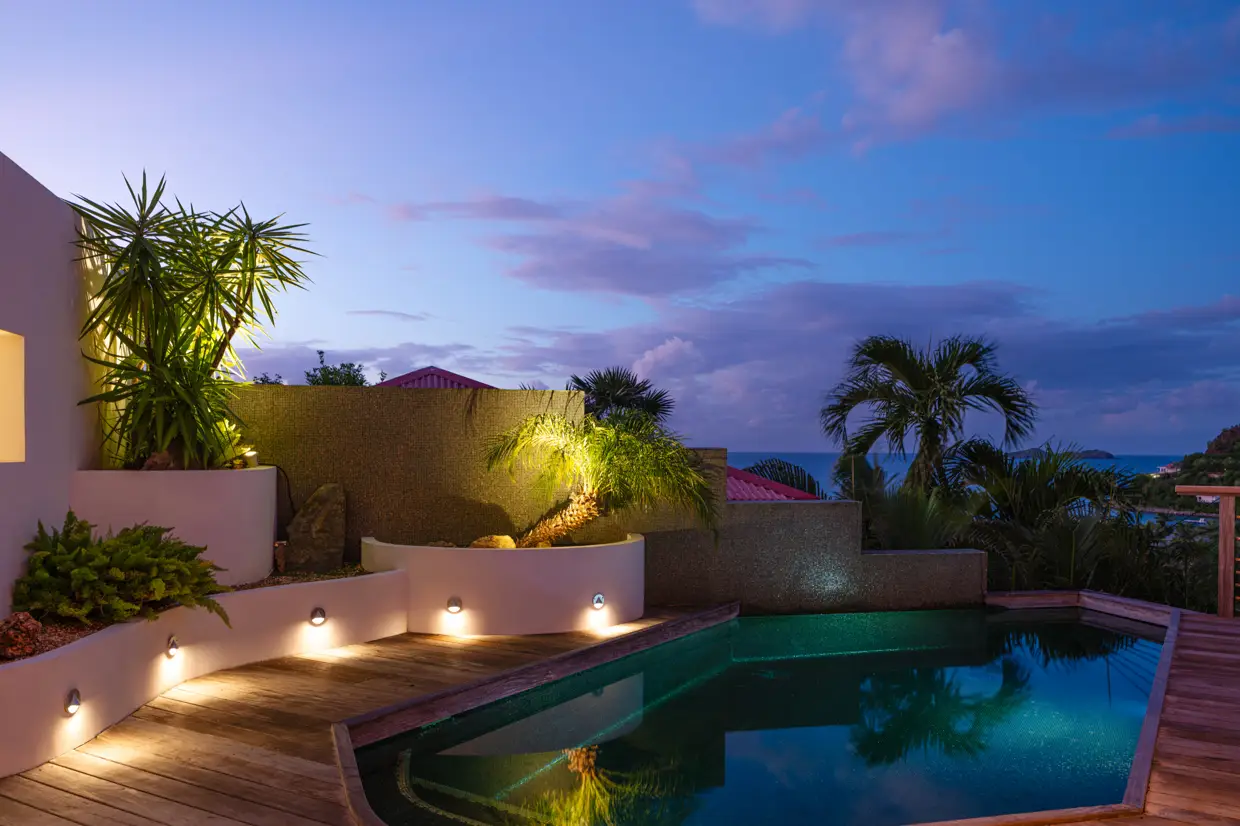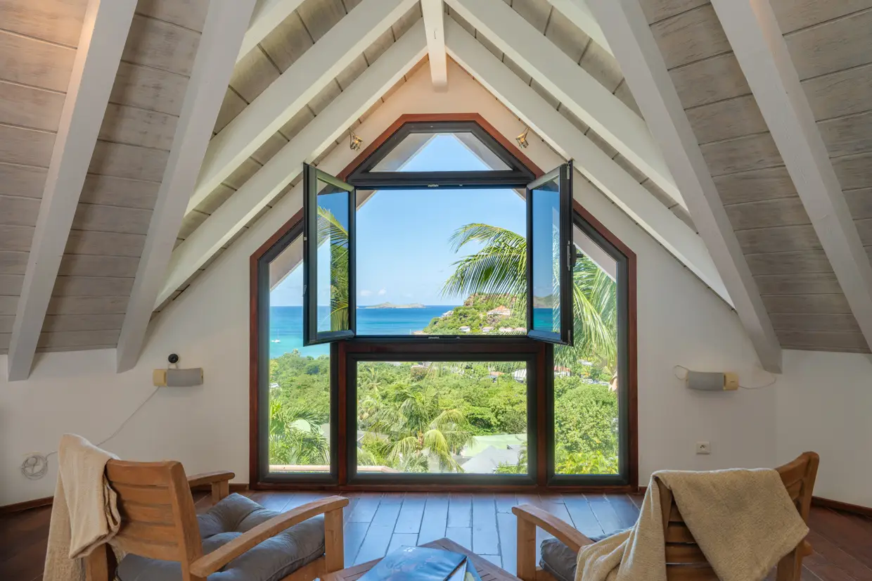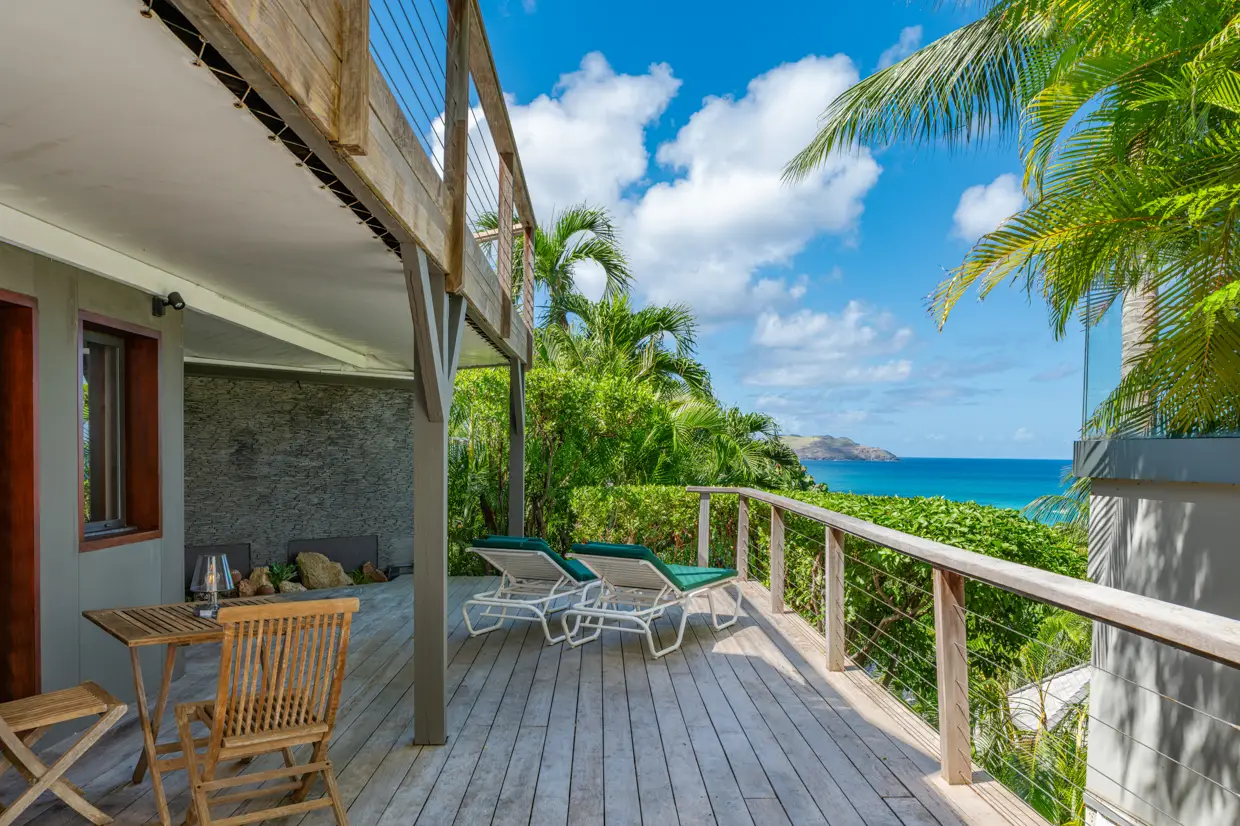 Casa Armor property enjoys a pleasant living environment, just steps away from the beach, restaurants, and amenities of Saint-Jean. It offers a stunning view of the turquoise waters of the bay and the islets that frame the scene beautifully. Spread over two levels with a functional layout, its design is highlighted by its striking red facade, adding a modern and unique touch. Currently divided into two independent apartments, the villa can be maintained as is or transformed into a four-bedroom home. The two sections are connected by a staircase while maintaining separate entrances. On the main level, the entrance leads to a bright living area, which includes a lounge and dining space as well as a fully equipped kitchen. The room opens onto a terrace, perfect for enjoying the view and relaxing by the pool. The sleeping area includes two comfortable bedrooms, each with its own private bathroom. One of the bedrooms opens onto a small garden, while the other is located on a mezzanine. On the lower level, the second apartment features its own kitchen and two equally sized bedrooms with en-suite bathrooms. A long terrace surrounded by tropical vegetation provides a peaceful setting for relaxation, while a stone-paved outdoor courtyard completes the ensemble. Casa Armor offers several possibilities for layout and renovation, allowing you to customize the space to suit your desires.