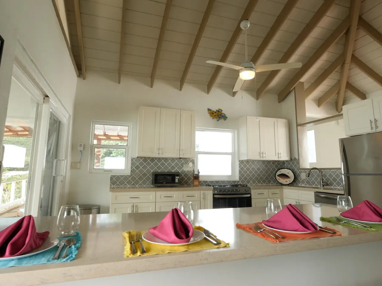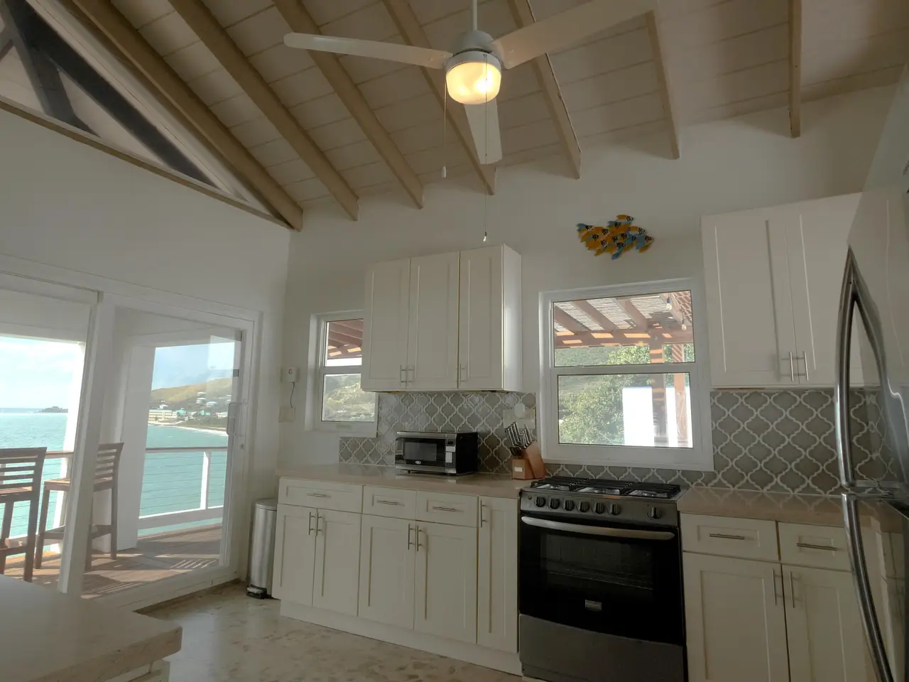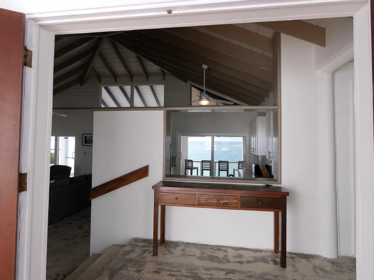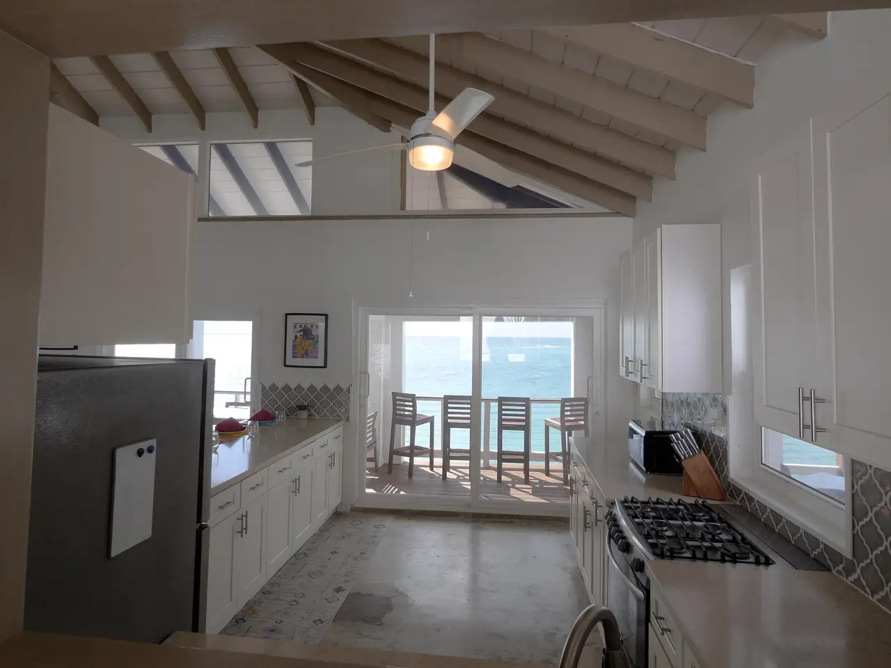 'Pelican Perch is lovelier than the photos online show...the villa is beautiful! More than that, waking up every morning to the sounds of the surf, sipping coffee out on the deck while watching the pelicans dive for fish and the sea turtles surfacing for air was PURE MAGIC!!' ...excerpt from recent guests' VRBO review... Clean lines and an elegantly simple island-style interior await you at Pelican Perch. Anchored by a breezy or air-conditioned bedroom and bath on either side of a comfortably casual open living/dining/kitchen space with soaring ceilings. Open the full wall of glass sliding doors to incorporate the breathtaking beauty of Mother Nature with the indoors...our dramatic setting ''on the rocks'' offers endless views beyond the horizon! Two-story guest cottage is a BONUS!