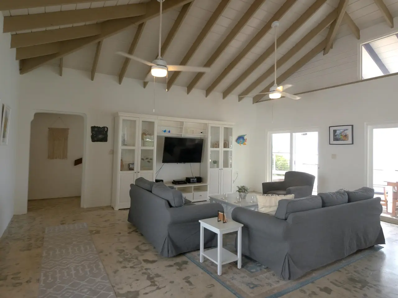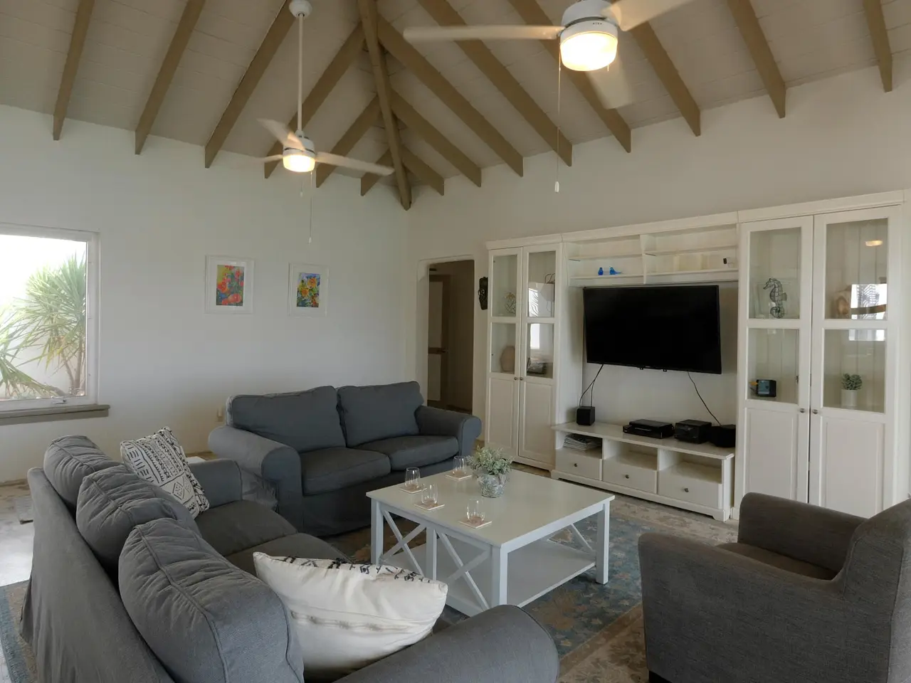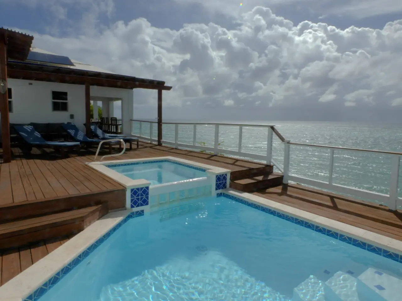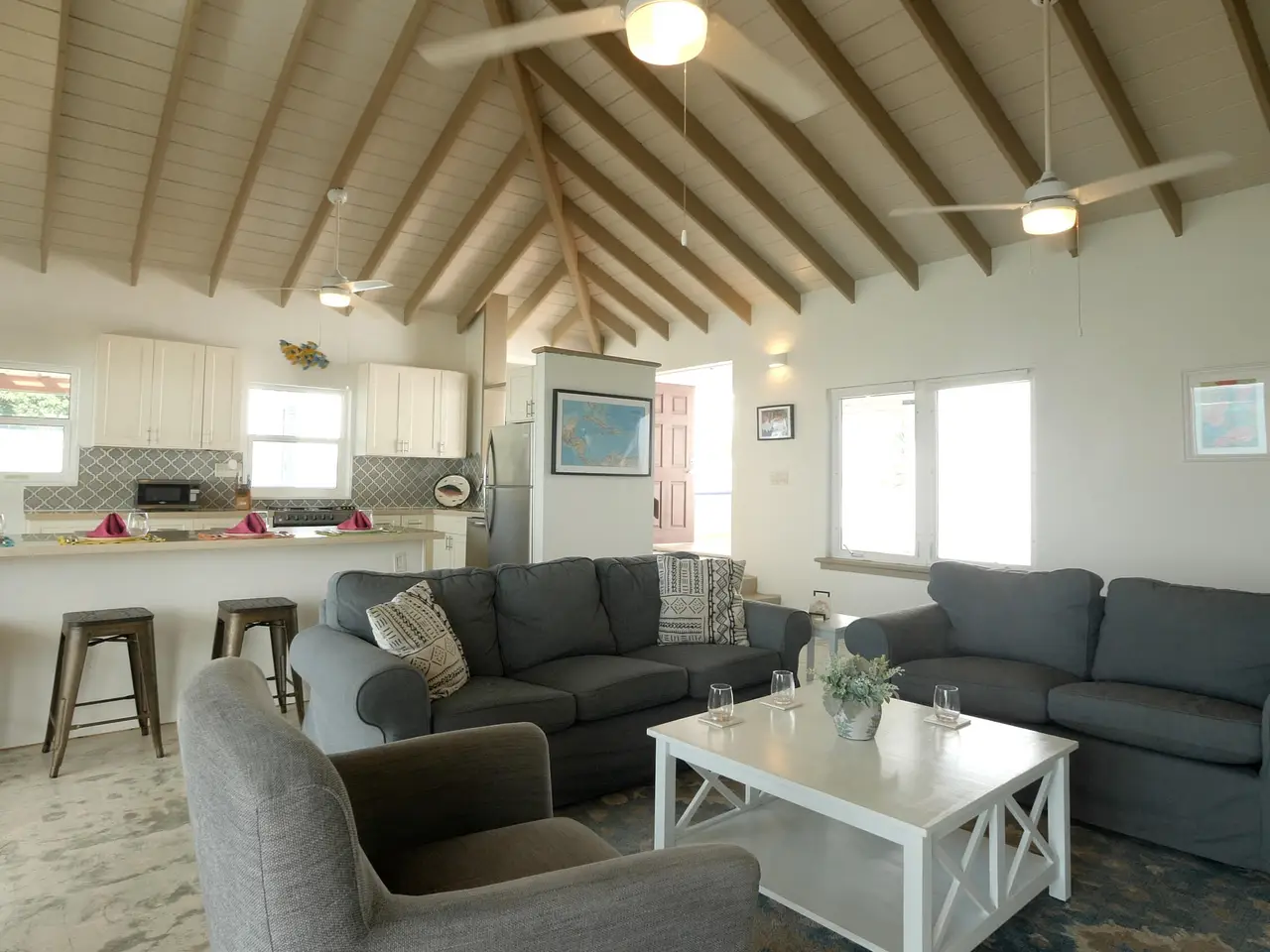 'Pelican Perch is lovelier than the photos online show...the villa is beautiful! More than that, waking up every morning to the sounds of the surf, sipping coffee out on the deck while watching the pelicans dive for fish and the sea turtles surfacing for air was PURE MAGIC!!' ...excerpt from recent guests' VRBO review... Clean lines and an elegantly simple island-style interior await you at Pelican Perch. Anchored by a breezy or air-conditioned bedroom and bath on either side of a comfortably casual open living/dining/kitchen space with soaring ceilings. Open the full wall of glass sliding doors to incorporate the breathtaking beauty of Mother Nature with the indoors...our dramatic setting ''on the rocks'' offers endless views beyond the horizon! Two-story guest cottage is a BONUS!
