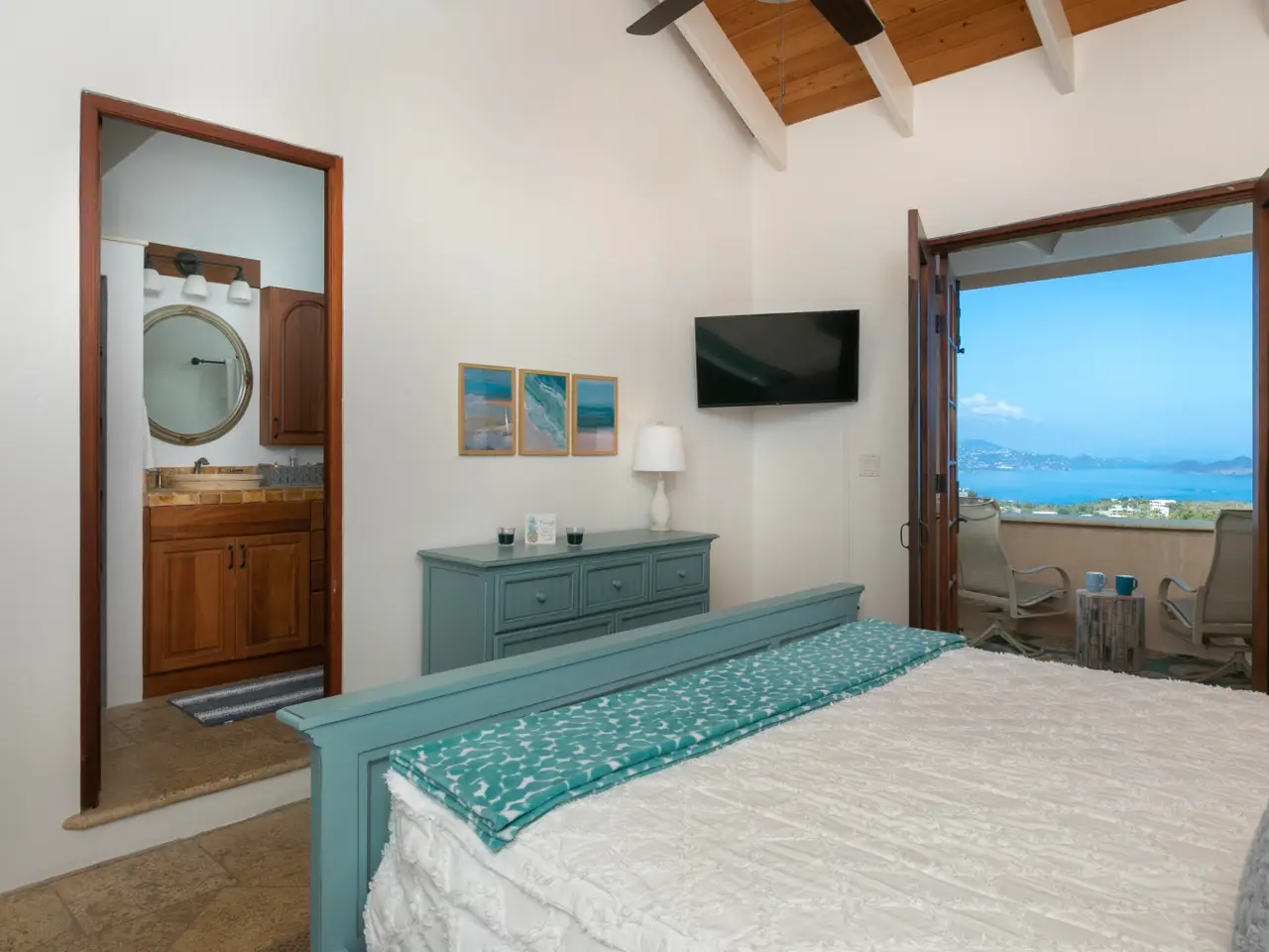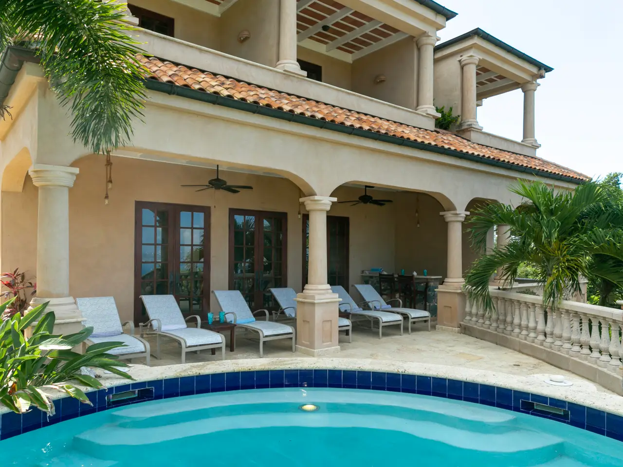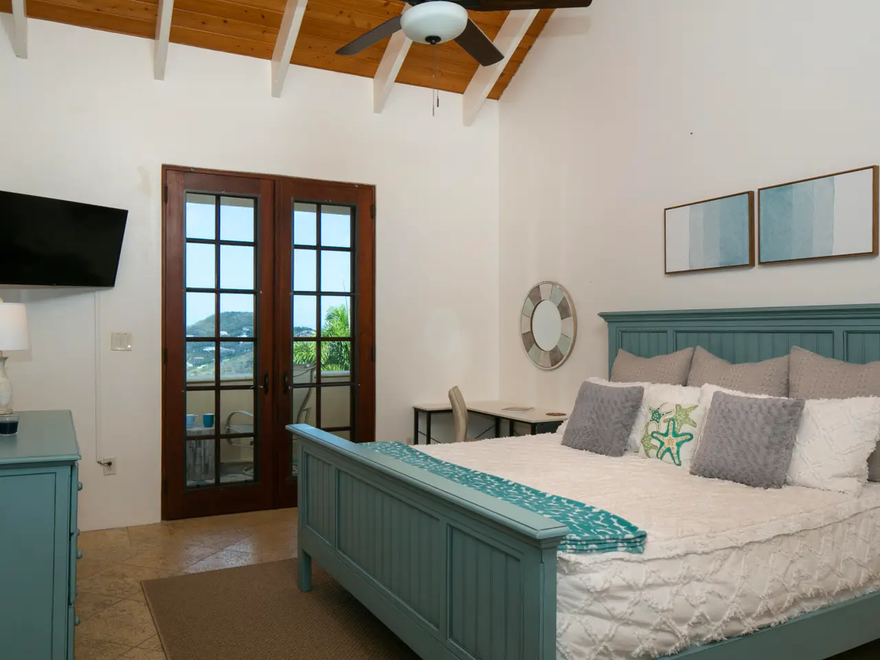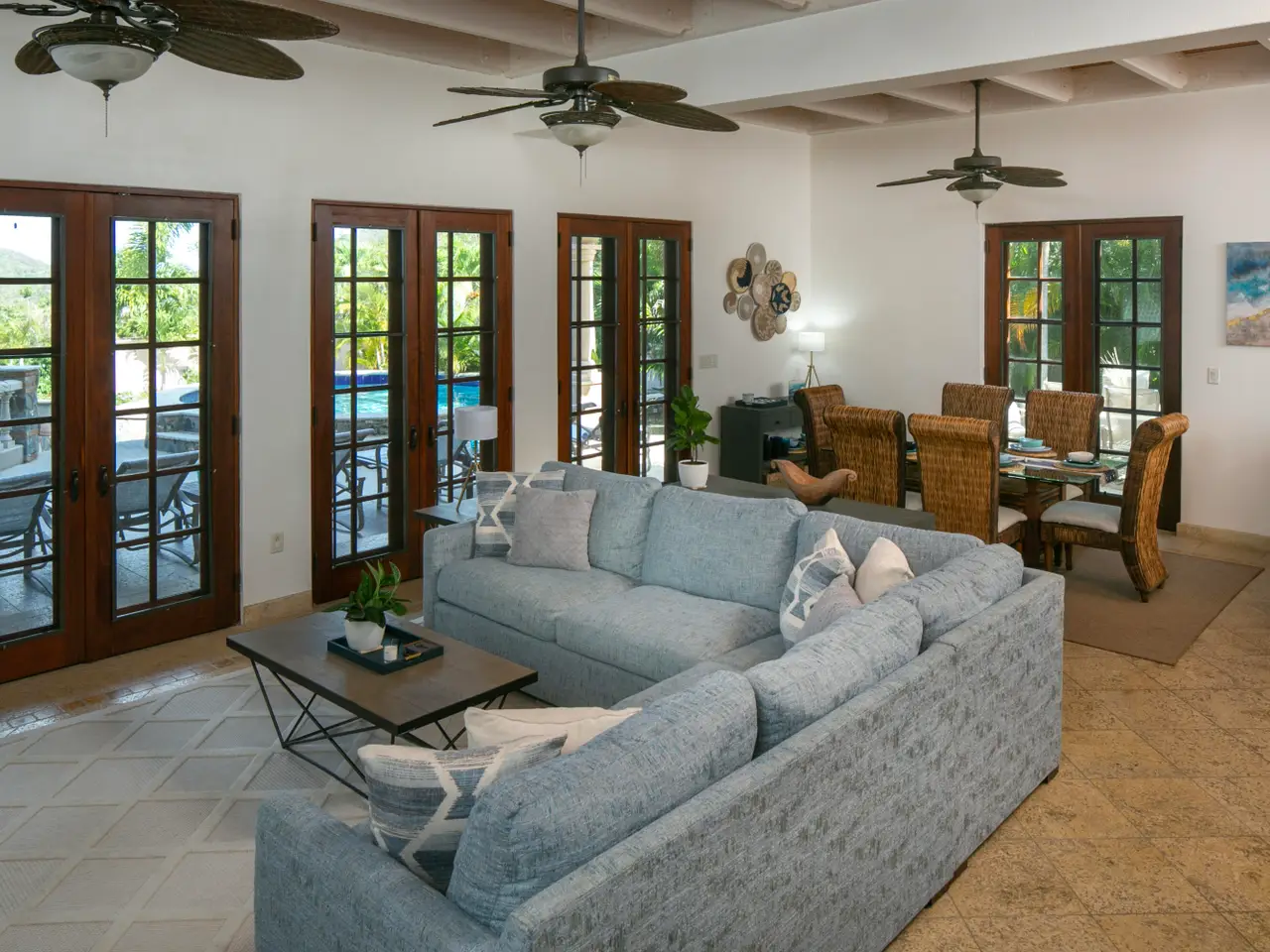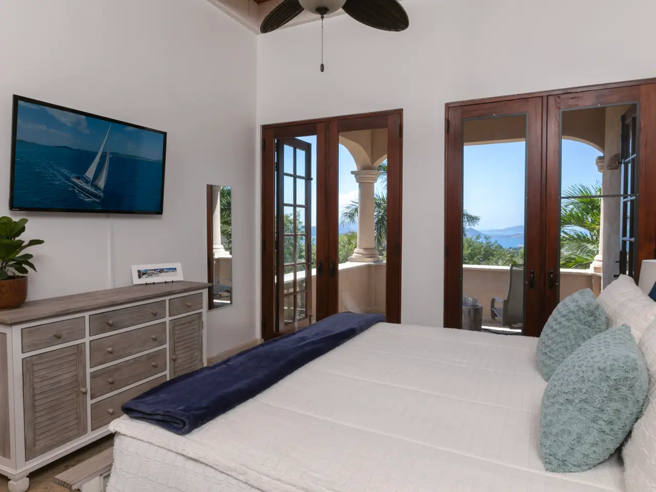Casa Sonadores, the Dreamers' House, lives up to its name. Set within the gated heights of Virgin Grande Estates and framed by sweeping south-to-west views that capture St. Croix, Pillsbury Sound, and year-round sunsets, this elegantly crafted Michael Oxman villa blends timeless Caribbean design with thoughtful modern upgrades. A private gated entry leads to a gracious courtyard and stonework details that set the tone for the home's quality. Coral stone floors, custom mahogany doors and windows, soaring 12-foot ceilings, and hand-selected architectural finishes run throughout. The main terrace features a round pool and generous outdoor dining. A true Dreamers' House--crafted with vision, enhanced with care, and ready for its next chapter.The residence offers spacious bedroom suites with King beds, private verandas, travertine-and-coral stone baths, and two outdoor showers. Below, a 1,000-sq-ft game and bunk room creates a retreat of its own with TVs, billiard tables, two sets of bunks and arcade games ideal as an extra space for fun and extra sleeping accommodation.