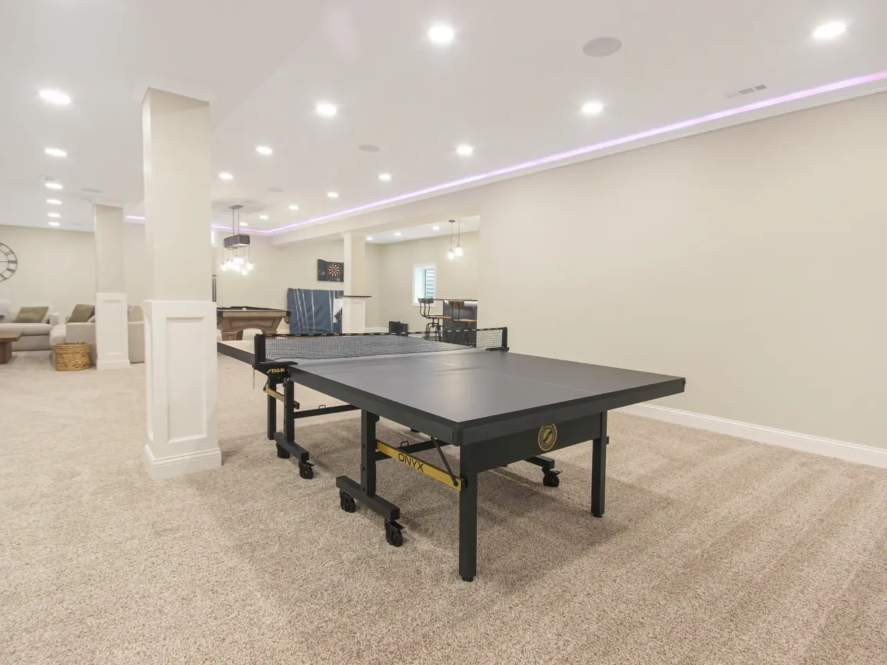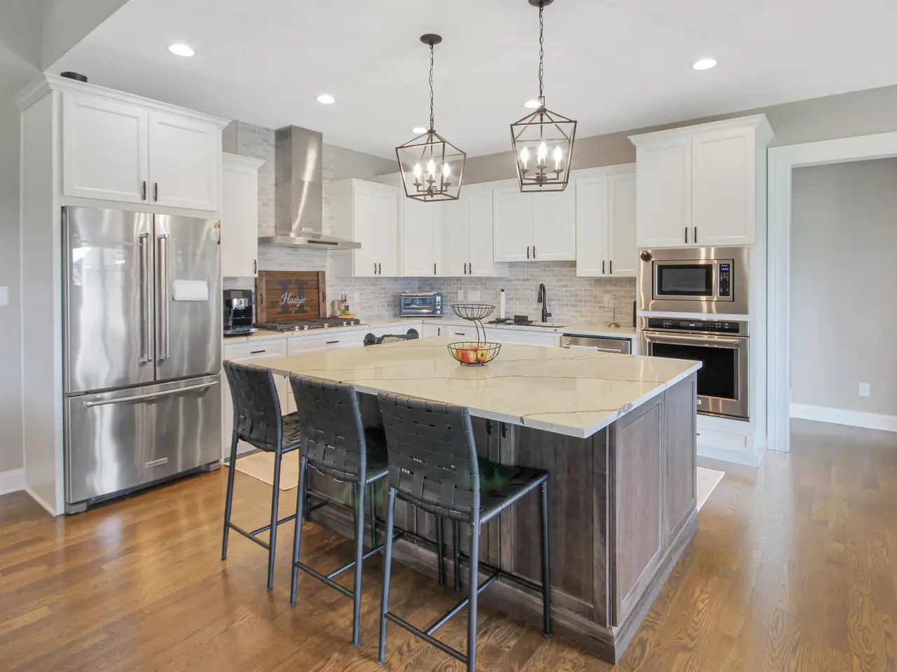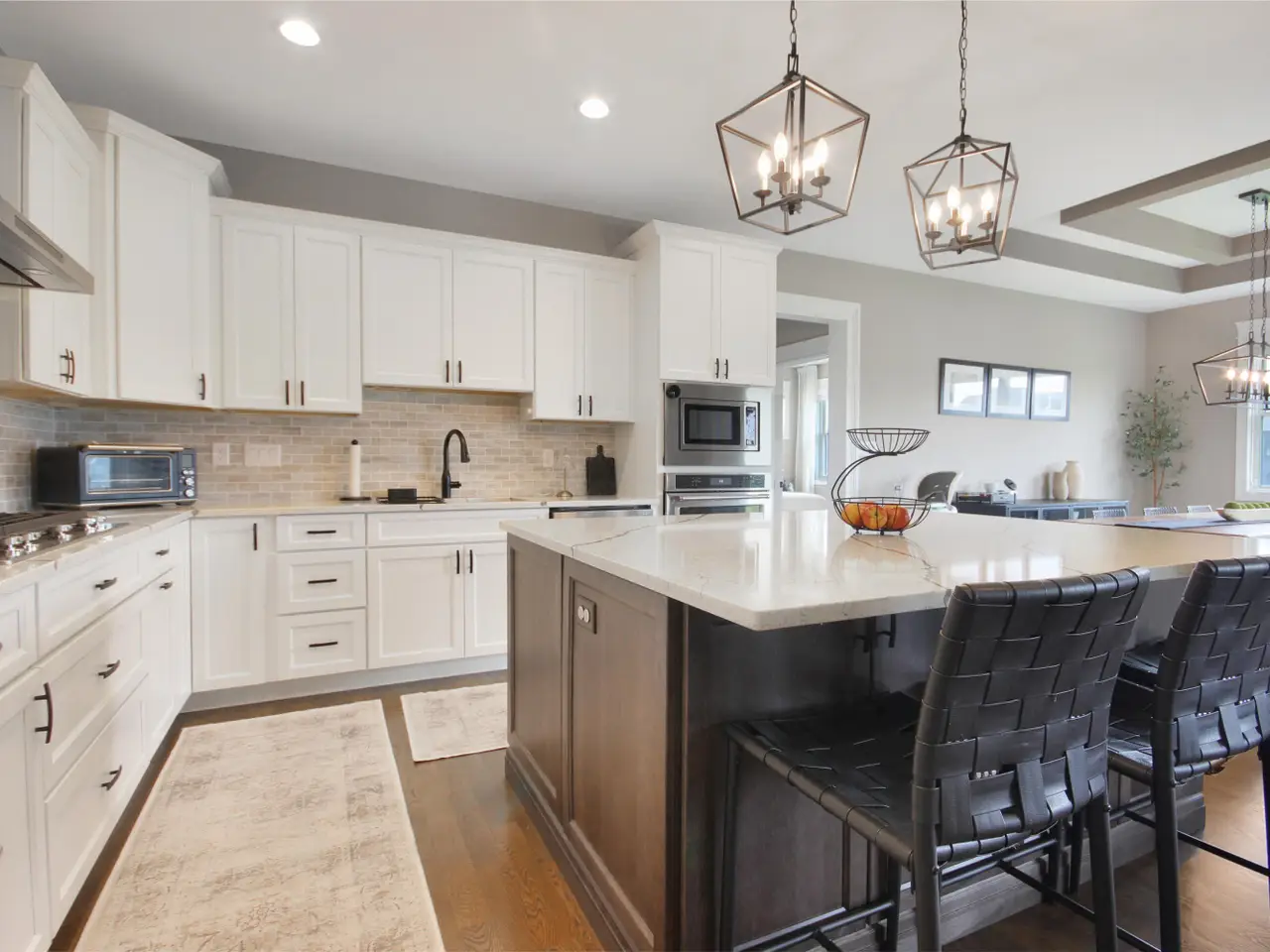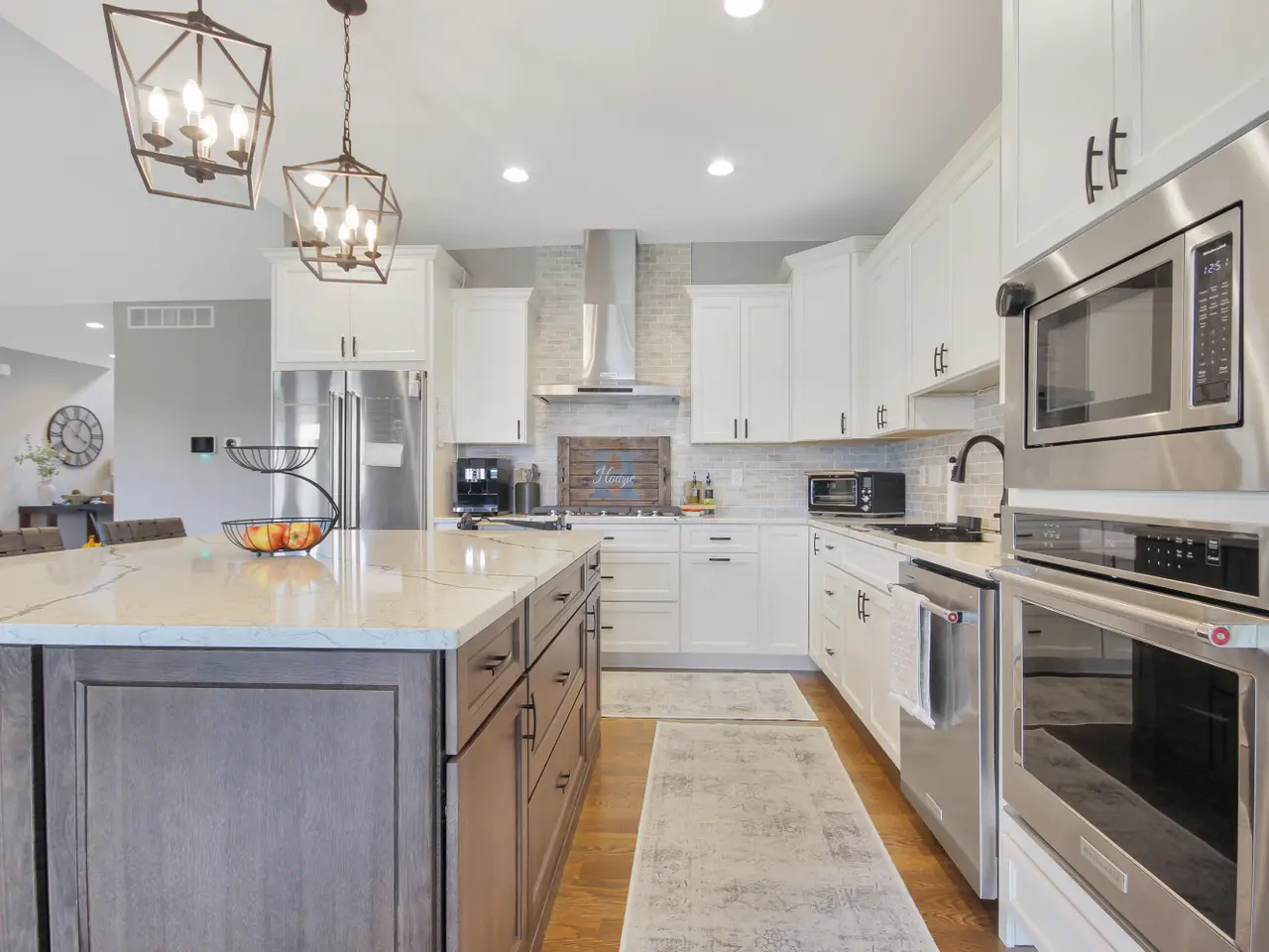 Welcome to Luxury Living in The Preserves of St. John! Discover this nearly 4,800 sq ft ranch in the desirable Preserves of St. John subdivision. Boasting an upgraded framing/thermal package, this home features 4 beds, 4 baths, and a finished 3-car garage with 2 additional storage areas. The fully finished basement offers ample entertainment, living, and storage space, along with a large custom bar area! Enjoy white oak floors throughout the main level, a 14 ft vaulted ceiling, quartz counters/island, and stainless appliances. The dining area leads to your extended covered back porch, perfect for outdoor relaxation. House is upgraded with a whole house generator, tankless water heater, and the list of upgraded features goes on. Don't miss out on this better-than-new, custom ranch!