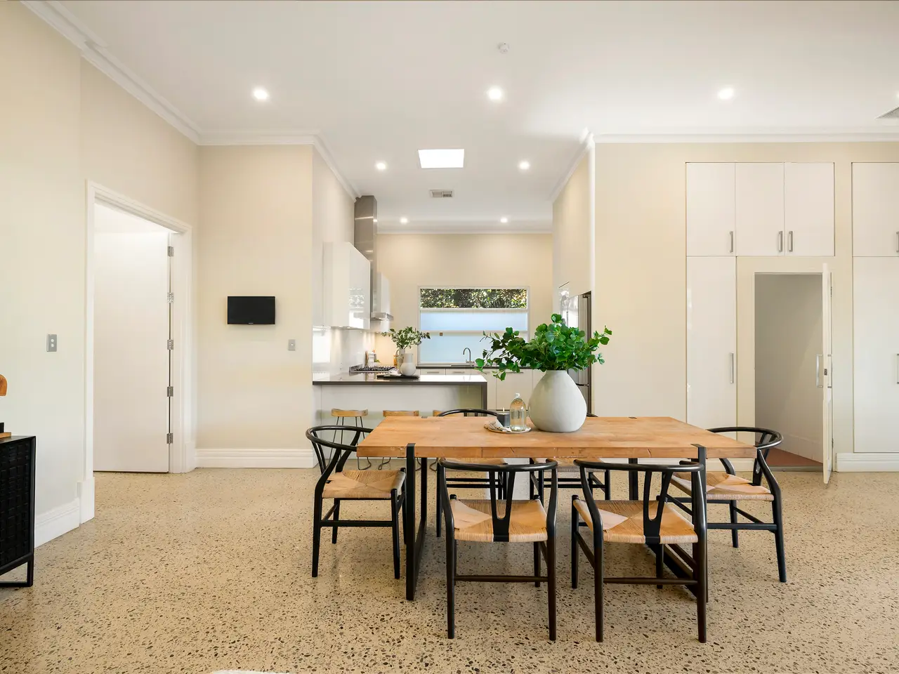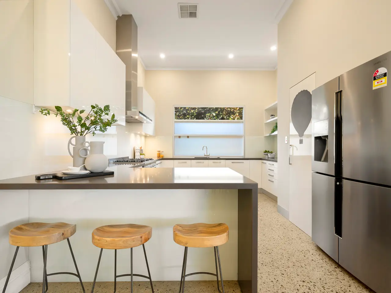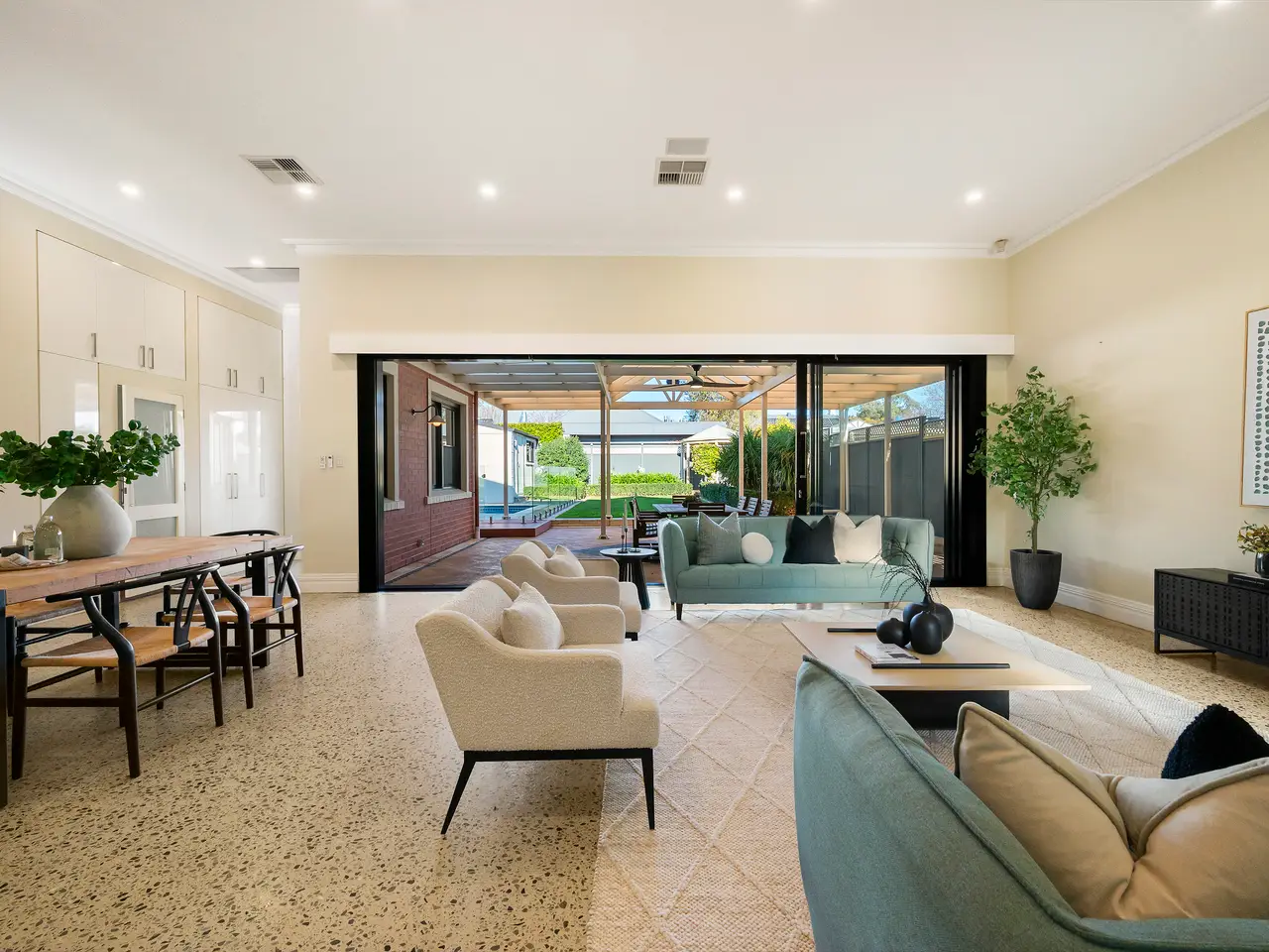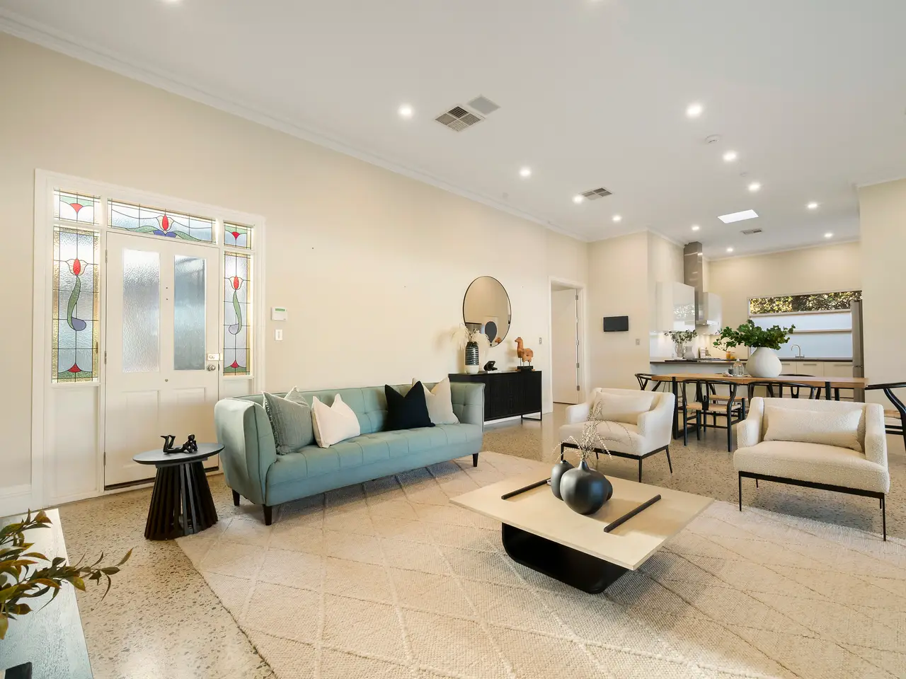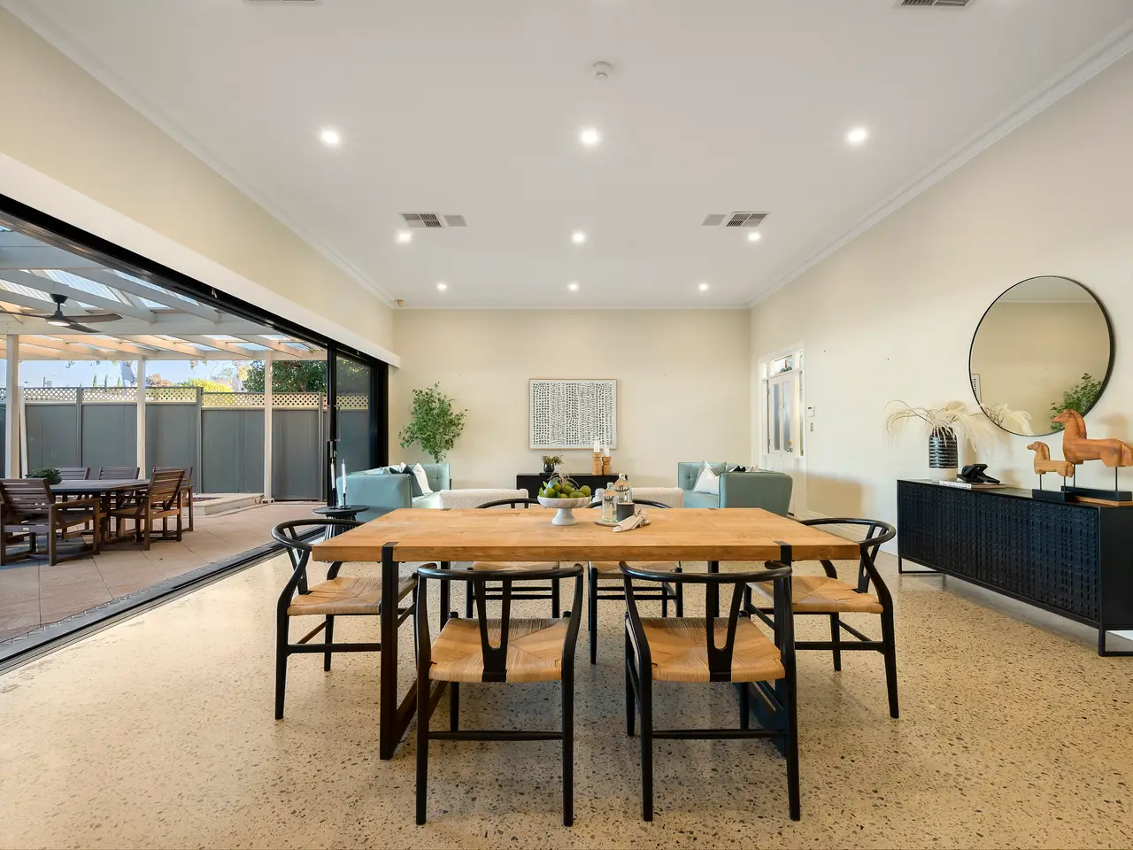 This elegant five bedroom character home is infused with modern enhancements, brimming with romantic period features, and perfectly positioned for sublime family living in prestigious St Peters. It is nestled in a beautiful city-fringe neighbourhood where luxury heritage homes line leafy streets that lead to local reserves, Linear Park, vibrant cafes and esteemed schools. Both nostalgic and noteworthy, the C.1915 sandstone facade makes a warm introduction to the extended interior where a substantial five bedroom floorplan indulges your desire for serene space, modern and functional luxury, and upmarket entertaining. The grand entry hallway, four divine bedrooms and the formal lounge present historic romance on repeat: lofty ceilings, decorative mouldings, leadlight windows and Baltic timber floorboards beautifully depicting its heritage charm. Transitioning from the original home into the open plan extension is truly sympathetic… cleverly delivering a harmonious continuance of the airy, spacious and gracious vibe that flows throughout. Polished aggregate concrete floors earmark the large living space as both rustic and chic, while the almost wall-to-wall stacking glass doors create an expansive indoor/outdoor entertainment space and offer a delightful view of the garden, pergola and pool, overlooked by the fifth bedroom or study. Home cooks will find a fantastic kitchen where stone benchtops, high quality cabinetry and premium appliances team up to support your gourmet creations, while modern luxury breezes through the 2.5 sophisticated bathrooms. - C.1915 five bedroom extended family residence on 696sqm (approx.) - Flexible floorplan with five bedrooms and a formal lounge - Huge open plan area with polished concrete floors, built-in speakers, seamless outdoor connection - Miele and Fisher & Paykel kitchen appliances, 900mm gas cooktop - Stone benchtops and waterfall-finished breakfast bar - 2-pac cabinetry, walk-in pantry - Three large bedrooms with built-in robes plus a rear study (also with a built-in robe) - Grand master bedroom features two walk-in robes and a modern ensuite - Luxurious main bathroom: freestanding bathtub and frameless shower - Powder room with easy poolside access - Wine cellar with built-in racks for storage - Rear lane access to a garage/workshop - Front entry to the double length carport with direct access to the living area - Salt chlorinated inground swimming pool - Expansive undercover outdoor entertainment area - Solar panels and 13.5 kWh Tesla battery - 5 CCTV cameras - Close to the Avenues and Marden Shopping Centres - Proximity to Linear Park, St Peters Bakehouse, Royston Park Cafe - Moments from St Peters College and Wilderness School - Within walking distance to The Avenues and in close proximity to Norwood Parade, Burnside Shopping Centre and the Adelaide City - Zoned East Adelaide School and Marryatville High School RLA 285309
