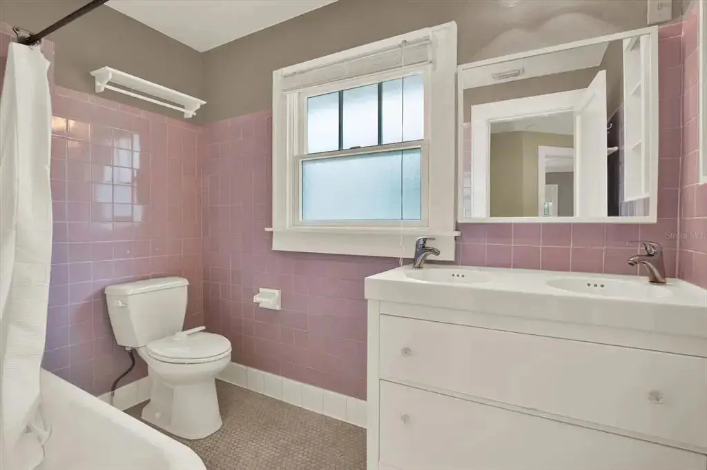 Original vintage pink tile and white mosaic marble floor