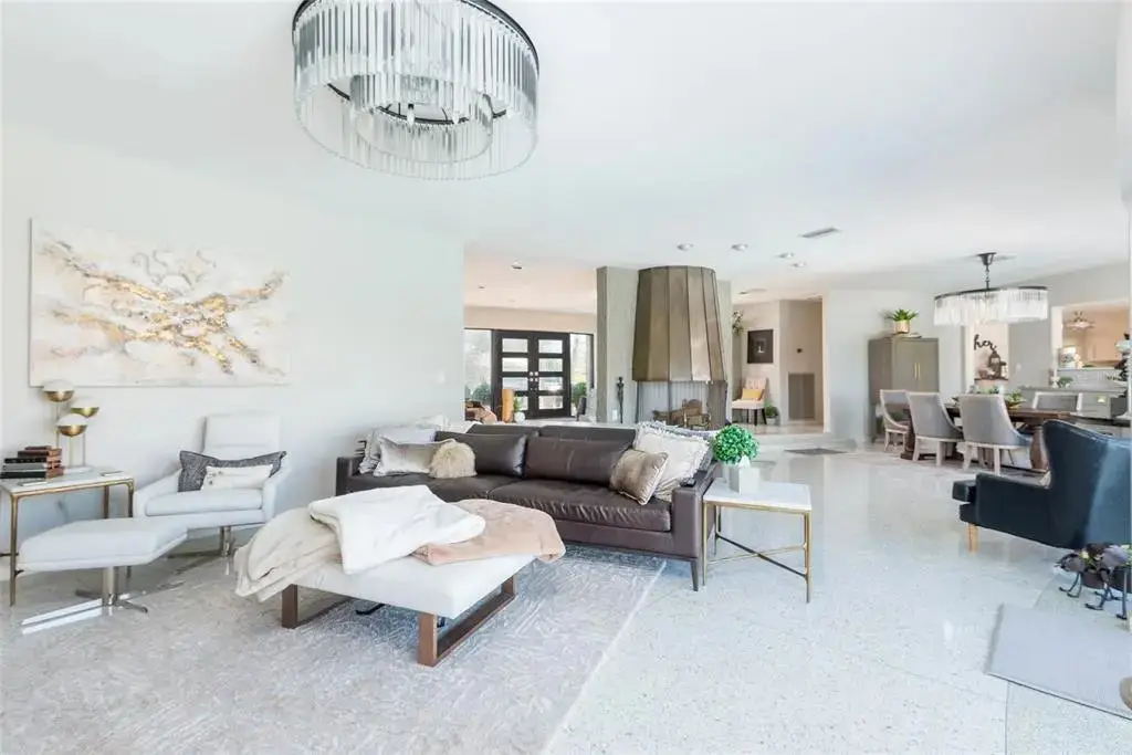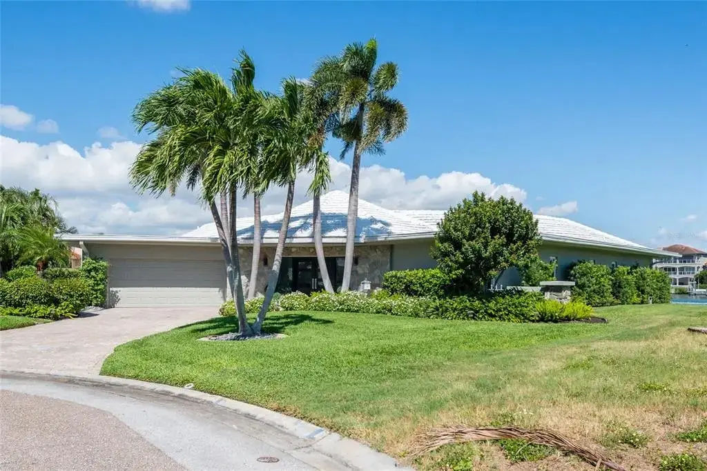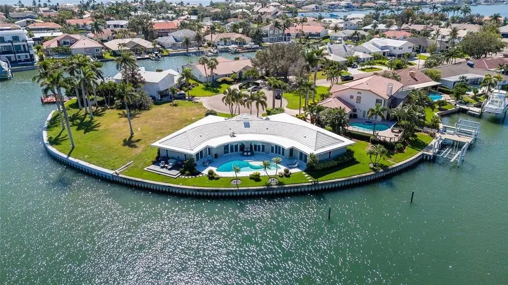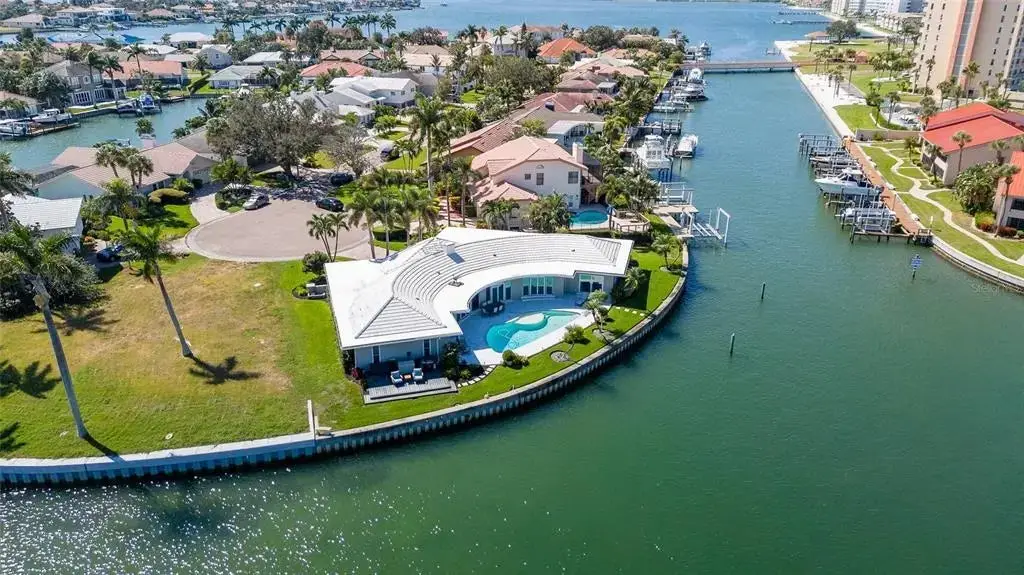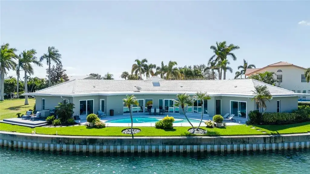 Welcome to your dream waterfront oasis in the prestigious Bayway Isles, a private gated community renowned for its prime location just minutes from the stunning St. Pete Beach, Fort DeSoto Park, and vibrant downtown St. Petersburg. This exceptional mid-century modern home, originally built in 1965 and meticulously modernized over the past eight years, is perfectly positioned on one of the most sought-after homesites in the area. As you enter, you are greeted by an exquisite custom terrazzo sunrise design in the foyer, leading you into the elegant formal living and dining rooms, adorned with the same beautiful terrazzo flooring. Impact-rated sliding glass doors seamlessly connect these spaces to the pool area, offering breathtaking, unobstructed views of the expansive 165 feet of waterfront that surrounds the home. The large lot enhances the property’s appeal as does the semi-circular design of the house that maximizes natural flow and affords stunning water vistas from nearly every room. This luxurious residence features four generously sized bedrooms, each with its own attached bath for ultimate comfort and privacy. The formal living room, with its panoramic water views and original wood-burning fireplace framed by a stunning copper fluted chimney breast, serves as a perfect gathering place for family and friends. Culinary enthusiasts will appreciate the modernized kitchen, designed for both functionality and style, equipped with three ovens, an induction cooktop, and a custom range hood. A cleverly hidden pantry door leads to the laundry/mud room, adding convenience and additional storage. Off the kitchen is a large family room that affords a space to relax while still being a part of what’s happening in the kitchen. The thoughtfully designed split bedroom plan places the primary suite in a serene setting, ensuring a peaceful retreat. This spacious haven boasts sweeping water views and an opulent primary bath featuring a large steam shower, a second walk-in shower, and a standalone soaking tub. The custom-built primary closet is a dream come true, offering ample space and thoughtful organization for your wardrobe. On the opposite side of the home, three additional bedrooms, each with attached baths, provide excellent accommodations. The fourth bedroom doubles as a potential secondary suite, complete with sliding doors that open to the pool and stunning water views. It’s attached bath conveniently serves as a pool bath with a private entrance from the outdoor area. Step outside to discover a beautifully sized pool that was recently refinished, along with a pool deck perfect for relaxation and entertainment. The pool deck is shaded throughout the day for your comfort. An adjacent grilling and seating area offers additional spaces to savor the idyllic waterfront lifestyle this remarkable home provides. This luxurious property is not just a home; it’s a lifestyle waiting for you to embrace. Welcome to Bayway Isles, where your waterfront dreams come true.