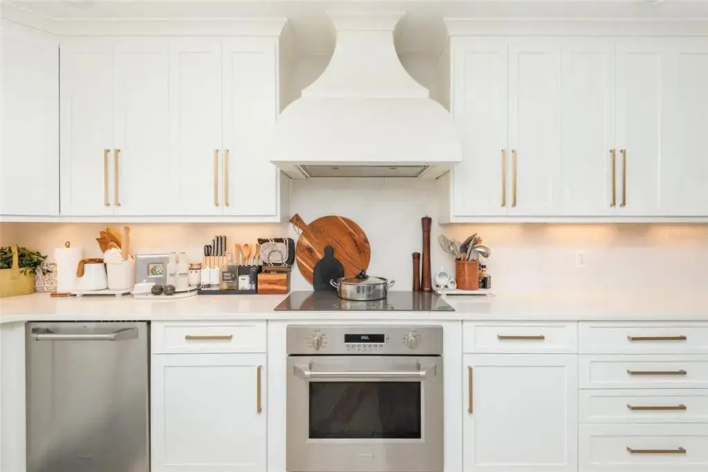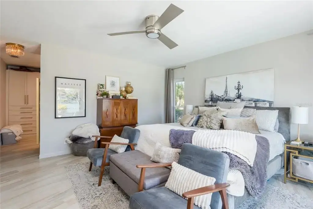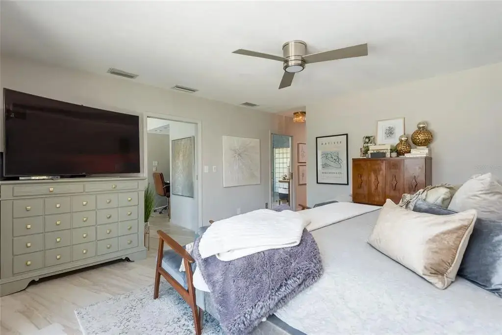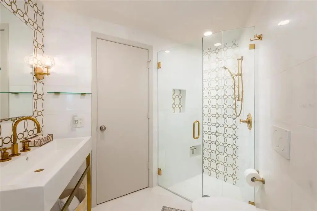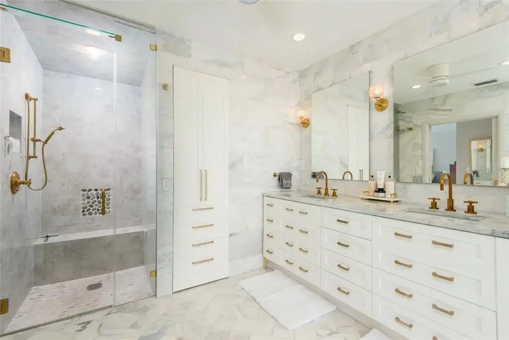 Welcome to your dream waterfront oasis in the prestigious Bayway Isles, a private gated community renowned for its prime location just minutes from the stunning St. Pete Beach, Fort DeSoto Park, and vibrant downtown St. Petersburg. This exceptional mid-century modern home, originally built in 1965 and meticulously modernized over the past eight years, is perfectly positioned on one of the most sought-after homesites in the area. As you enter, you are greeted by an exquisite custom terrazzo sunrise design in the foyer, leading you into the elegant formal living and dining rooms, adorned with the same beautiful terrazzo flooring. Impact-rated sliding glass doors seamlessly connect these spaces to the pool area, offering breathtaking, unobstructed views of the expansive 165 feet of waterfront that surrounds the home. The large lot enhances the property’s appeal as does the semi-circular design of the house that maximizes natural flow and affords stunning water vistas from nearly every room. This luxurious residence features four generously sized bedrooms, each with its own attached bath for ultimate comfort and privacy. The formal living room, with its panoramic water views and original wood-burning fireplace framed by a stunning copper fluted chimney breast, serves as a perfect gathering place for family and friends. Culinary enthusiasts will appreciate the modernized kitchen, designed for both functionality and style, equipped with three ovens, an induction cooktop, and a custom range hood. A cleverly hidden pantry door leads to the laundry/mud room, adding convenience and additional storage. Off the kitchen is a large family room that affords a space to relax while still being a part of what’s happening in the kitchen. The thoughtfully designed split bedroom plan places the primary suite in a serene setting, ensuring a peaceful retreat. This spacious haven boasts sweeping water views and an opulent primary bath featuring a large steam shower, a second walk-in shower, and a standalone soaking tub. The custom-built primary closet is a dream come true, offering ample space and thoughtful organization for your wardrobe. On the opposite side of the home, three additional bedrooms, each with attached baths, provide excellent accommodations. The fourth bedroom doubles as a potential secondary suite, complete with sliding doors that open to the pool and stunning water views. It’s attached bath conveniently serves as a pool bath with a private entrance from the outdoor area. Step outside to discover a beautifully sized pool that was recently refinished, along with a pool deck perfect for relaxation and entertainment. The pool deck is shaded throughout the day for your comfort. An adjacent grilling and seating area offers additional spaces to savor the idyllic waterfront lifestyle this remarkable home provides. This luxurious property is not just a home; it’s a lifestyle waiting for you to embrace. Welcome to Bayway Isles, where your waterfront dreams come true.