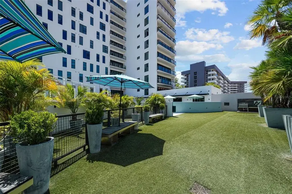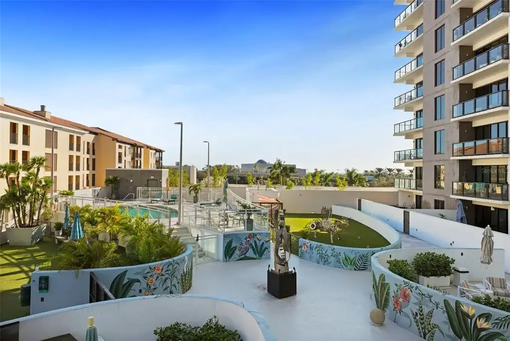 *** One of a Kind Condo *** This home offers a very special opportunity, the ease of metropolitan condo living with the feel of a gorgeous backyard. Truly one of a kind at the Salvador and perhaps in all of St Pete, this home offers a 1000+ SF terrace covered in artificial turf that's made with heat-reflective technology, providing a cool, maintenance free area for dining and relaxing outdoors. The terrace overlooks the 3rd floor amenities deck, downtown, the Dali museum, and Tampa Bay. An open floor plan with the Kitchen, Dining, and Living rooms all overlooking the terrace through floor to ceiling windows provide a most elegant space to entertain, in and out of doors. This condo sets out from the rest of the building and therefore has no adjacent units next to it, providing the ultimate in privacy. Engineered hardwood floors flow throughout the 1555sf of this home. A large, open, contemporary kitchen with Quartz countertops, Bosch appliances, Gas Range, and Wine Cooler has abundant natural light. The living room features a built-in entertainment center with an additional beverage cooler and motorized blinds. The primary bedroom with an oversized walk-in closet, is en-suite with a deep soak tub, dual sinks, and large shower. The guest bath has a tub/shower with shower door and both bedrooms have tall windows with blackout shades. The home has two parking spaces and a climate-controlled storage unit. The Salvador, a LEEDS certified green 74 unit building has great amenities in a saltwater pool, spa, state-of-the-art fitness center, social room, grilling station, gated dog park with dog washing station, sculpture garden and outdoor fire pit area. Concierge and on-site management are convenient features for the owners. All located within easy access to all that downtown living offers and yet, located in a quiet part of town when you’re ready to wind down. Call for your private tour of this exquisite and unique home.