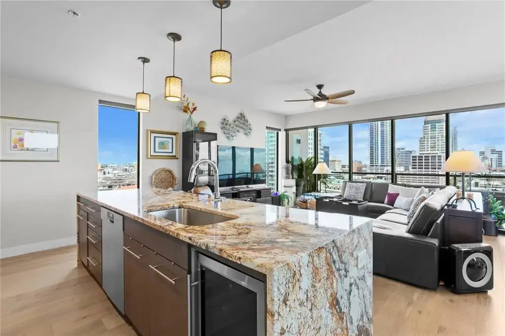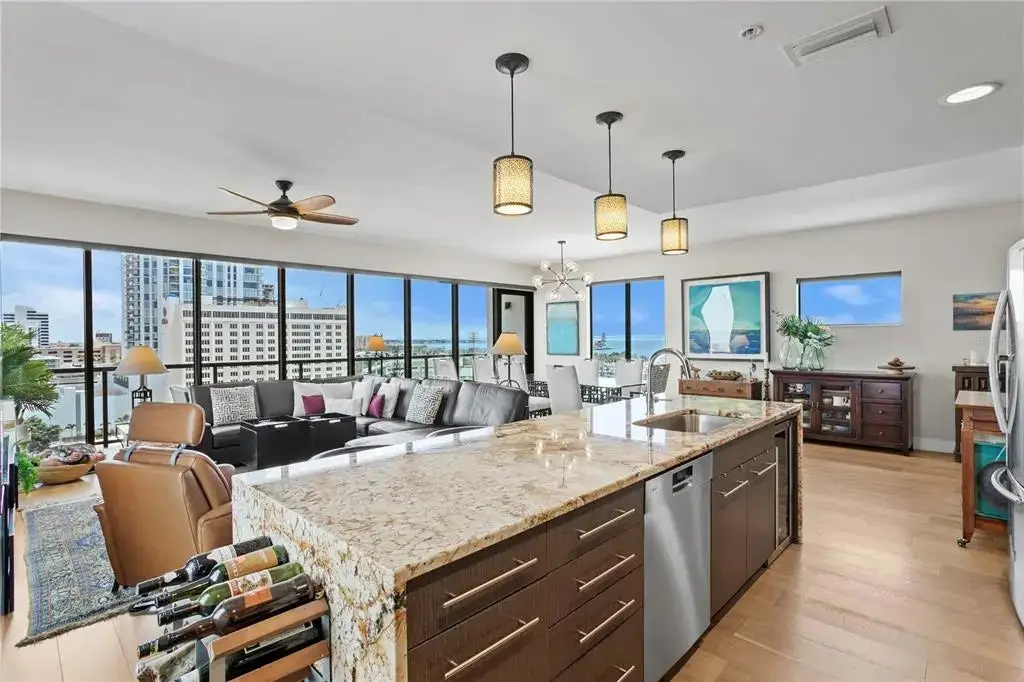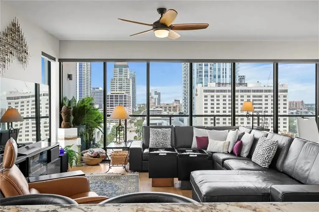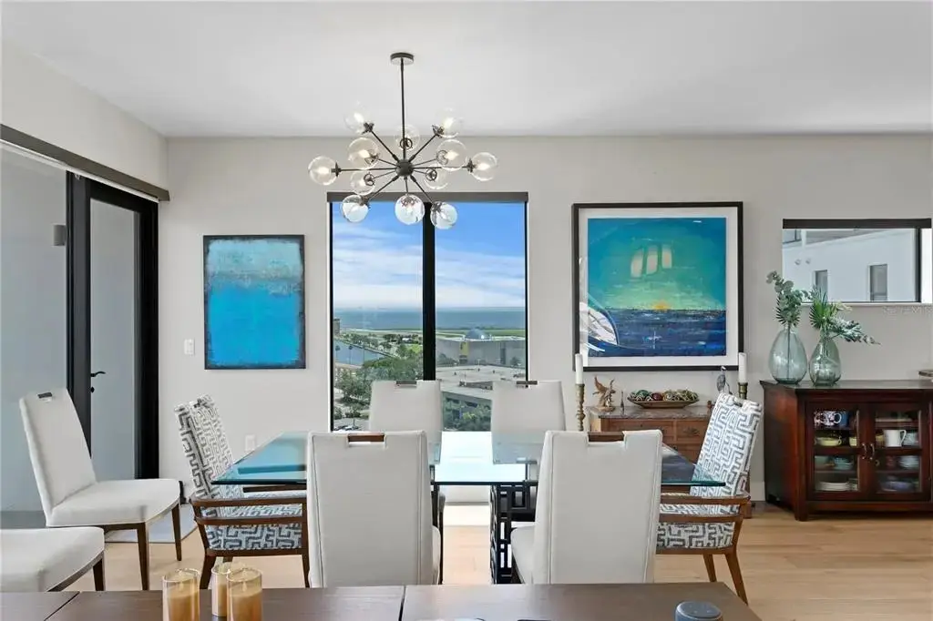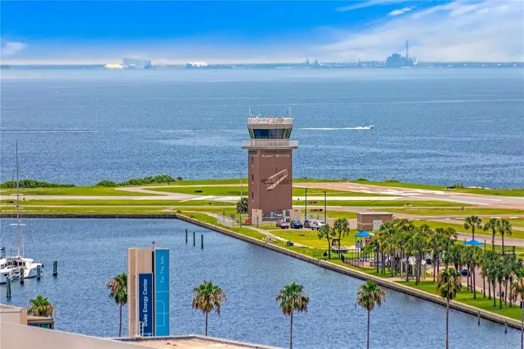Experience breathtaking, sweeping views of downtown St. Pete, the Pier, Tampa Bay, the Dali Museum, and Albert Whitted Airport from the 12th-floor balcony of this spacious residence at The Salvador. A welcoming Gallery entry sets the tone, offering space for artwork, artistic expression and a direct line of sight to the stunning vistas beyond. This 1,555 sq. ft., 2-bedroom, 2-bath home features a unique open floor plan with windows on three sides—ensuring abundant natural light, dramatic views, and complete privacy with no adjacent units. The expansive living and dining areas are framed by floor-to-ceiling windows, with motorized blackout shades on the East and West exposures. The contemporary kitchen has been thoughtfully upgraded with custom waterfall-edge countertops, a deep single-basin sink with modern faucet, natural gas range, Samsung 28 cu. ft. French door refrigerator with food showcase panel and filtered ice/water, and a wine cooler. Design upgrades continue throughout: premium sinks and Moen faucets in both bathrooms, Cat 6 wiring from a centralized Ethernet switch, and sunshade blinds in both bedrooms, double-hung with blackout layers. The primary suite features a generous walk-in closet and a spa-inspired bath with a deep soaking tub, a large walk-in shower with a custom glass enclosure, dual Moen fixtures (rainhead and handheld), each with individual thermostatic controls, and a dual-sink vanity. The guest bedroom includes a custom queen-size Murphy Bed with swinging bookshelf doors. A laundry closet between the bedrooms includes Samsung front-loading washer and dryer with added storage. This residence includes two adjacent second-floor parking spaces and a substantial climate-controlled storage room. The Salvador, a LEED-certified building with only 74 units, offers an array of amenities including a pool and spa, a state-of-the-art fitness center, a social room, grilling area, dog park with wash station, sculpture garden, and outdoor fire pit. Concierge service and on-site management ensure effortless living in this tranquil yet centrally located oasis, just blocks from downtown attractions like the Dali Museum, Mahaffey Theater, Albert Whitted Airfield, and the vibrant Saturday Morning Market. Elevate your lifestyle with a private tour of this exceptional residence at The Salvador and discover unparalleled luxury living in the heart of St. Pete. Schedule your visit today to immerse yourself in this unparalleled blend of privacy, luxury, and location.