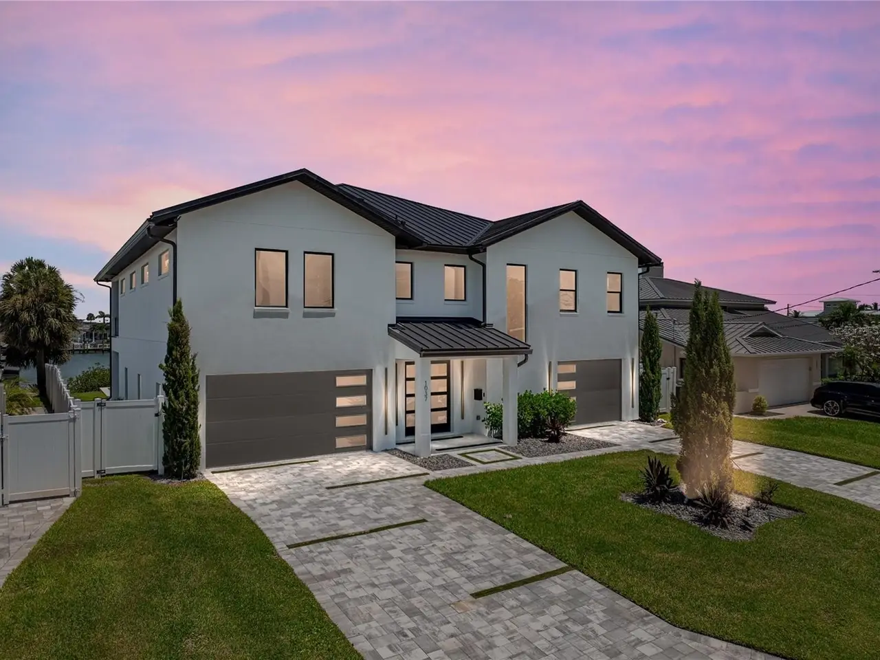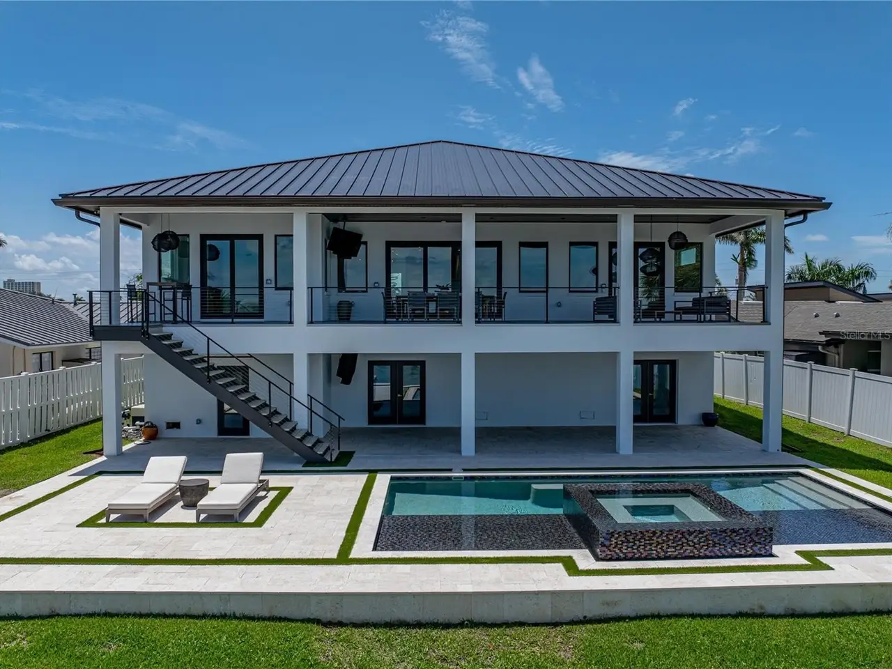 Timeless clean line architecture meets luxury waterfront contemporary Italian design with this 2022 custom built home in the charming community of Yacht Club Estates. The foyer welcomes you with modern elegance, leading past a striking accent wall and a glass-enclosed wine display room toward the staircase to the main living area. The main floor offers fabulous water views with its open concept and access to the upper lanai. You’ll notice top-line finishes throughout with light-filled living spaces including a chef’s kitchen outfitted with Miele gas range/oven convection combination with upgraded range hood, Miele refrigerator, microwave drawer and under-counter beverage refrigerator. The solid wood custom cabinets pair perfectly with the expansive center island which is ideal for casual gatherings and entertaining guests. As you move through the living and dining areas the inviting lanai awaits with solid wood tongue and groove ceilings, designer lighting fixtures and views of the heated saltwater infinity edge pool/spa with over 2000 sf of exotic travertine and turf landscaping design. Steps away, the composite oversized dock boast electricity, solar uplighting and running water. The primary bedroom is a calming oasis with lovely water views, access to the lanai and large custom closet. The stunning bath area showcases a free-standing tub and enhanced double walk-in shower all elegantly designed as a spa environment. Three additional bedrooms include custom closets and designer lighting. Downstairs highlights a car collector’s dream garage with parking for up to 10 prized cars or an incredible flex activity area with French doors leading to the lower lanai with the resort style pool. The home also includes Restoration Hardware designer chandeliers and recessed lighting on dimmers throughout, separate laundry room, tankless water heaters, Sonos system w/all existing Smart TVs, battery powered BLINK camera system, irrigation system and outdoor corner motion detector security lighting. The location couldn't be better with world famous pristine beaches nearby and the vibrant downtown St Petersburg, just a 20 minute drive away, offers enticing dining, museums, entertainment experiences and professional baseball and soccer teams. This tranquil residence with its exquisite sunset views offers the ideal blend of elegance, and waterfront living for the lifestyle you desire.